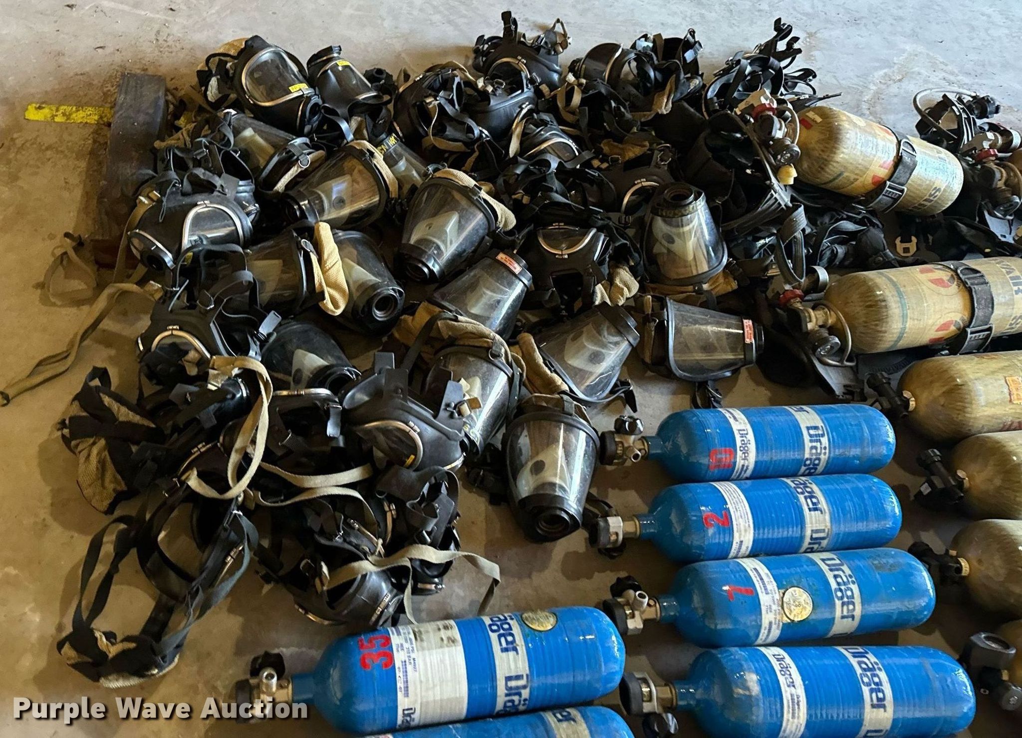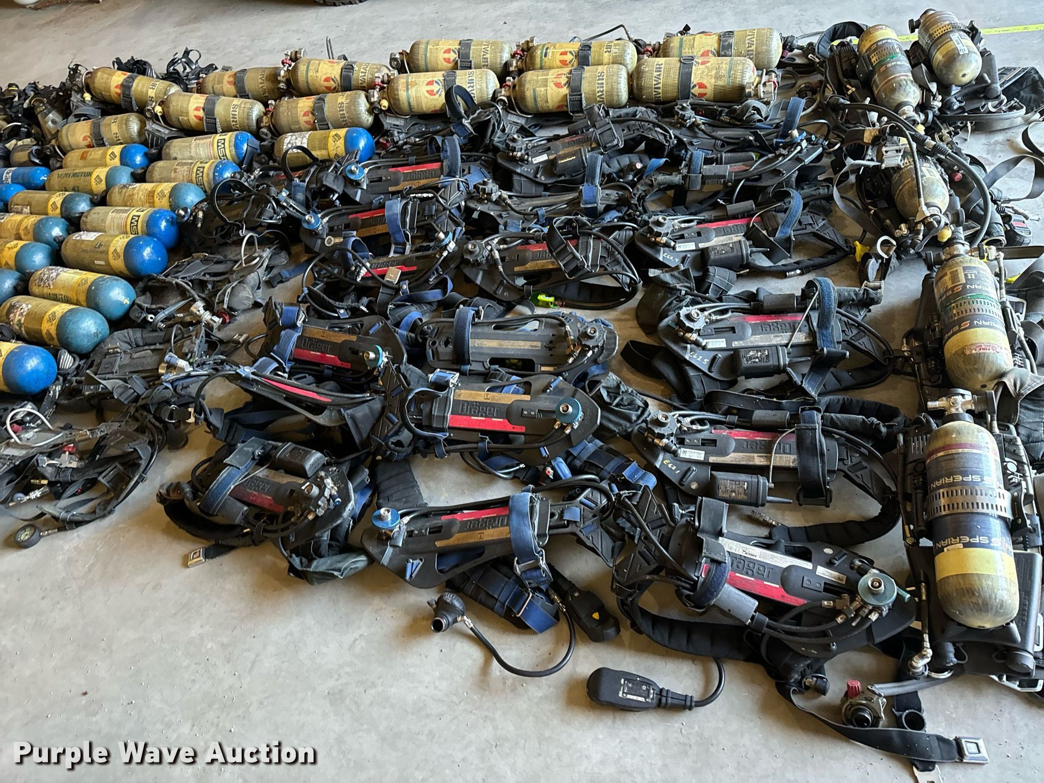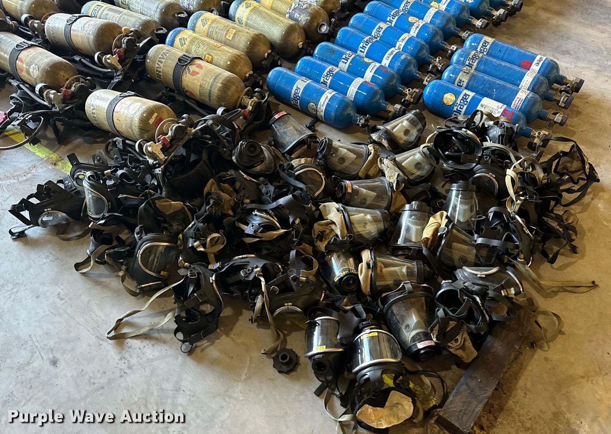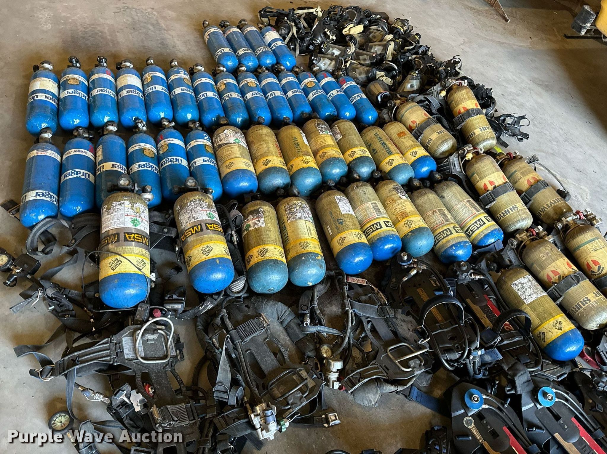 Purple Wave is selling a used Tools in Missouri. This item is a SCBA rescue equipment with the following: Approx. 58 SCBA bottles, Approx. 43 SCBA packs, Approx. 37 Masks