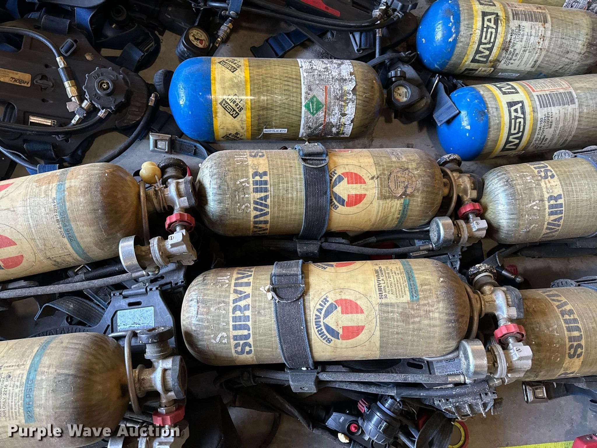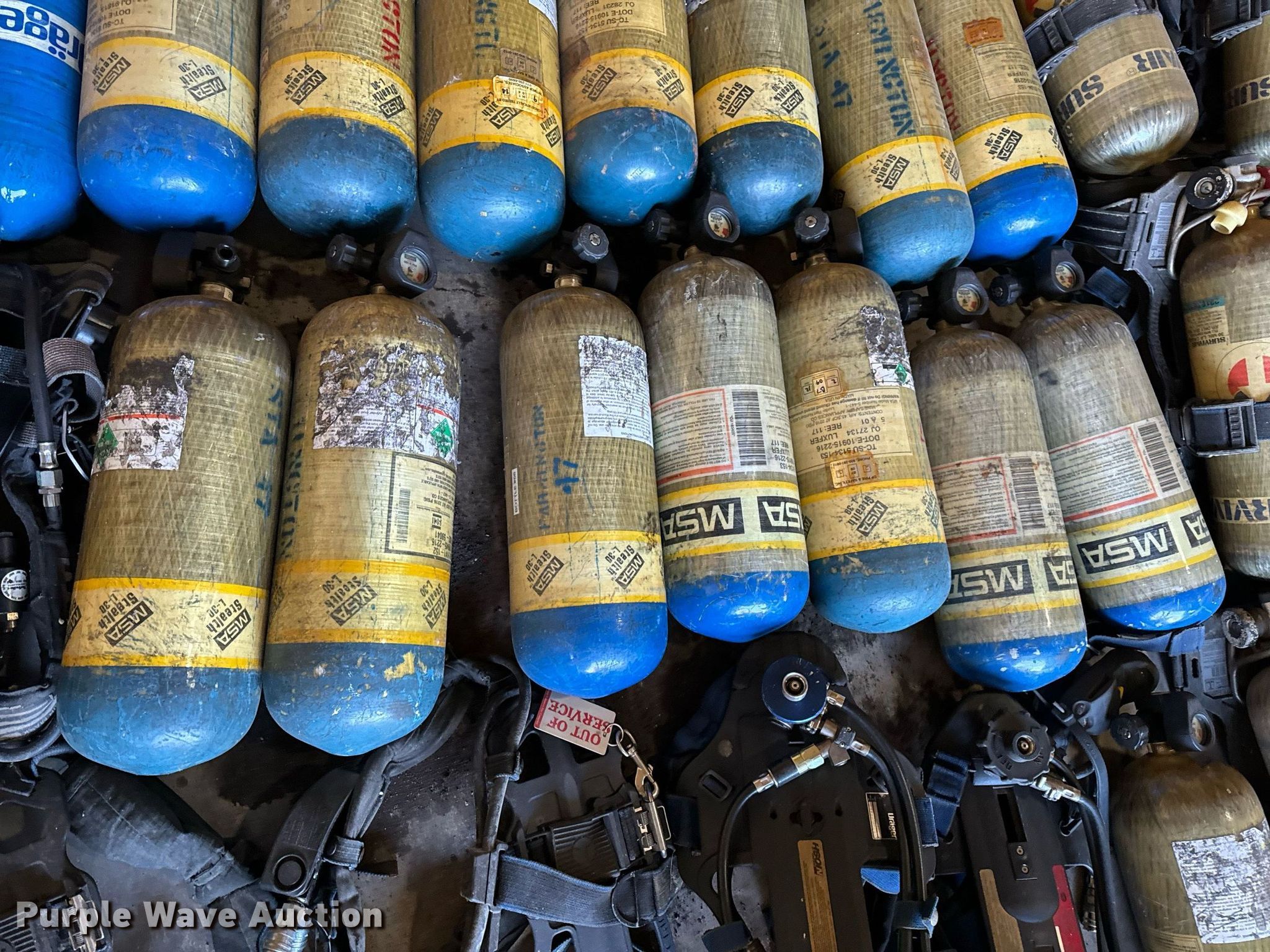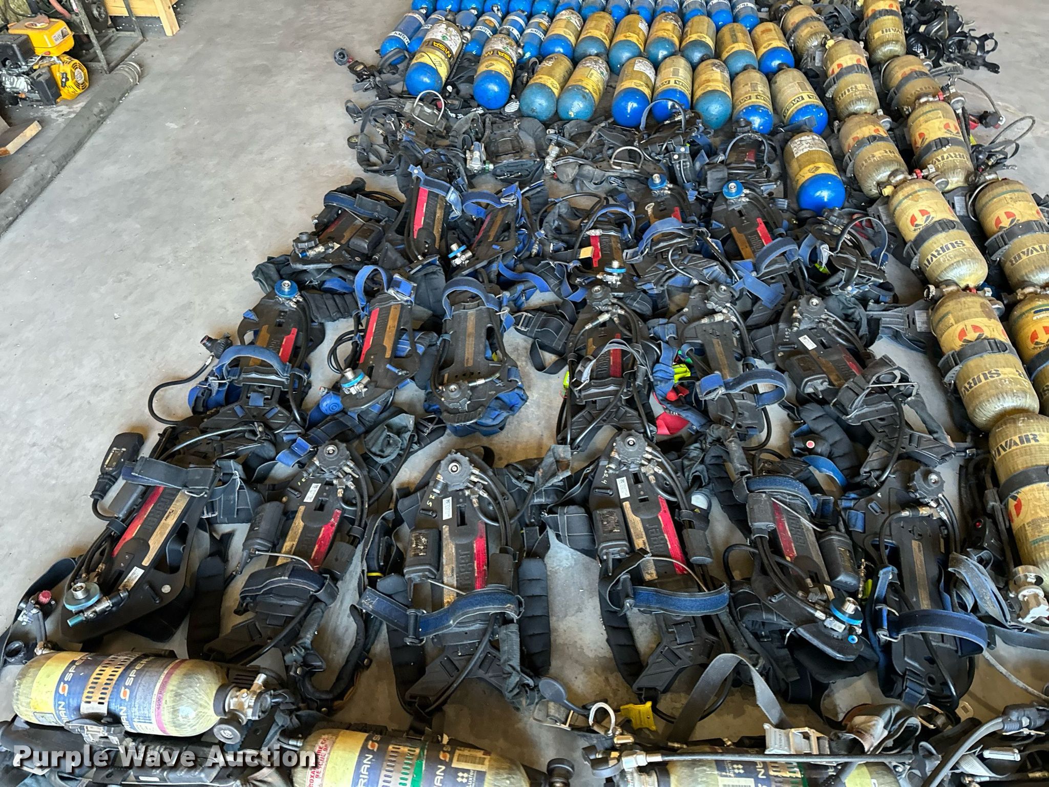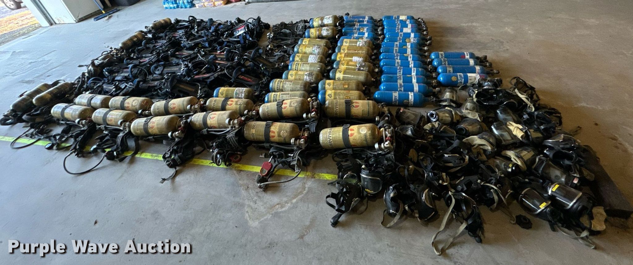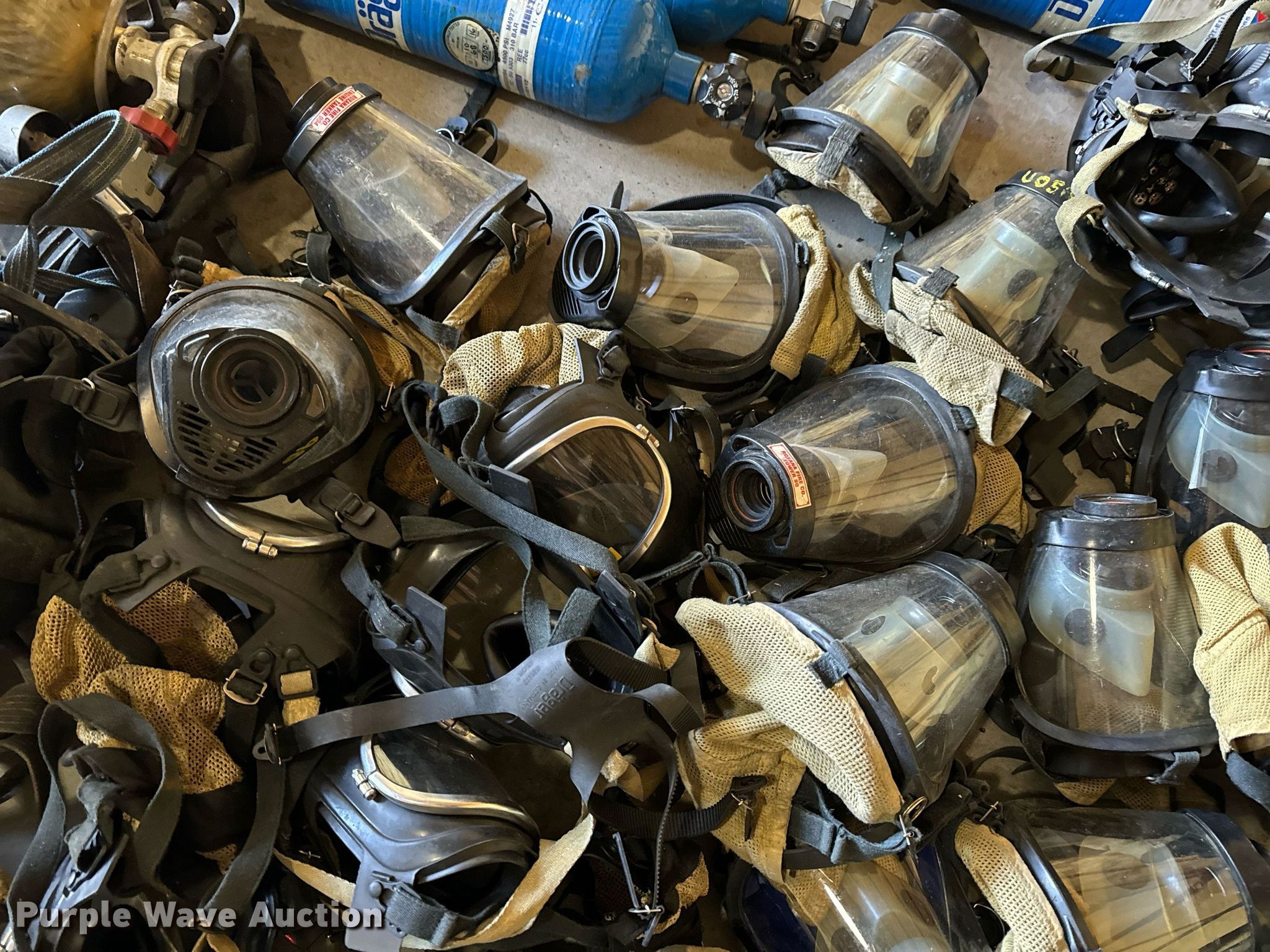 Purple Wave is selling a used Tools in Missouri. This item is a SCBA rescue equipment with the following: Approx. 58 SCBA bottles, Approx. 43 SCBA packs, Approx. 37 Masks