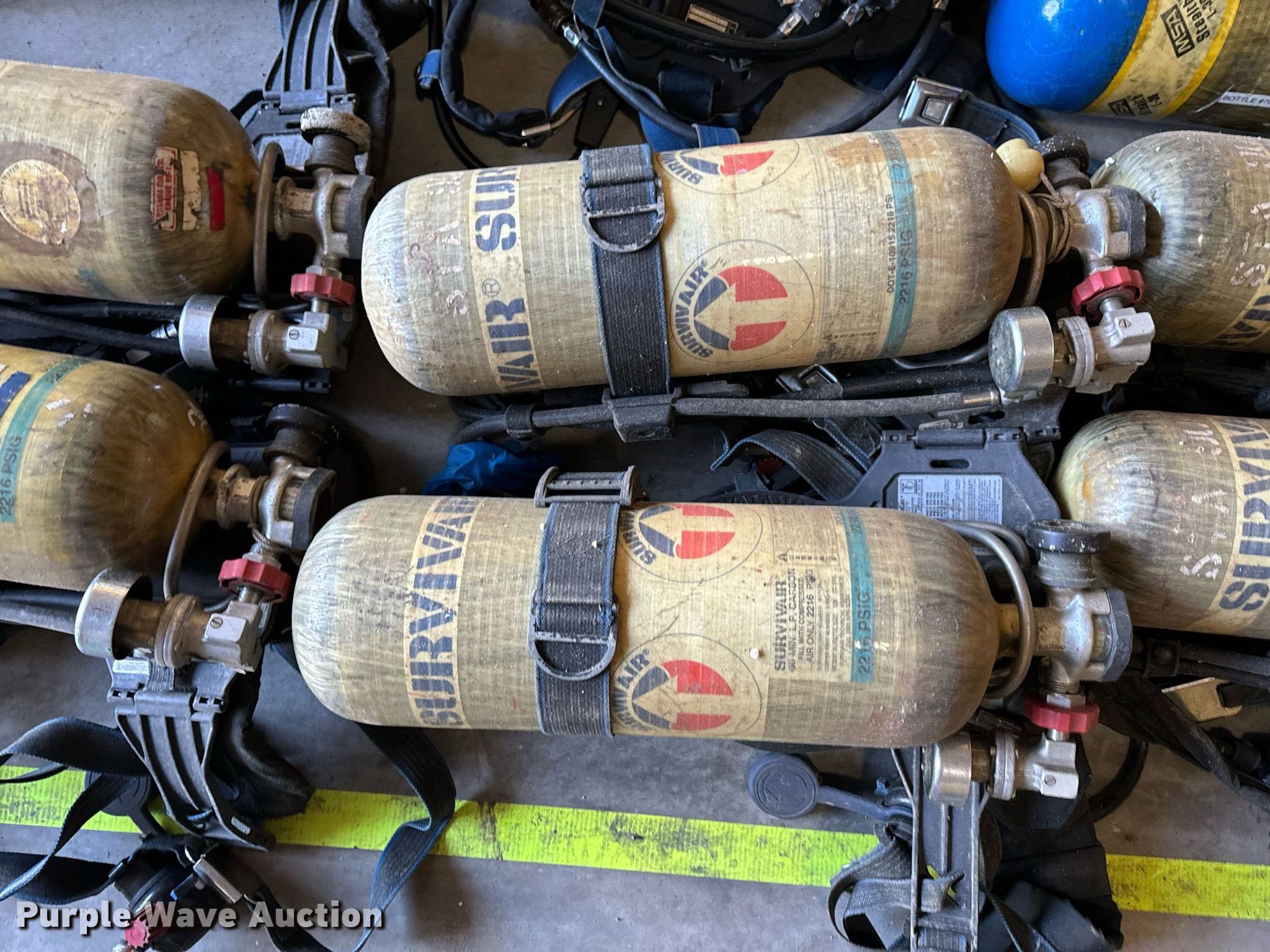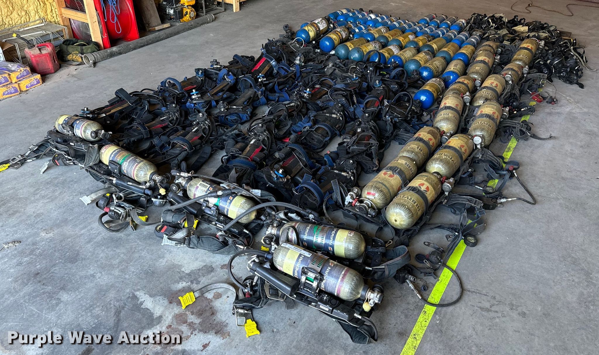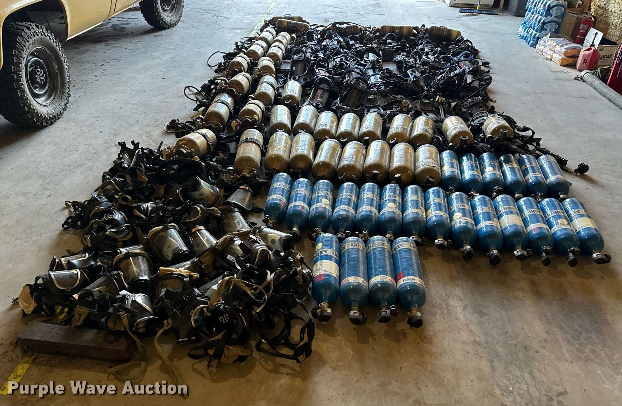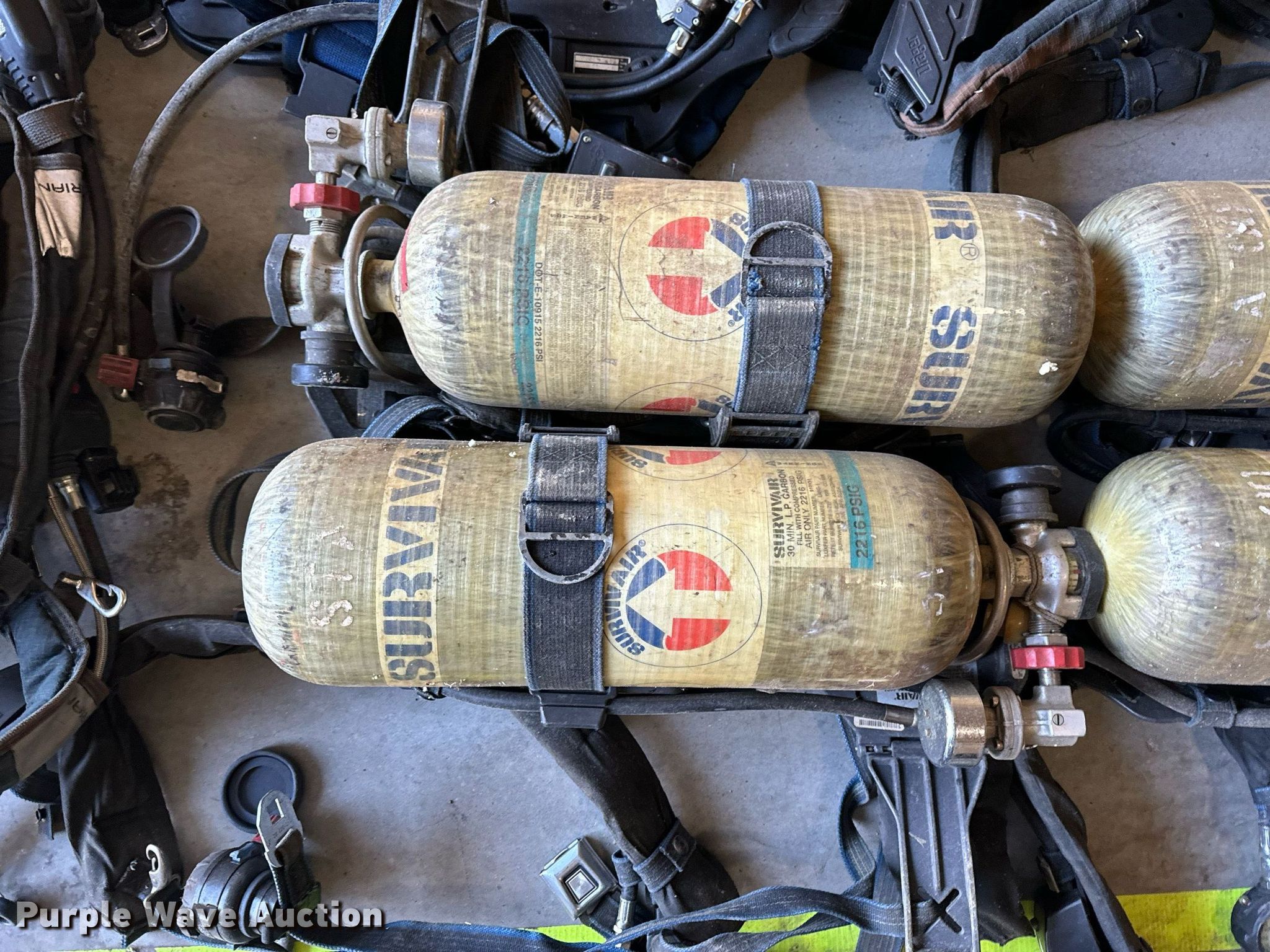 Purple Wave is selling a used Tools in Missouri. This item is a SCBA rescue equipment with the following: Approx. 58 SCBA bottles, Approx. 43 SCBA packs, Approx. 37 Masks
