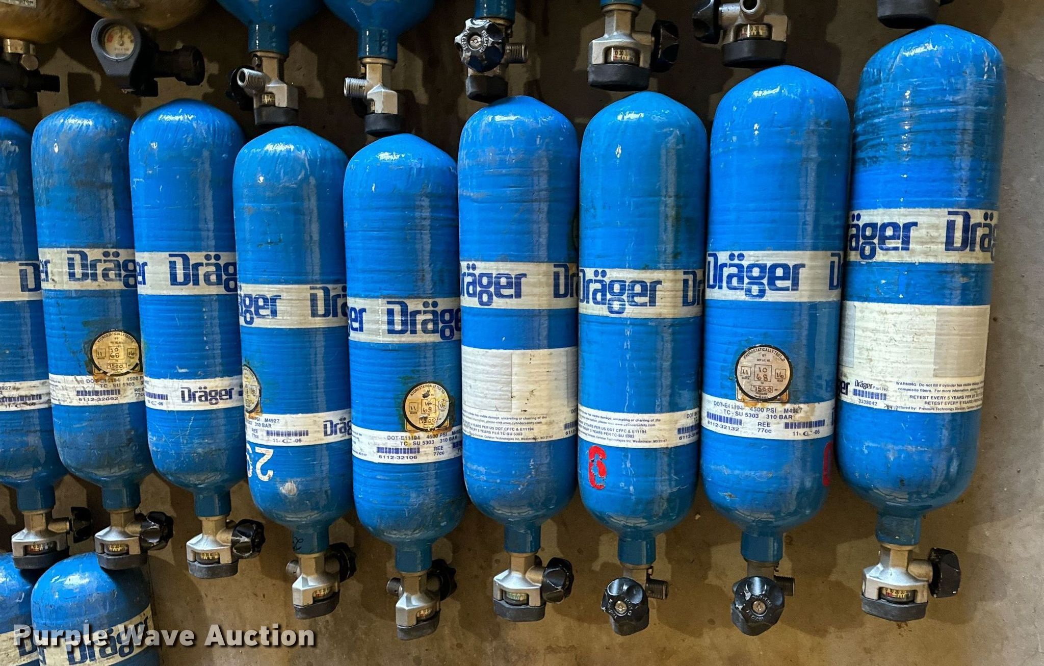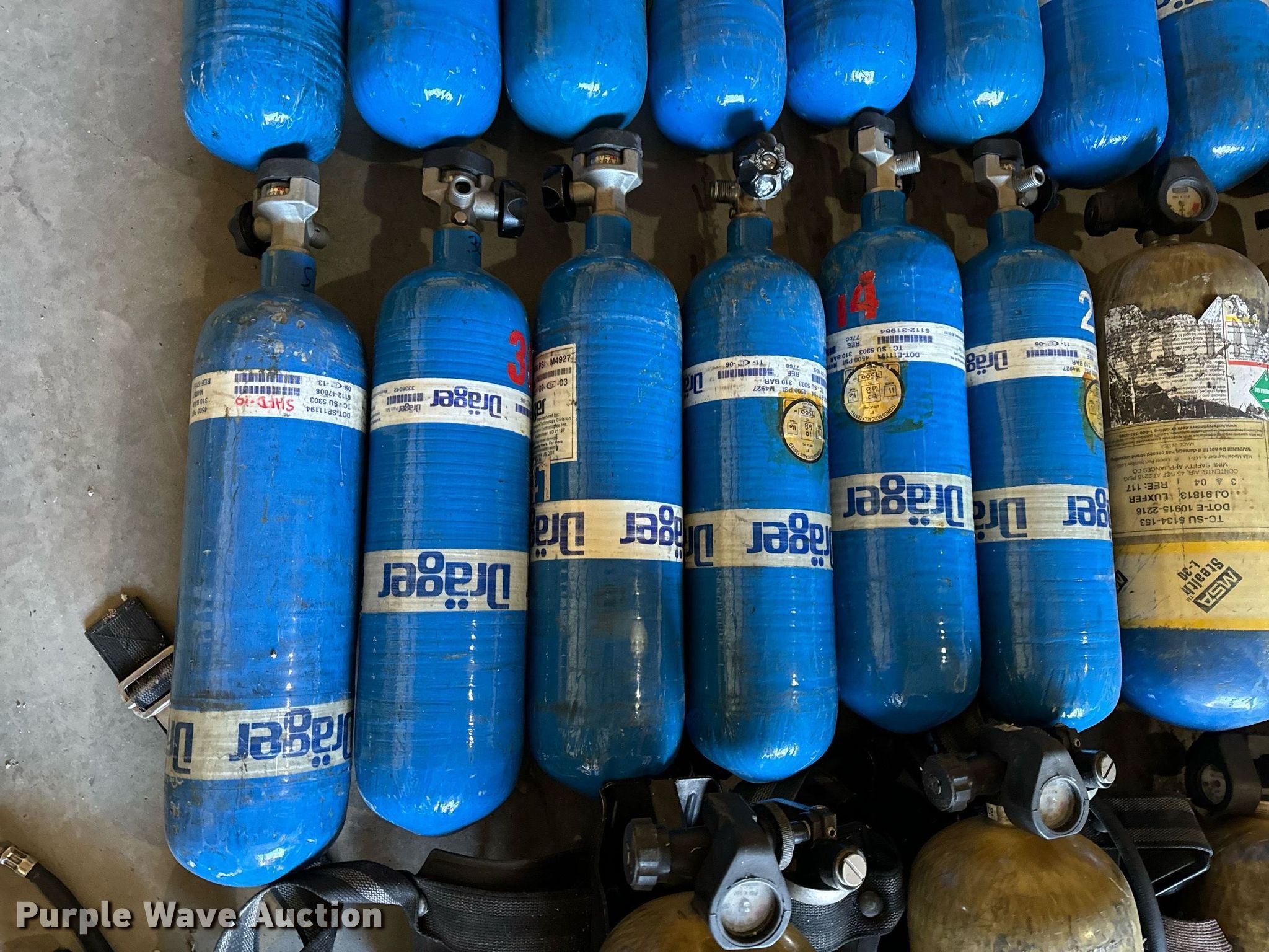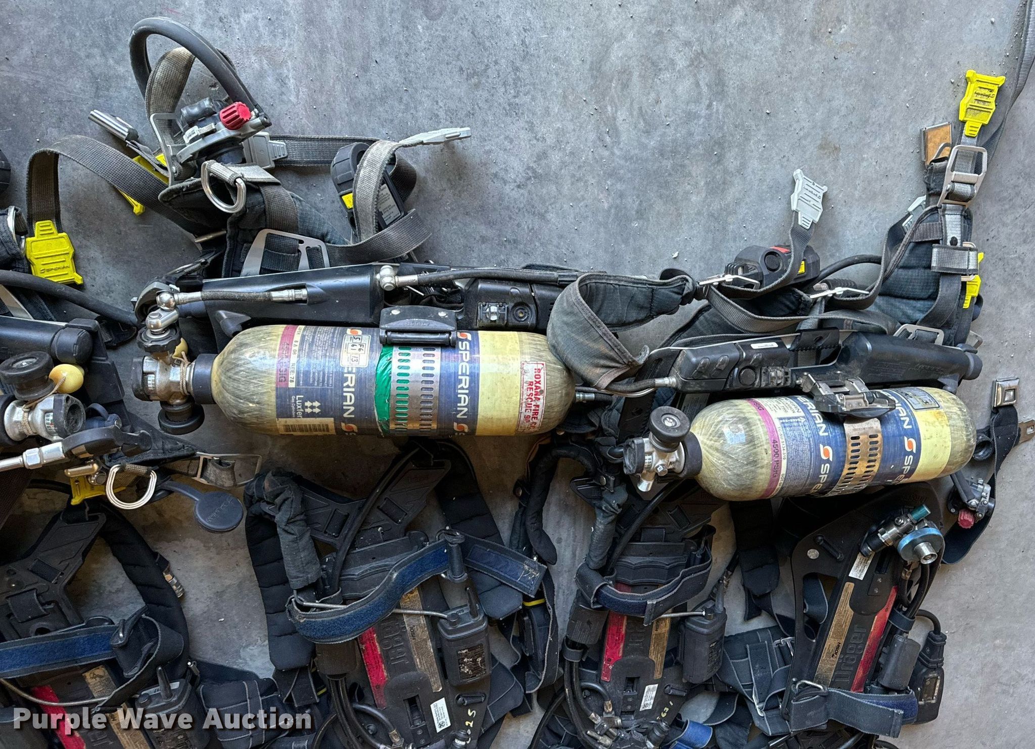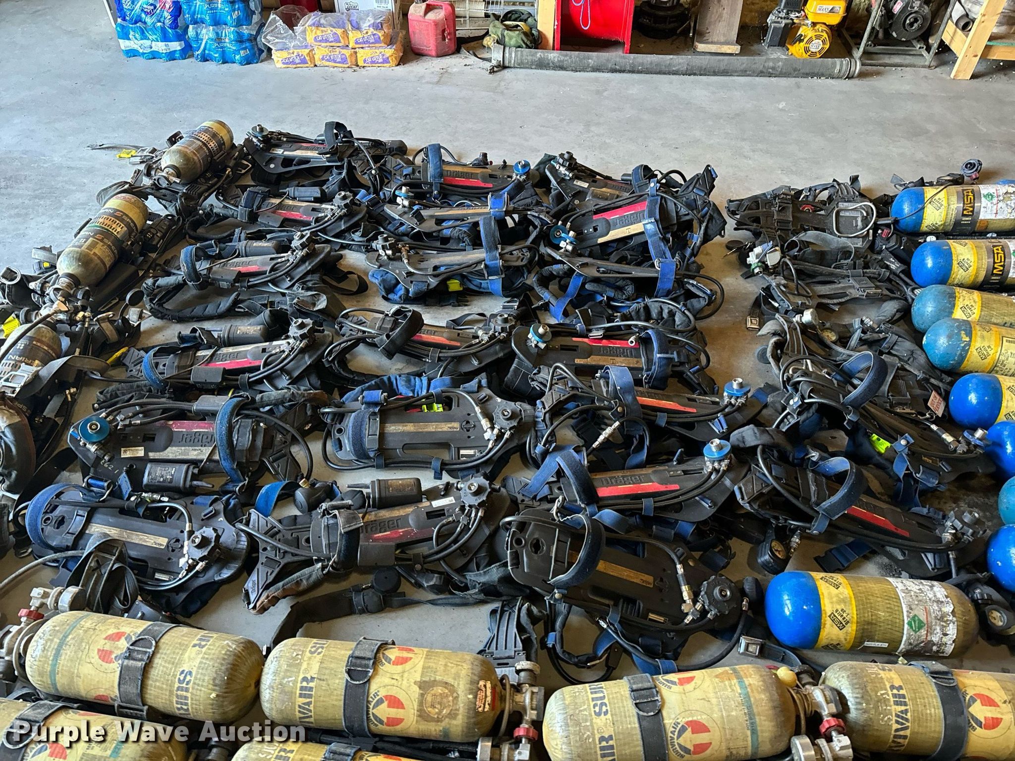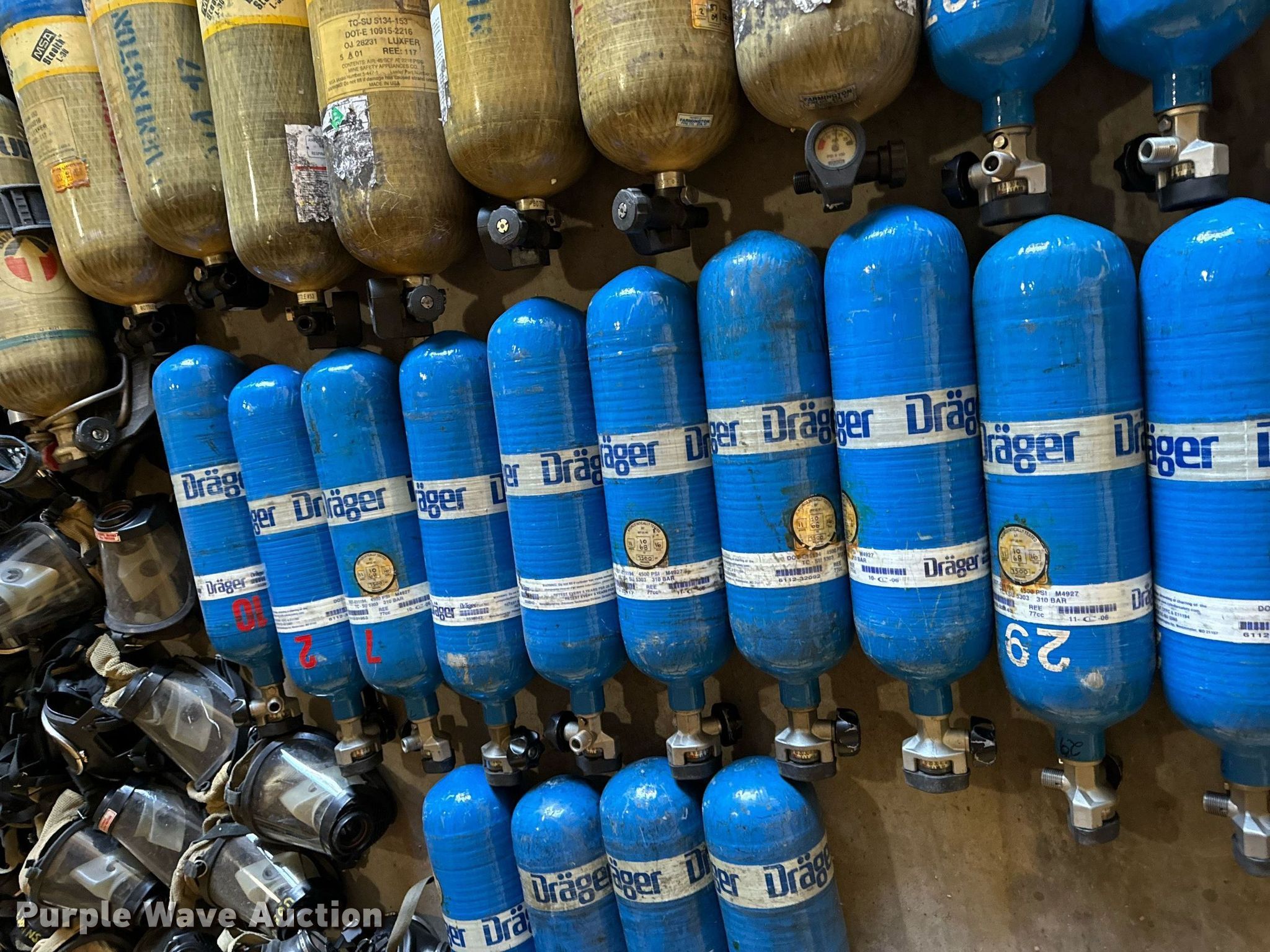 Purple Wave is selling a used Tools in Missouri. This item is a SCBA rescue equipment with the following: Approx. 58 SCBA bottles, Approx. 43 SCBA packs, Approx. 37 Masks