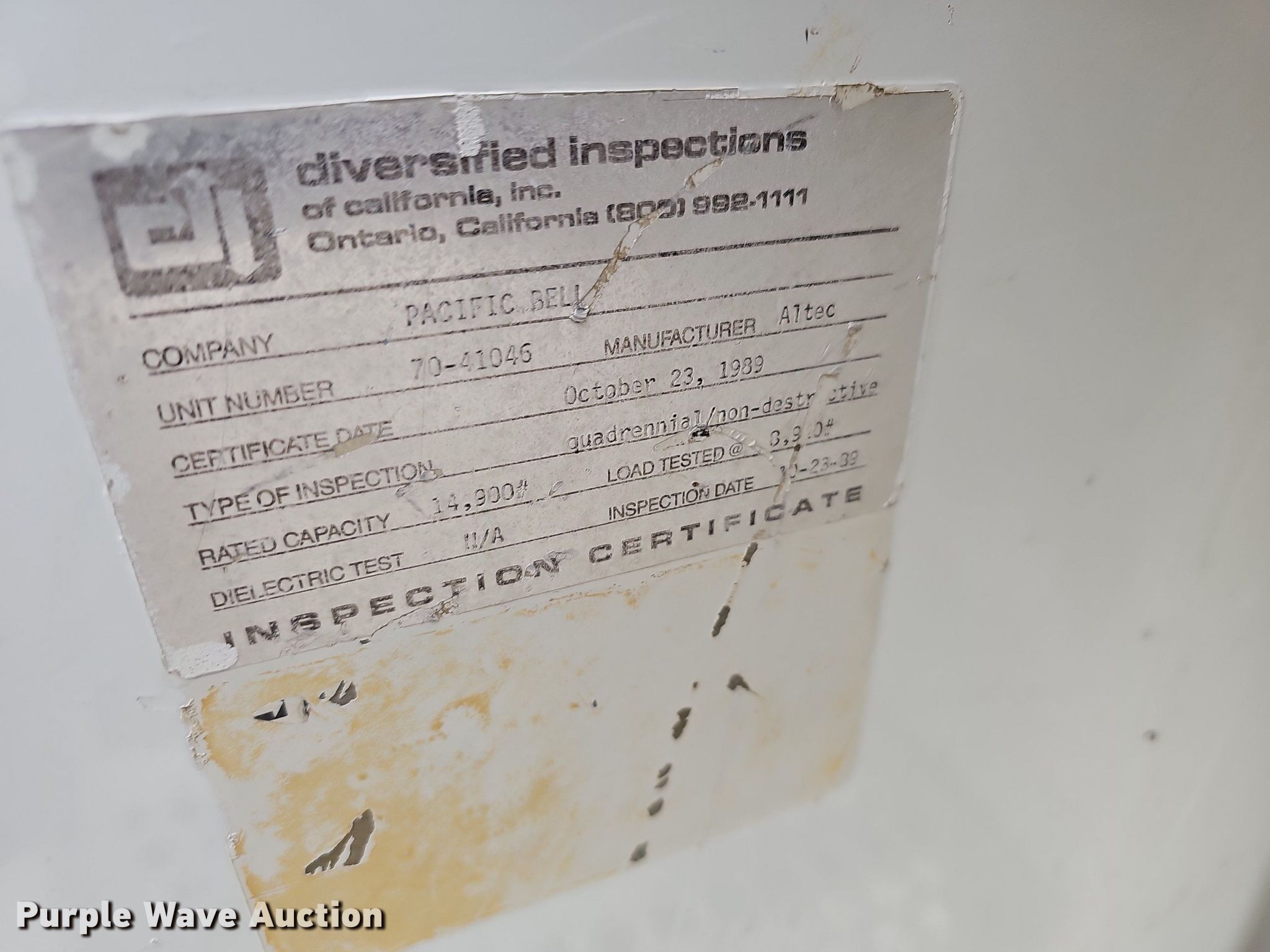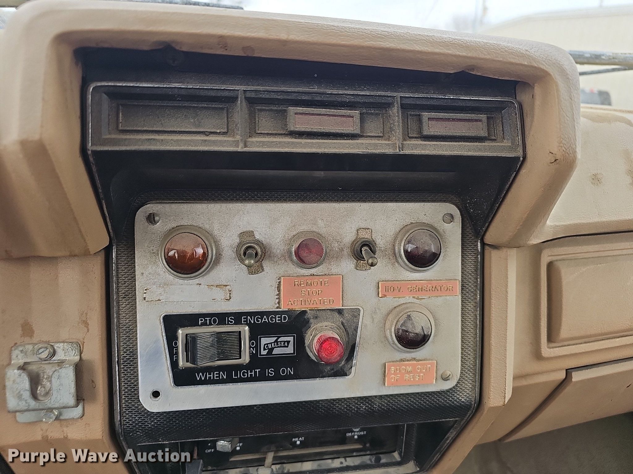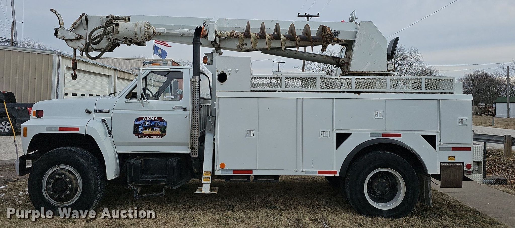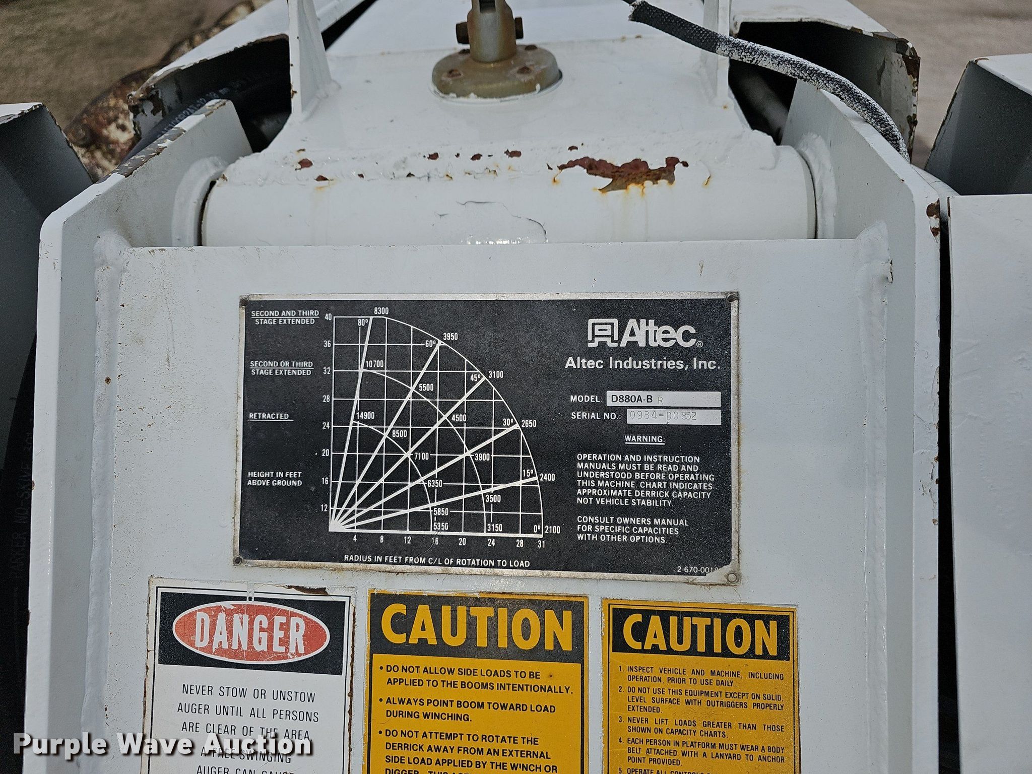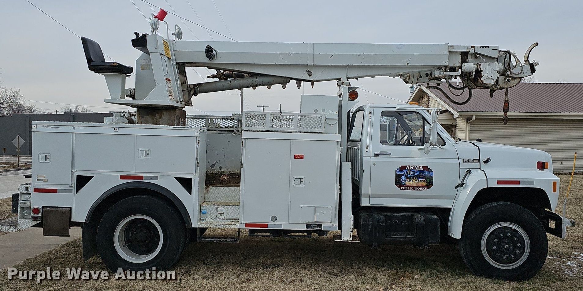 1985 Ford F8000 digger derrick truck. Miles: 49,325 on odometer, VIN: 1FDXK87U1FVA14321, Unit #: 4321. Engine Caterpillar 3208, Serial: 02711675, Displacement: 10.8L, Cylinders: 8, Fuel type: Diesel, HP: 210. Transmission Automatic. Chassis Suspension: Spring, Brakes: Air, PTO. Interior Heat, Brake controller. Features Bed Altec, Serial: 14-93226, 12' 2" L x 96" W, Boom Altec D880A-BR, Serial: 0984-DO852, Boom length: 40', Maximum lift capacity: 14,900 lbs, Boom type: Telescopic, Boom controls Ground, Platform/ basket, Pole guide, Auger Diameter: 18", 3rd stage manual, Hydraulic hose reel. Tires Size: 10.00R20, Brand: Michelin. Notes Dead battery, Non-operational driver wing window, Unknown operating condition of winch, Unknown operating condition of power converter, Boom extension issues, hydraulic issues when rope or auger is in operation. Kansas title. Seller is a government entity who will be assigning and distributing the title. Please contact the seller for distribution questions. City of Arma. 701 East Washington Street. Arma, KS 66712