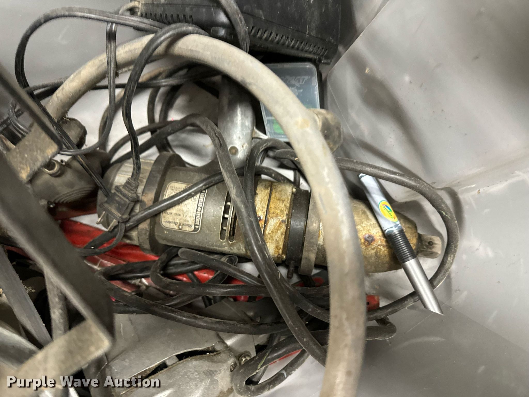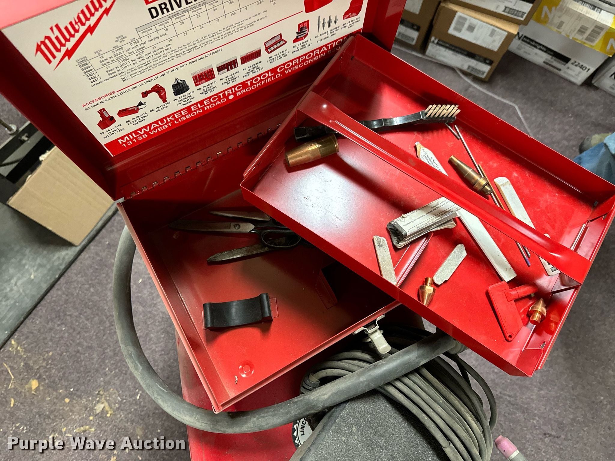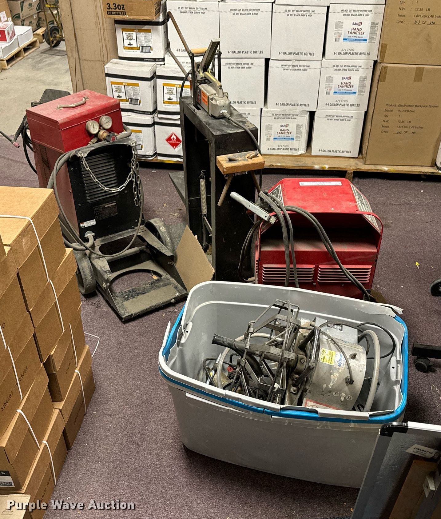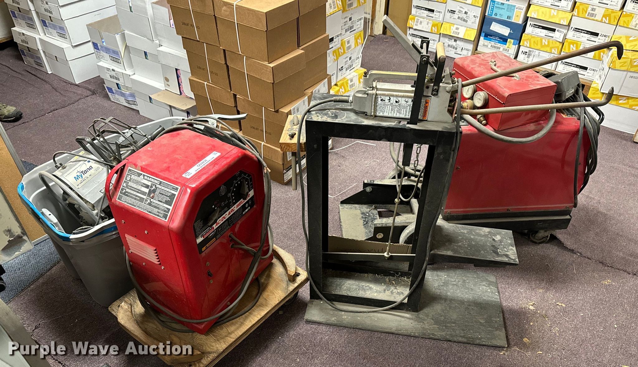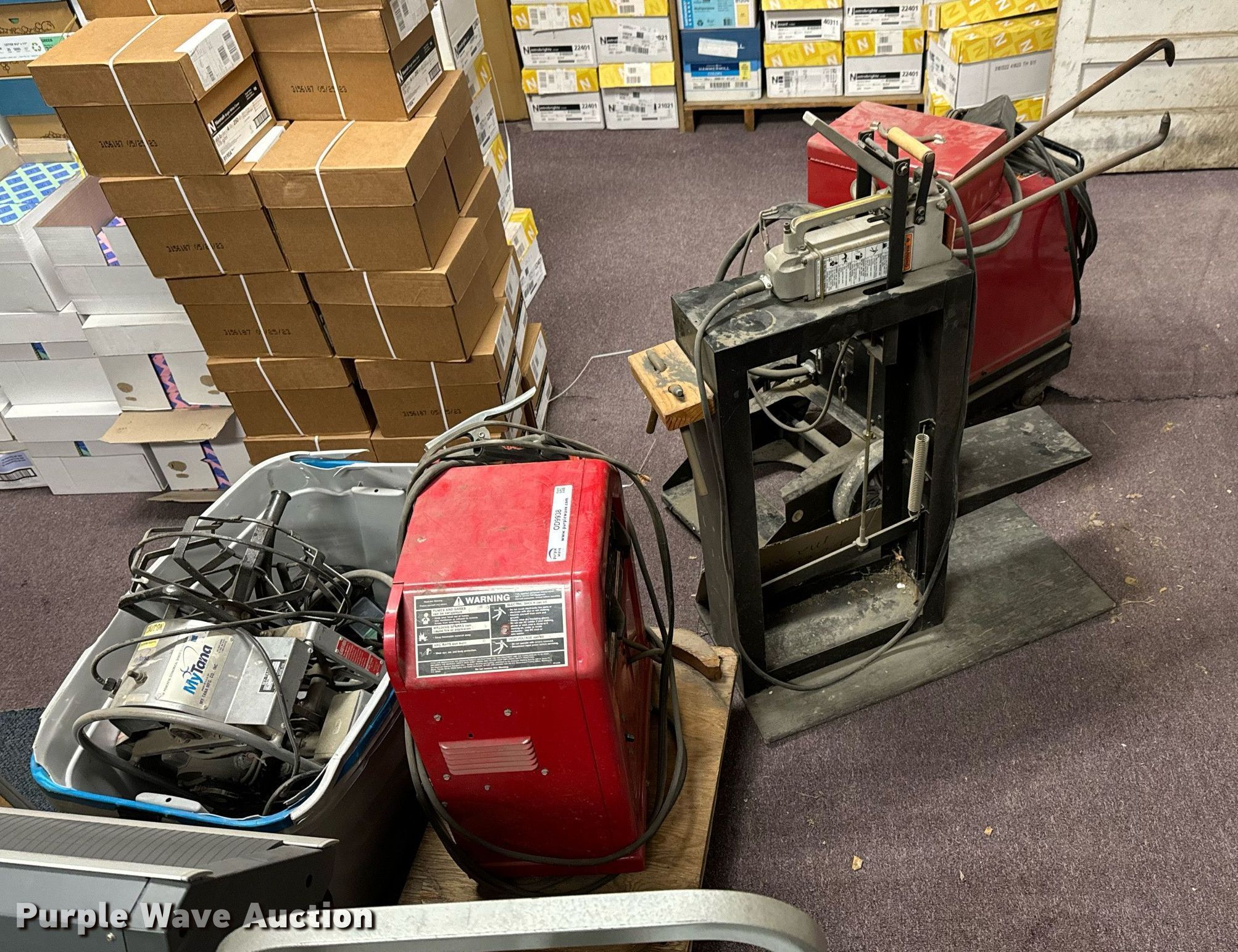 Purple Wave is selling a used Tools in Kansas. This item is a Tools with the following: Lincoln Electric welder, Phase: Single, Leads, Lincoln Electric Square Wave Tig 175, Phase: Single, AC/DC, Leads, Mytana sewer rodder, (2) pneumatic drills, Hobart HSW41 portable spot welder, Serial: KK125654, Volts: 110, Phase: Single