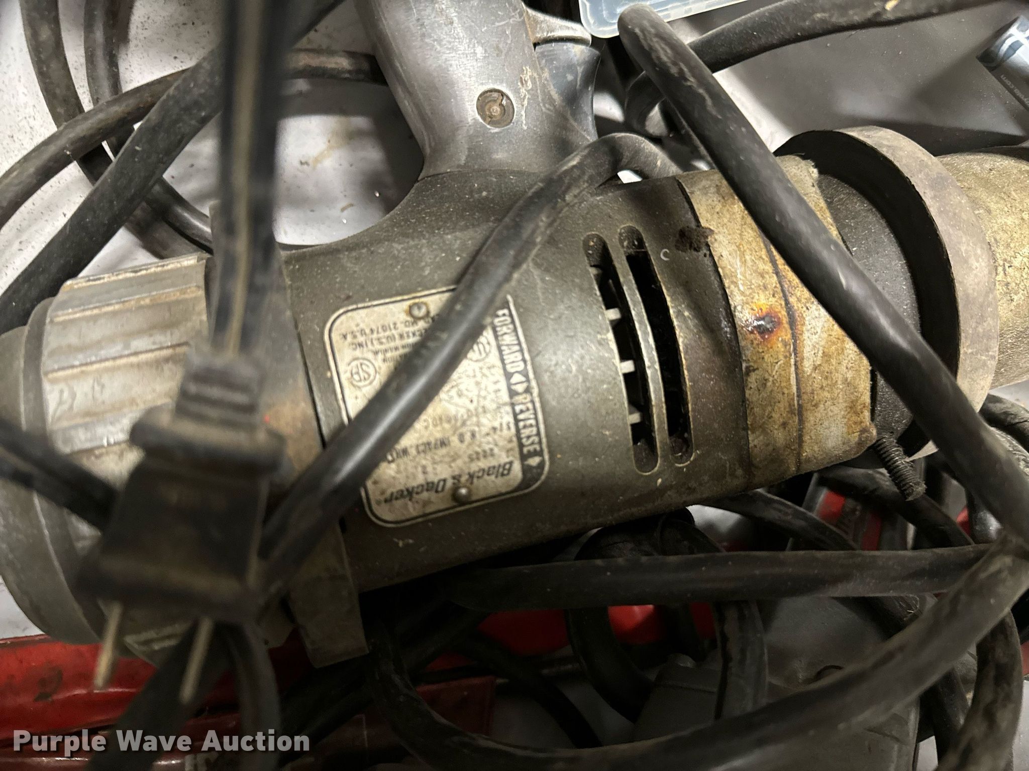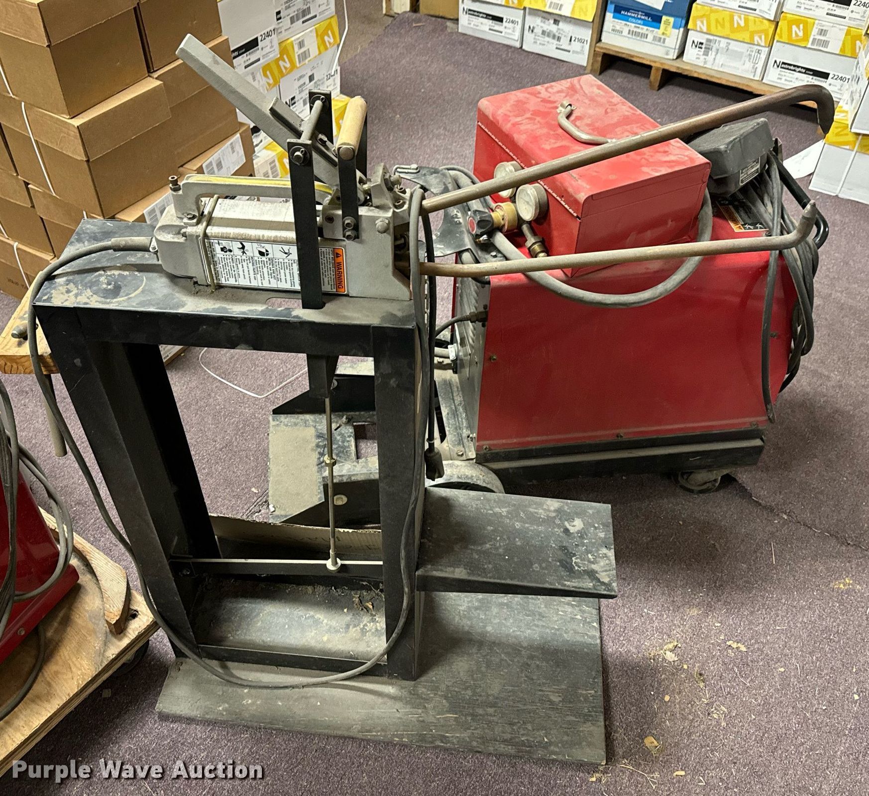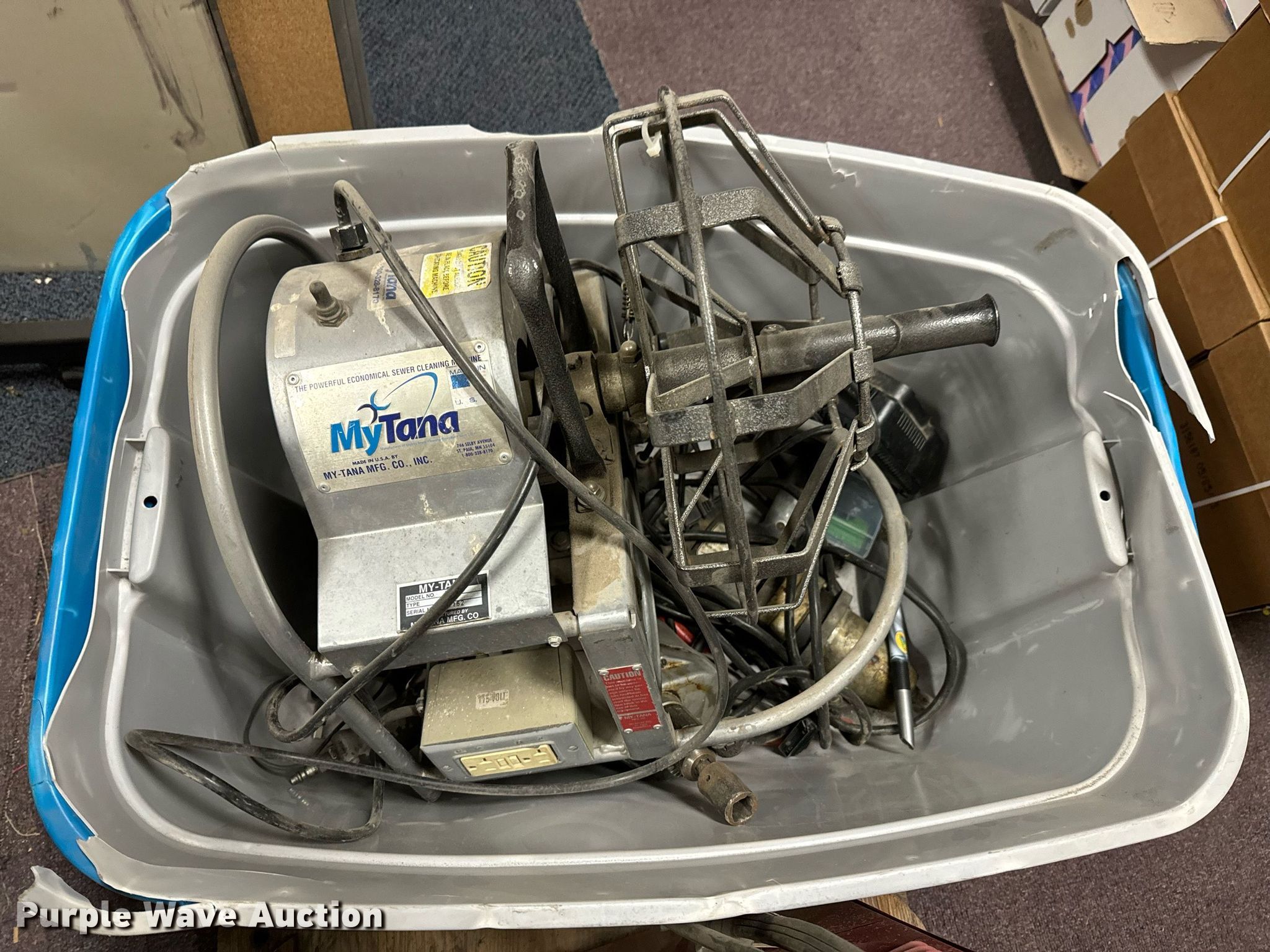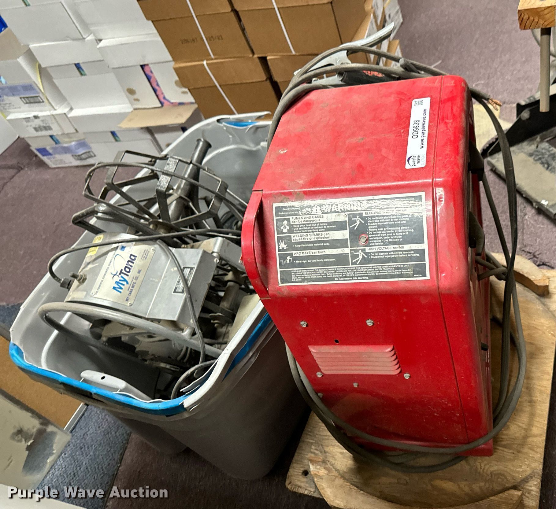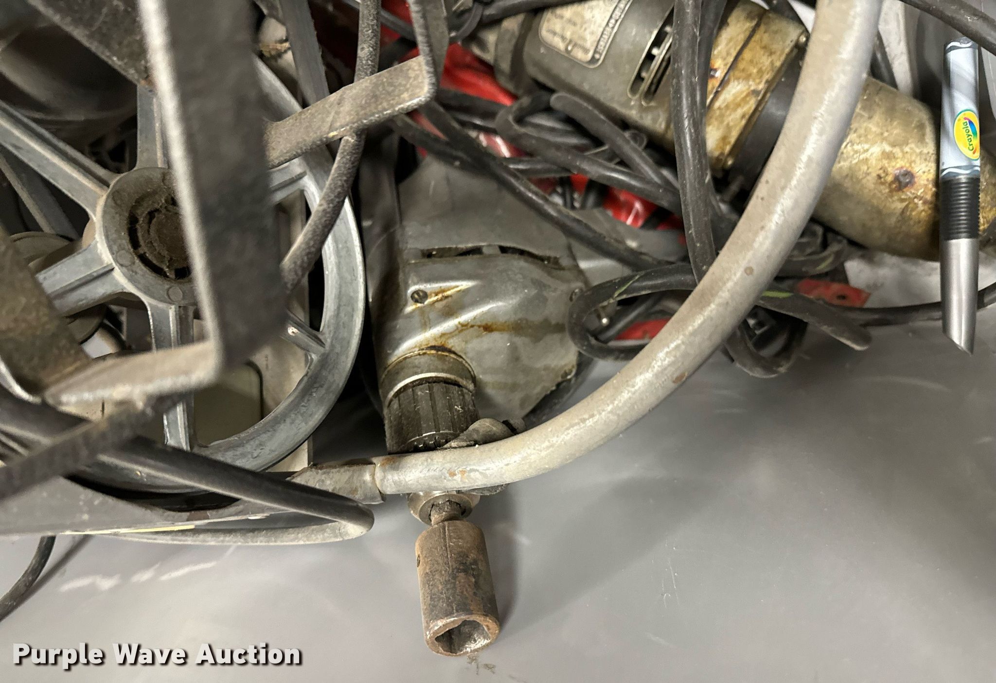 Purple Wave is selling a used Tools in Kansas. This item is a Tools with the following: Lincoln Electric welder, Phase: Single, Leads, Lincoln Electric Square Wave Tig 175, Phase: Single, AC/DC, Leads, Mytana sewer rodder, (2) pneumatic drills, Hobart HSW41 portable spot welder, Serial: KK125654, Volts: 110, Phase: Single