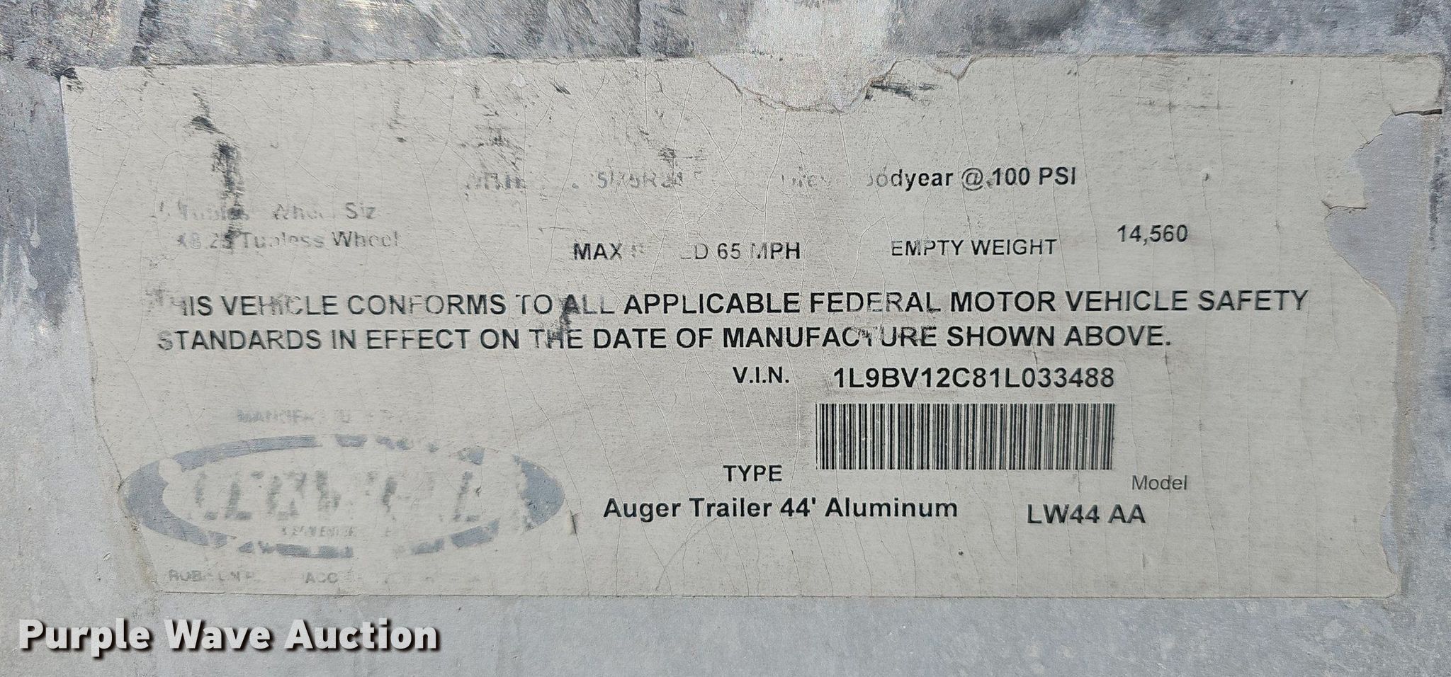 2001 Ledwell LW44 AA feed delivery trailer. VIN: 1L9BV12C81L033488, Unit #: 236. Dimensions Overall: 44' L x 102" W. Features Tank type: Aluminum, Compartments: 11, Baffles: 11, No. of manways/manholes: 11, Auger top and bottom Bottom auger: 44', Top auger: 34', Individual baffles, Hydraulic control operation. Chassis Landing gear: Dual, Suspension: Spring, Brakes: Air, Axles: Tandem. Tires Steel wheels, Size: 285/75R24.5. Kansas title. Title distribution may be delayed up to 14 days from verification of funds. J-Six Enterprises. 711 Missouri 59. Anderson, MO 64831