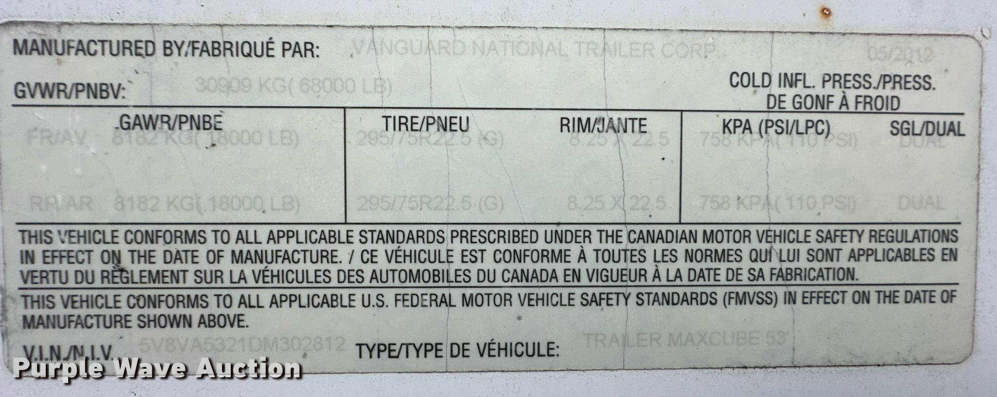 Purple Wave is selling a used Dry Van Trailer in Kansas. This item is a 2013 Vanguard dry van trailer with the following: VIN: 5V8VA5321DM302812