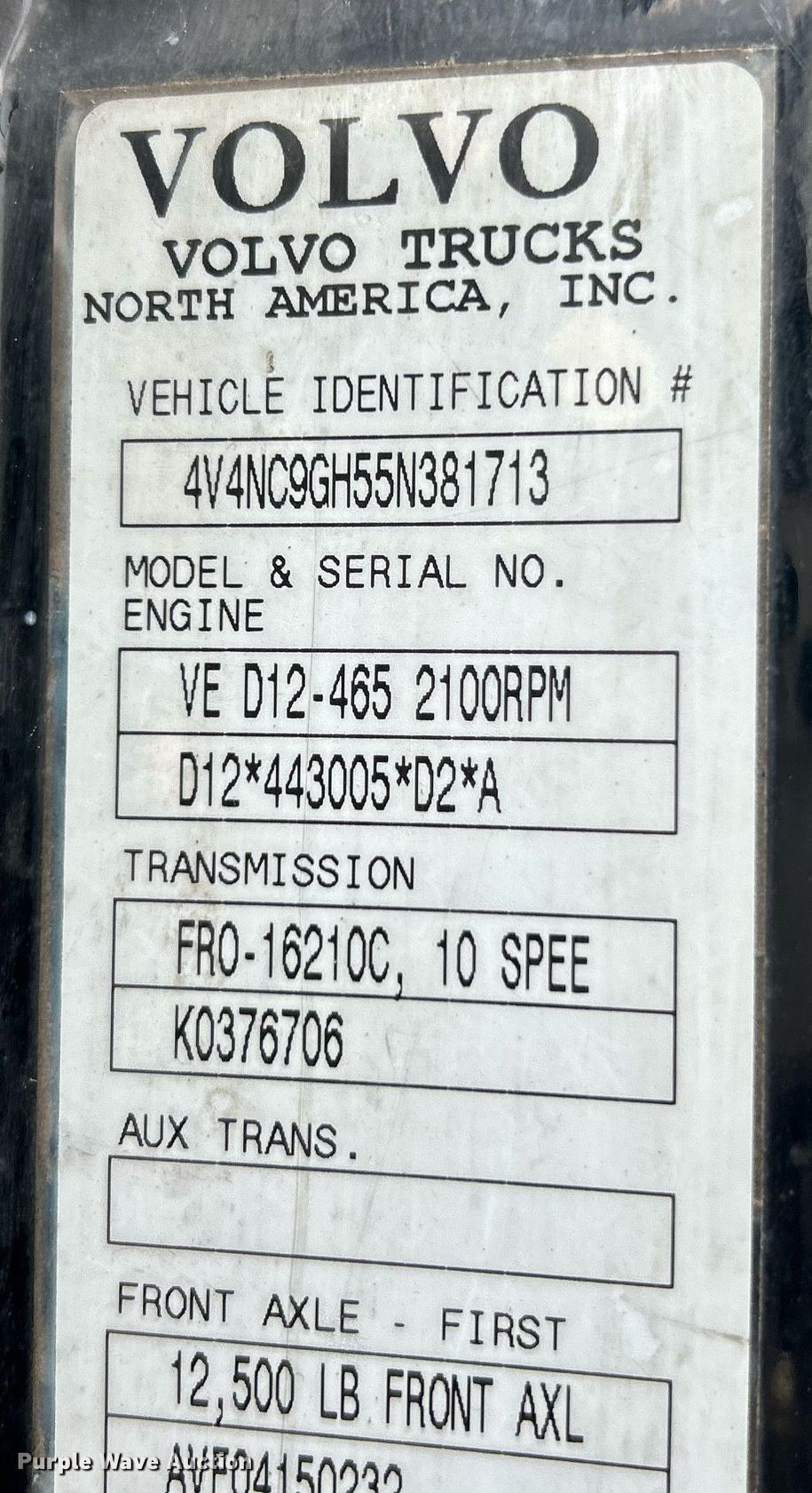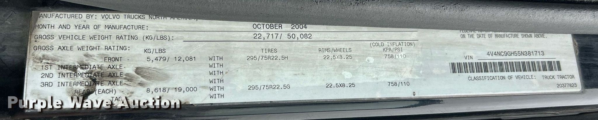 Purple Wave is selling a used Truck Tractor in Missouri. This item is a 2005 Volvo VNL semi truck with the following: Miles: 637,777 on odometer, VIN: 4V4NC9GH55N381713