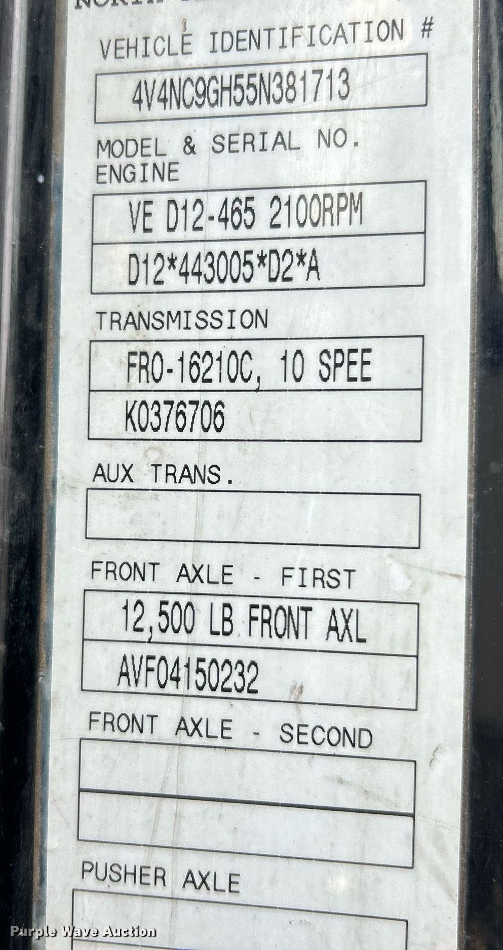 2005 Volvo VNL semi truck. Miles: 637,777 on odometer, VIN: 4V4NC9GH55N381713. Engine Volvo, Cylinders: 6, Fuel type: Diesel, HP: 465, Engine brake. Transmission Eaton Fuller, Manual, Speed: 10. Chassis Axles: Tandem, Differential lock: Inter-axle, Suspension: Air, Brakes: Air, PTO, Wet kit, GVWR: 50,082 lbs FAWR: 12,081 lbs, IAWR: 19,000 lbs, RAWR: 19,000 lbs. Interior AC, Heat, Heated mirrors, Cruise control, Air ride cab Beds: Double bunk, Refrigerator, Rear climate control. Features Deck plate: Aluminum, Fifth wheel type: Air operated, sliding, Power passenger window, Fuel tank: Dual. Tires Size: 285/70R24.5. Notes Windshield chipped or cracked, Oil leak. Missouri title. Seller is a Missouri licensed motor vehicle dealer. Title will be assigned and distributed by the dealer. Please contact the seller for distribution questions. Title distribution may be delayed up to 30 days from verification of funds. Northpoint Enterprises, LLC. 100 Manda Ct. Troy, MO 63379