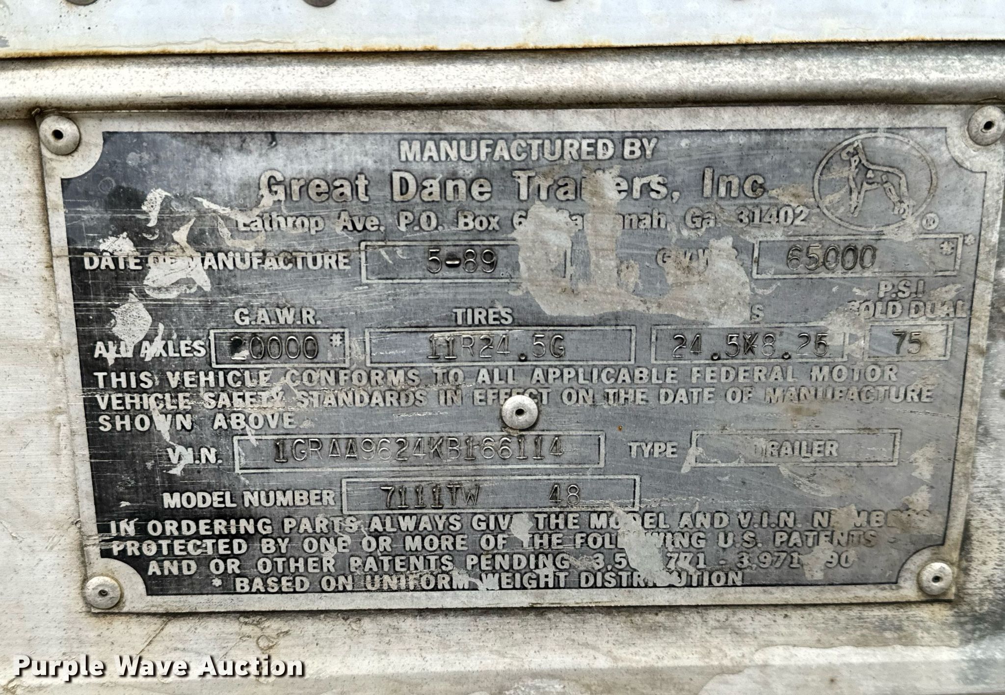 Purple Wave is selling a used Dry Van Trailer in Kansas. This item is a 1989 Great Dane 7111TW 48 dry van trailer with the following: VIN: 1GRAA9624KB166114, Unit #: 211