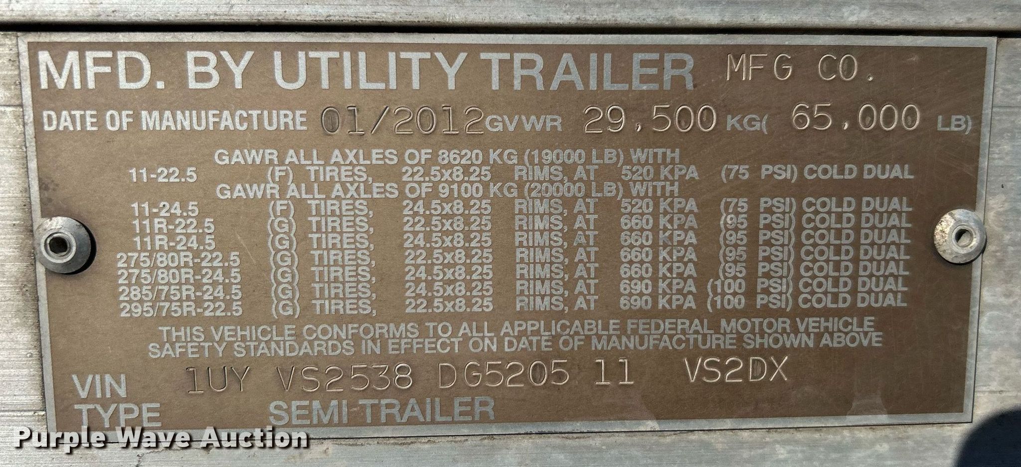 2013 Utility Trailer VS2DX dry van trailer. VIN: 1UYVS2538DG520511. Dimensions Overall: 53' L x 102" W. Features Deck type: Wood, E-track rail system. Chassis Landing gear: Dual, Suspension: Air, Brakes: Air, Axles: Tandem, GVWR: 65,000 lbs. Tires Steel wheels, Size: 295/75R22.5. Title distribution may be delayed up to 14 days from verification of funds. 15107 North 137th East Avenue. Collinsville, OK 74021