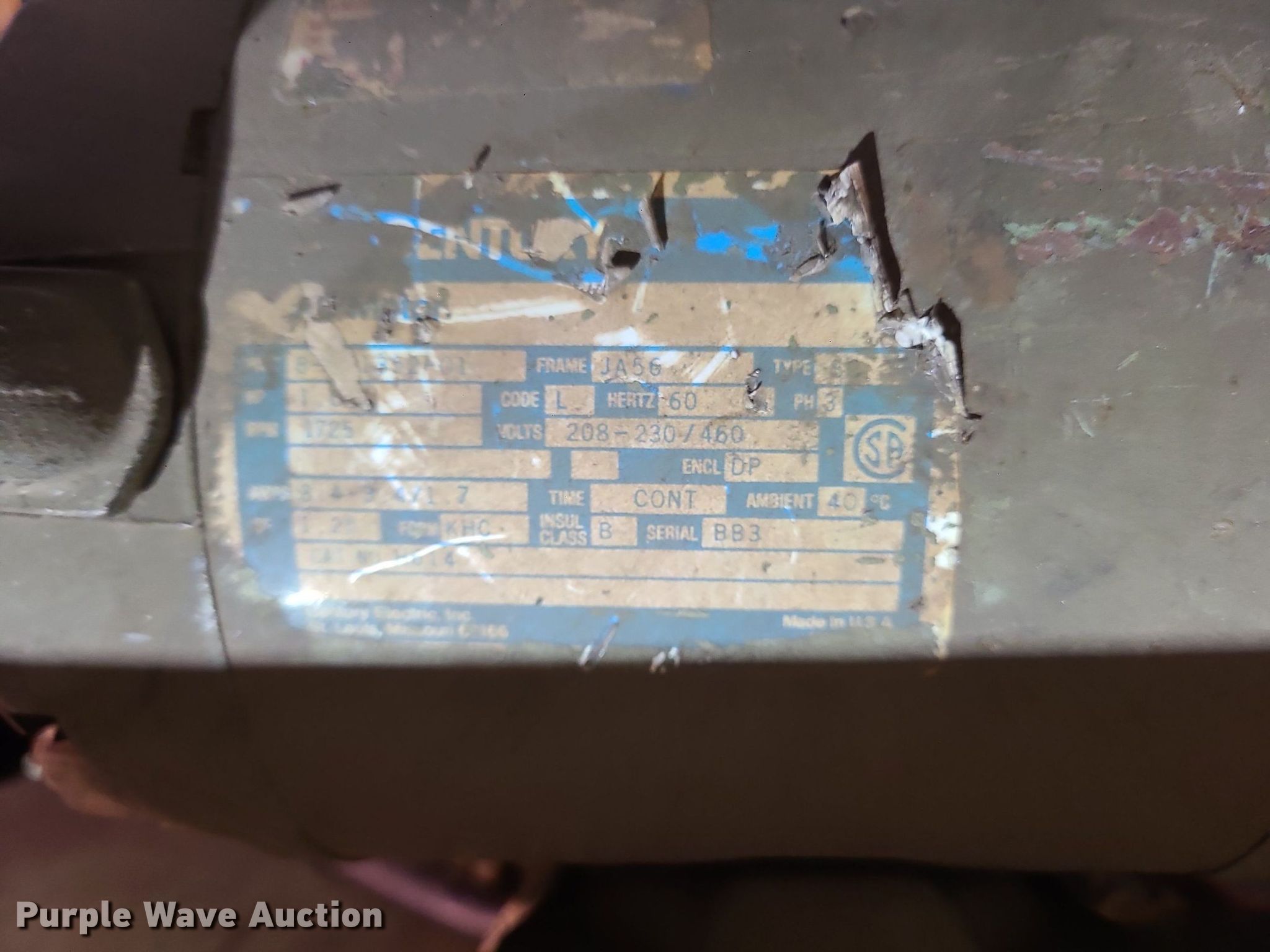 Kysr Machine Tool KJ10 band saw. Serial: H84032101. Electric Motor Century, Serial: BB3, Volts: 208-230/460, Phase: Three. Construction Equipment Services, INC.. 157 McKendree Rd. Odessa, MO 64076