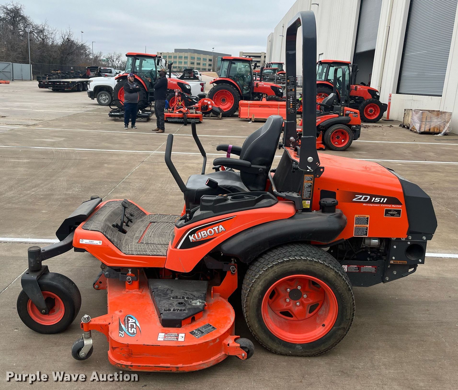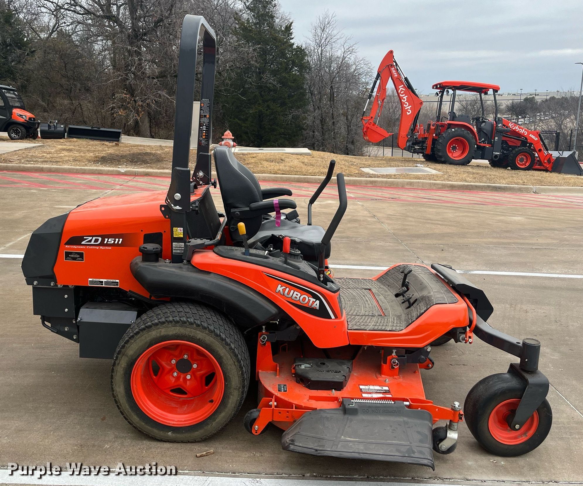 Purple Wave is selling a used Commercial Turf Mower in Texas. This item is a 2019 Kubota ZD1511 ZTR lawn mower with the following: Hours: 165 on meter, Cutting width: 72", Serial: 11460
