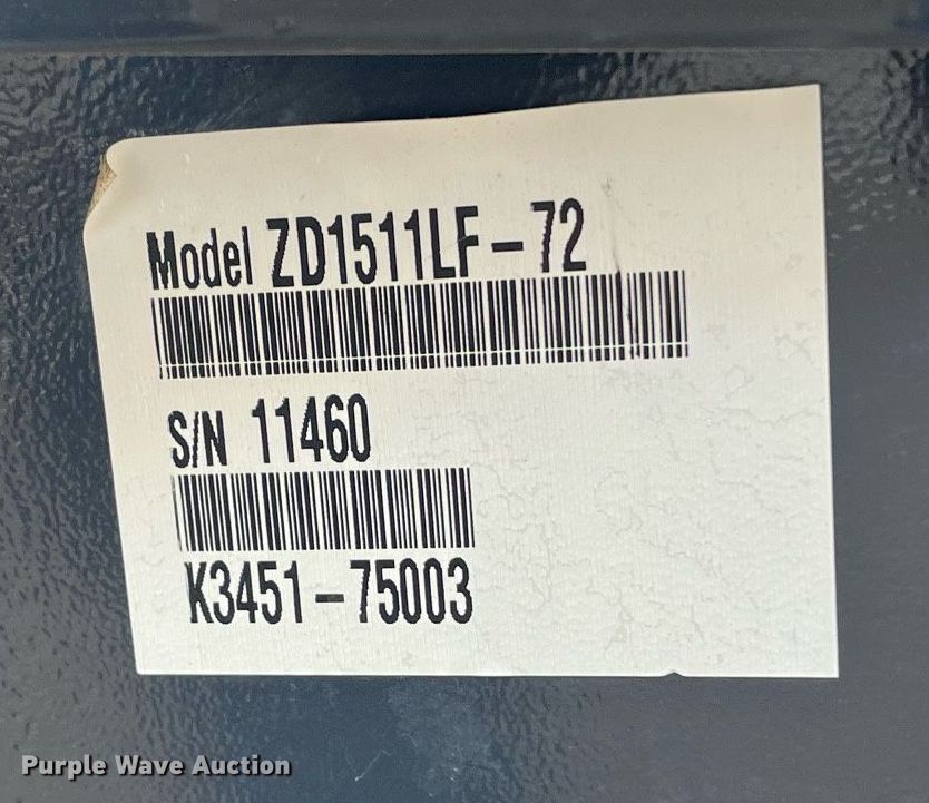 2019 Kubota ZD1511 ZTR lawn mower. Hours: 165 on meter, Cutting width: 72", Serial: 11460. Engine Kubota V1505-T, Serial: 1KD1156, Cylinders: 4, Fuel type: Diesel. Transmission Hydrostatic. Features Self- propelled, Mower deck Width: 72", Kubota ACS72. Tires Front: 15x6.50-8, Rear: 26x12-16. Notes No manufacturer warranty. Kubota Tractor Corp. 1000 Kubota Dr. Grapevine, TX 76051