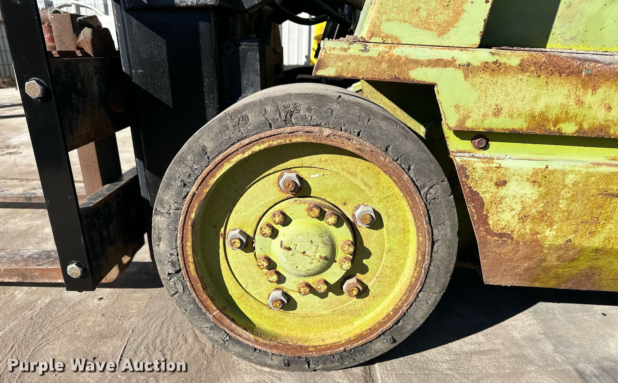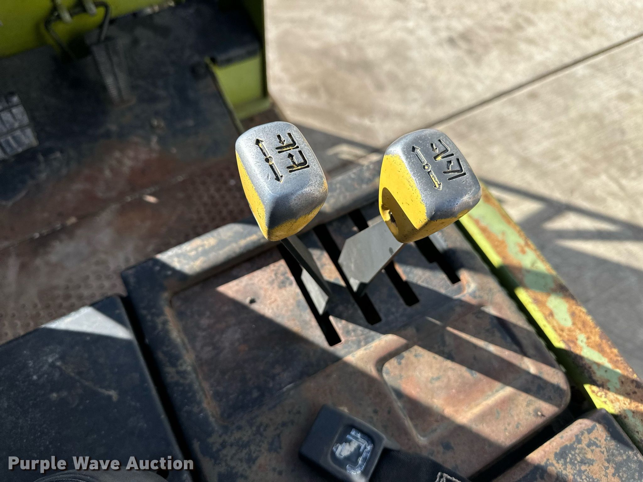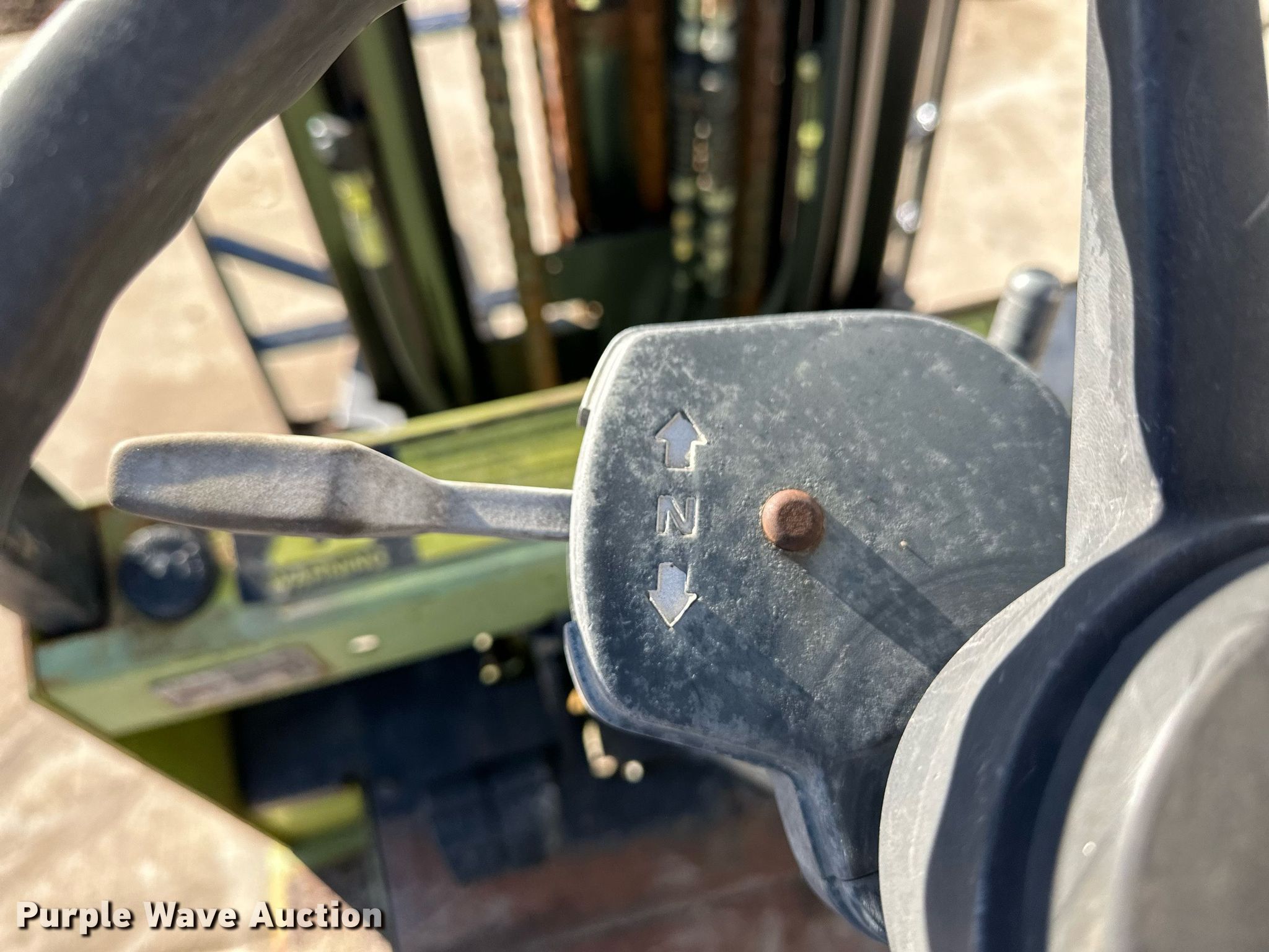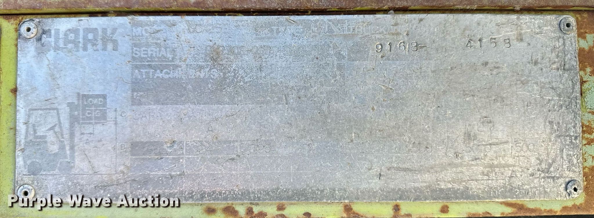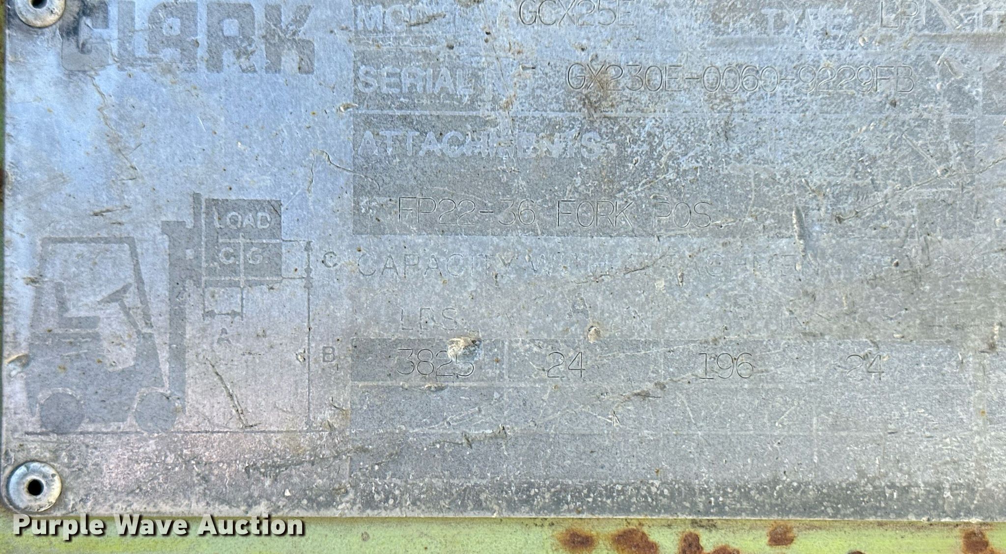 Clark GCX25E forklift. Hours: 682 on meter, Serial: GX230E-00609229FB. Engine Cylinders: 4, Fuel type: LPG LP bottle: Not included. Transmission Shuttle shift. Operators station Canopy. Features Maximum lift capacity: 3,825 lbs, Maximum lift height: 196", Mast stages: 3, Mast tilt, Fork length: 48". Tires Front: 21x8x15, Rear: 7x5x12 1/8, Solid. Peter Teichroeb. 1587 Cottonwood. Sublette, KS 67877