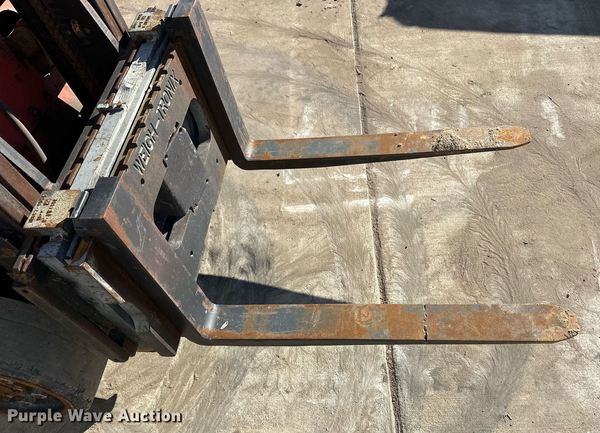 Toyota 42-6FGCU25 forklift. Hours: 14,902 on meter. Engine Cylinders: 4, Fuel type: LPG LP bottle: Included. Transmission Shuttle shift. Operators station Canopy. Features Maximum lift capacity: 4,300 lbs, Maximum lift height: 80", Mast stages: 2, Mast tilt, Fork length: 36". Tires Front: 21x7x15, Solid. Peter Teichroeb. 1587 Cottonwood. Sublette, KS 67877
