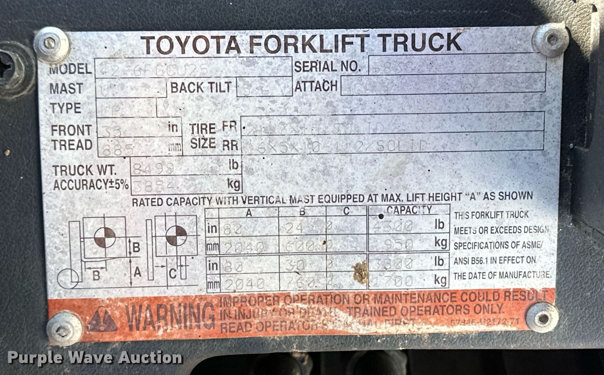 Purple Wave is selling a used Warehouse Forklift in Kansas. This item is a Toyota 42-6FGCU25 forklift with the following: Hours: 14,902 on meter