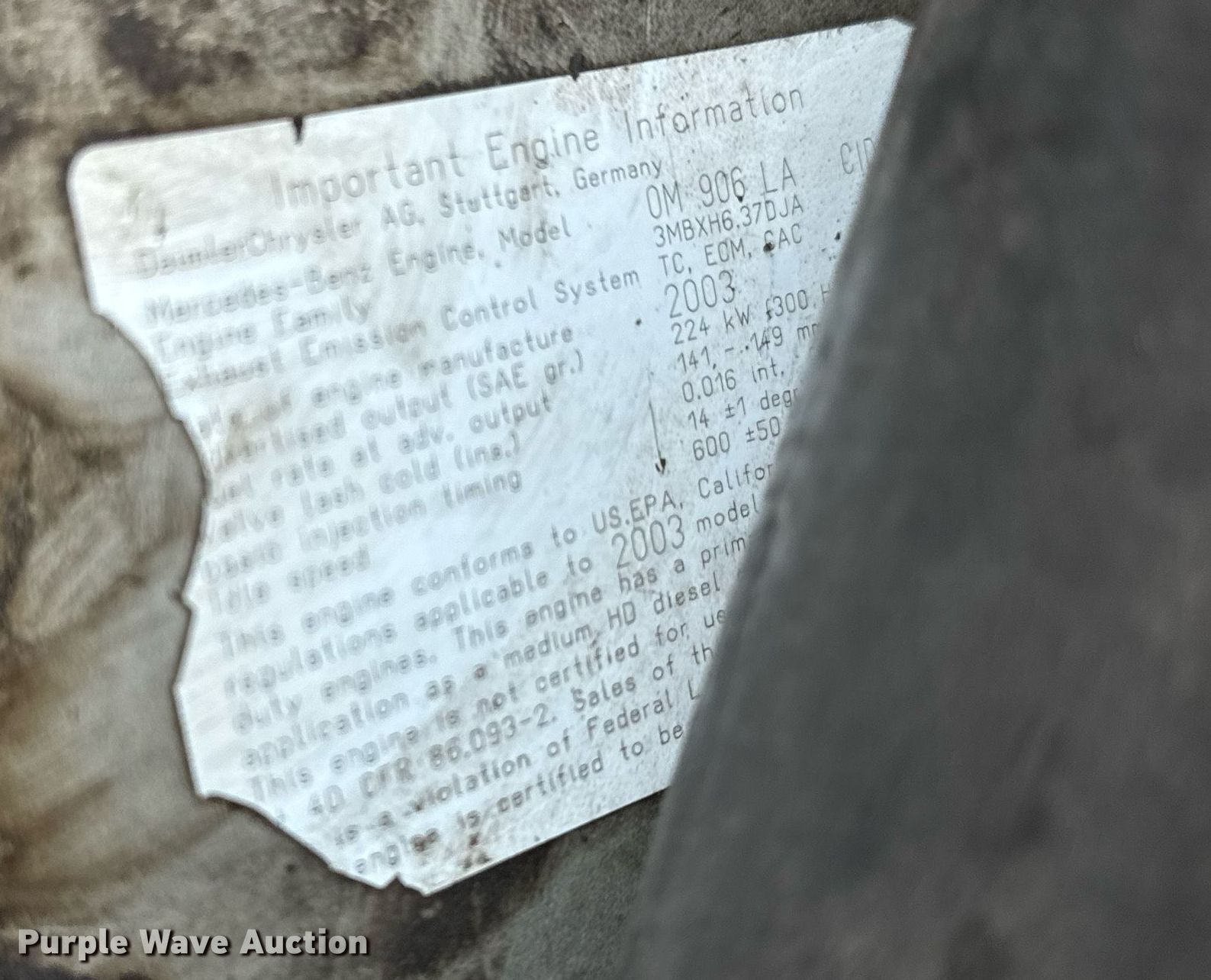 2003 Freightliner Business Class M2 dump truck. Miles: 34,241 on odometer, VIN: 1FVHCYCS33HM10193, Unit #: 232. Engine Mercedes-Benz OM 906LA, Displacement: 6.4L, Cylinders: 6, Fuel type: Diesel, Engine brake. Transmission Manual, Speed: 10. Chassis Double frame, Axles: Tandem, Differential lock: Inter-axle, Suspension: Air Dump valves, Brakes: Air, PTO, GVWR: 58,000 lbs FAWR: 18,000 lbs, IAWR: 20,000 lbs, RAWR: 20,000 lbs. Interior AC, Heat, Heated mirrors, Cruise control, Brake controller. Features Dump bed 17' L x 98" W, Side height: 40", Bed type: Steel, Barrel, Ram: Single, End gate: Air operated. Tires Front: 385/65R22.5, Rear: 11R22.5. Notes Dash warning indicator: ABS, Windshield chipped or cracked. Kansas title. Mileage has not been verified. Exempt will be written in the odometer disclosure on the title. Vogts-Parga Construction, LLC. 1535 Northwest 36th Street. Newton, KS 67114