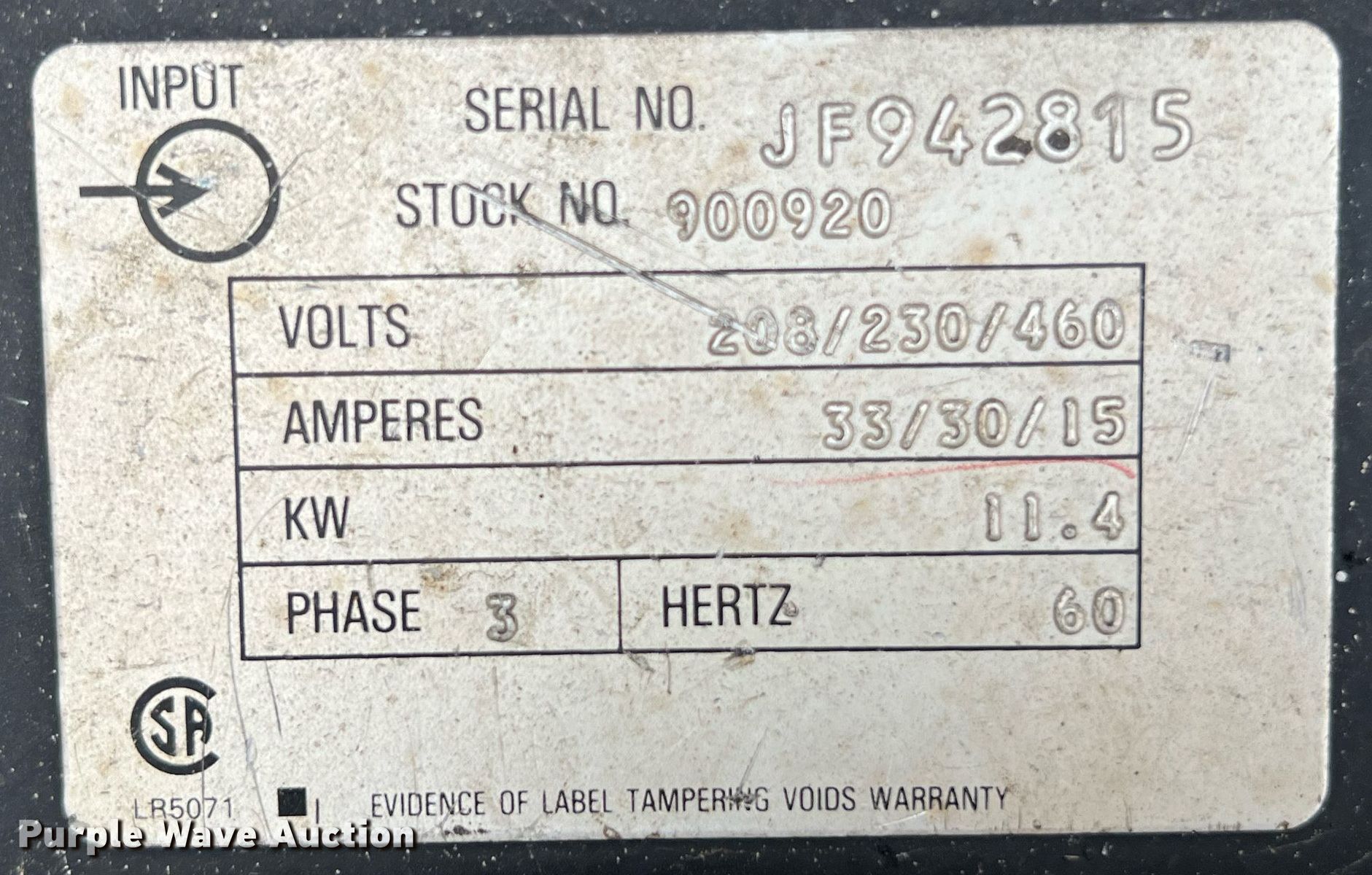 Miller CP-250TS welder/generato. Serial: JF942815. Electric Motor Volts: 208/230/460, Phase: Three. Features Welder Leads, Bottles not included, Skid mounted, Generator kW: 11.4. Notes Unknown operating condition. Swot Logistics LLC. 11055 Mesa Drive. Houston, TX 77078