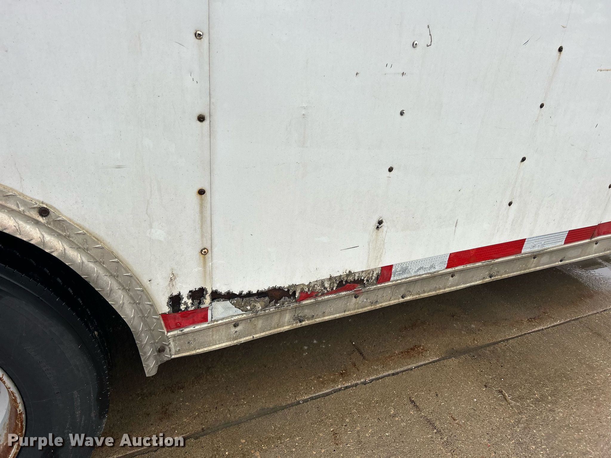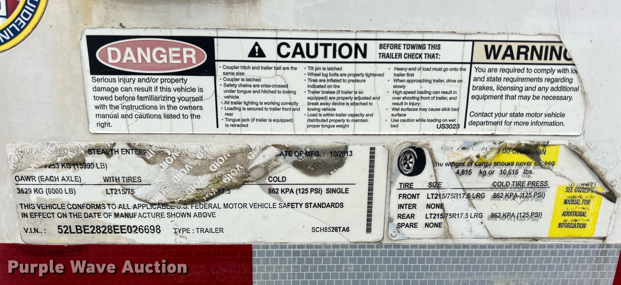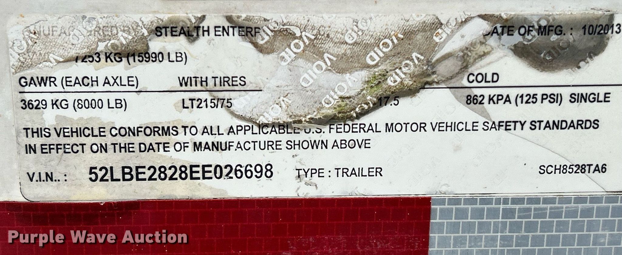 2014 Stealth enclosed cargo trailer. VIN: 52LBE2828EE026698. Dimensions Overall: 32' L x 102" W, Body: 28' L x 89" W. Features Deck type: Wood. Chassis Ball hitch: 2 5/16", Landing gear: Single, Suspension: Spring, Brakes: Electric, Axles: Tandem, GVWR: 15,990 lbs. Tires Steel wheels, Size: 215/75R17.5. Notes Rust damage. Iowa title. Title distribution may be delayed up to 14 days from verification of funds. 5513 6th Street SW Ste D. Cedar Rapids, IA 52404