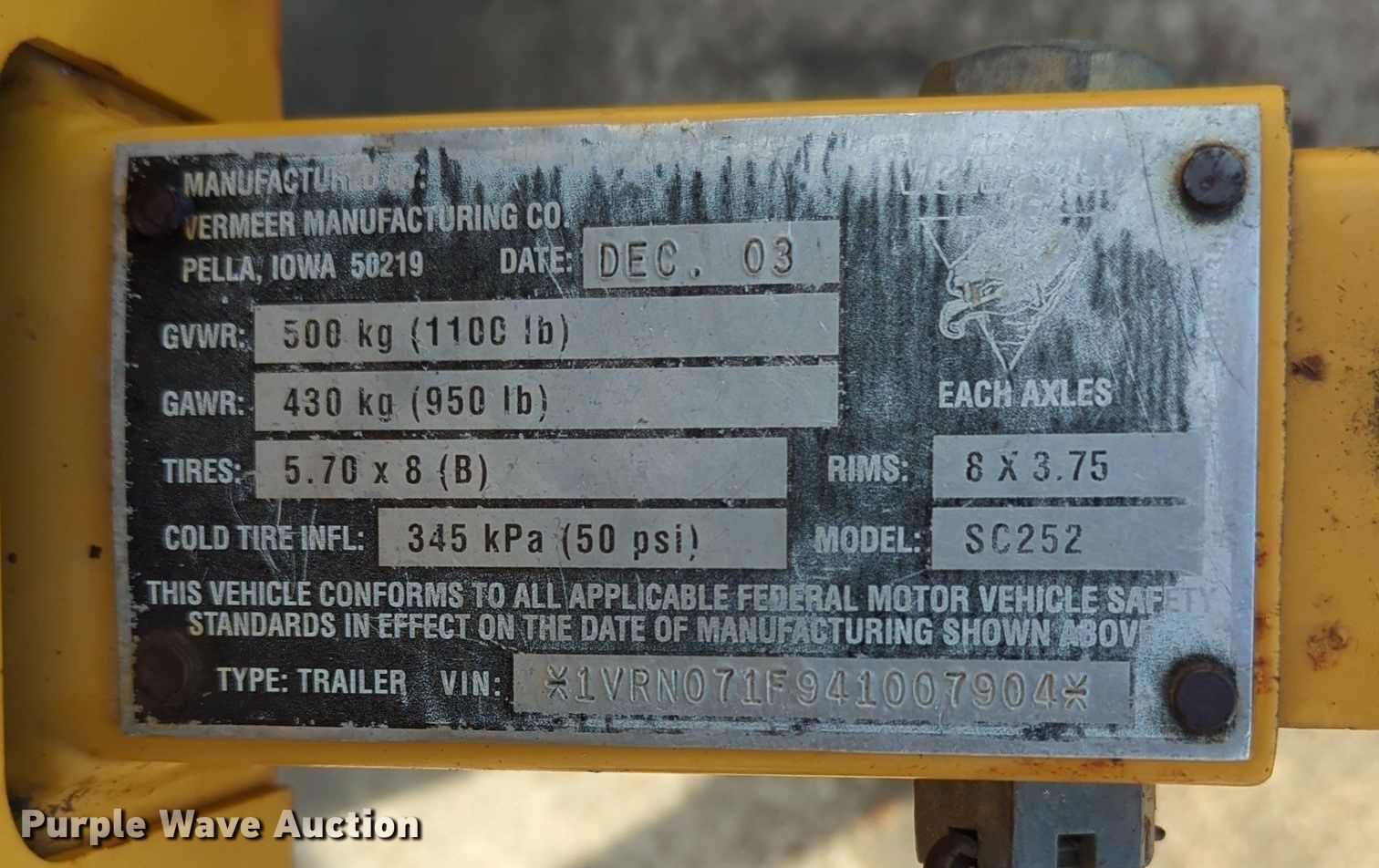Purple Wave is selling a used Wood Chipper or Stump Grinder in Oklahoma. This item is a 2004 Vermeer SC252 stump grinder with the following: Hours: 751 on meter, VIN: 1VRN071F941007904