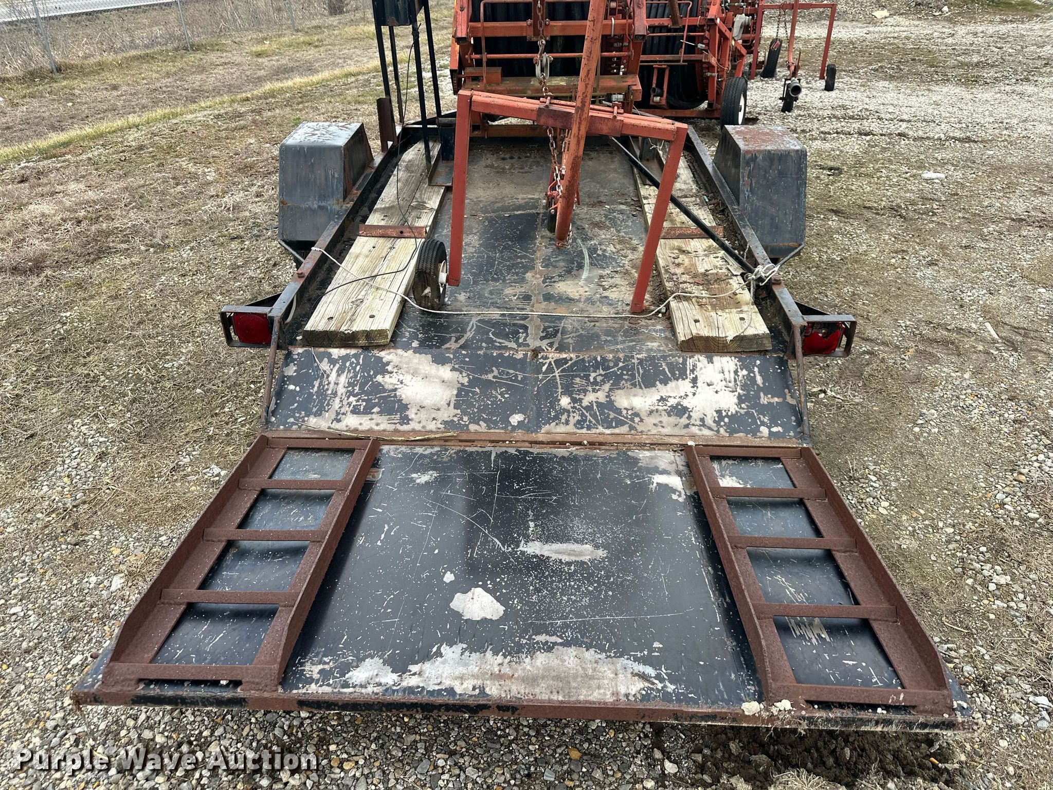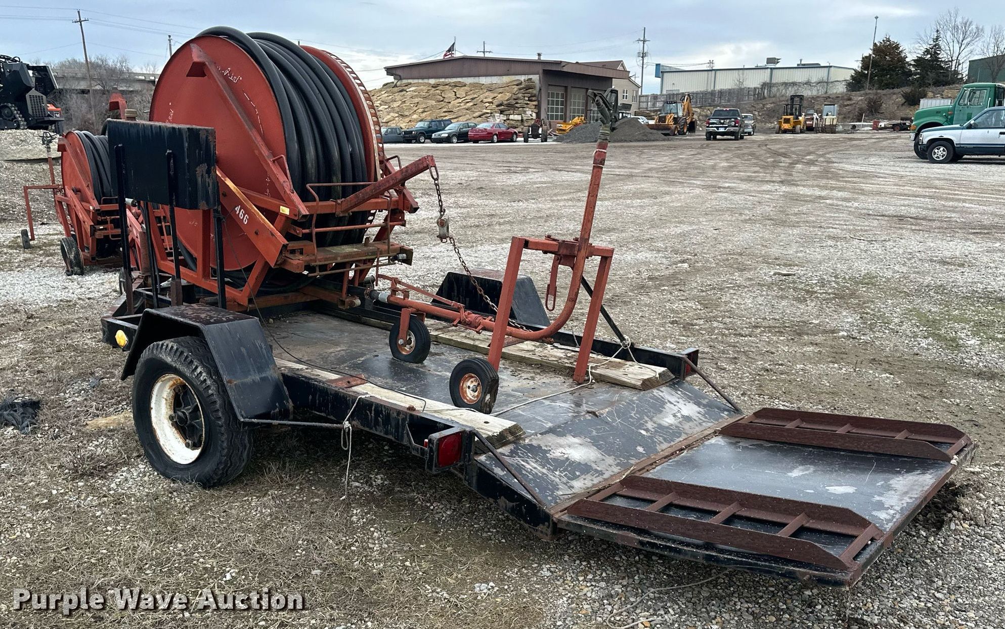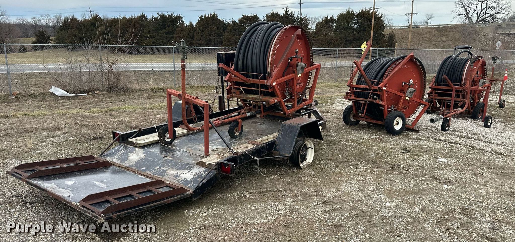 (3) Kifco B160 water hose reels. (3) traveling sprinklers, Trailer Deck length: 8�, Tail Length: 1�, Ramp Length: 2�, Overall: 12� L x 80� W, Unknown operating condition. Tonganoxie, KS 66086
