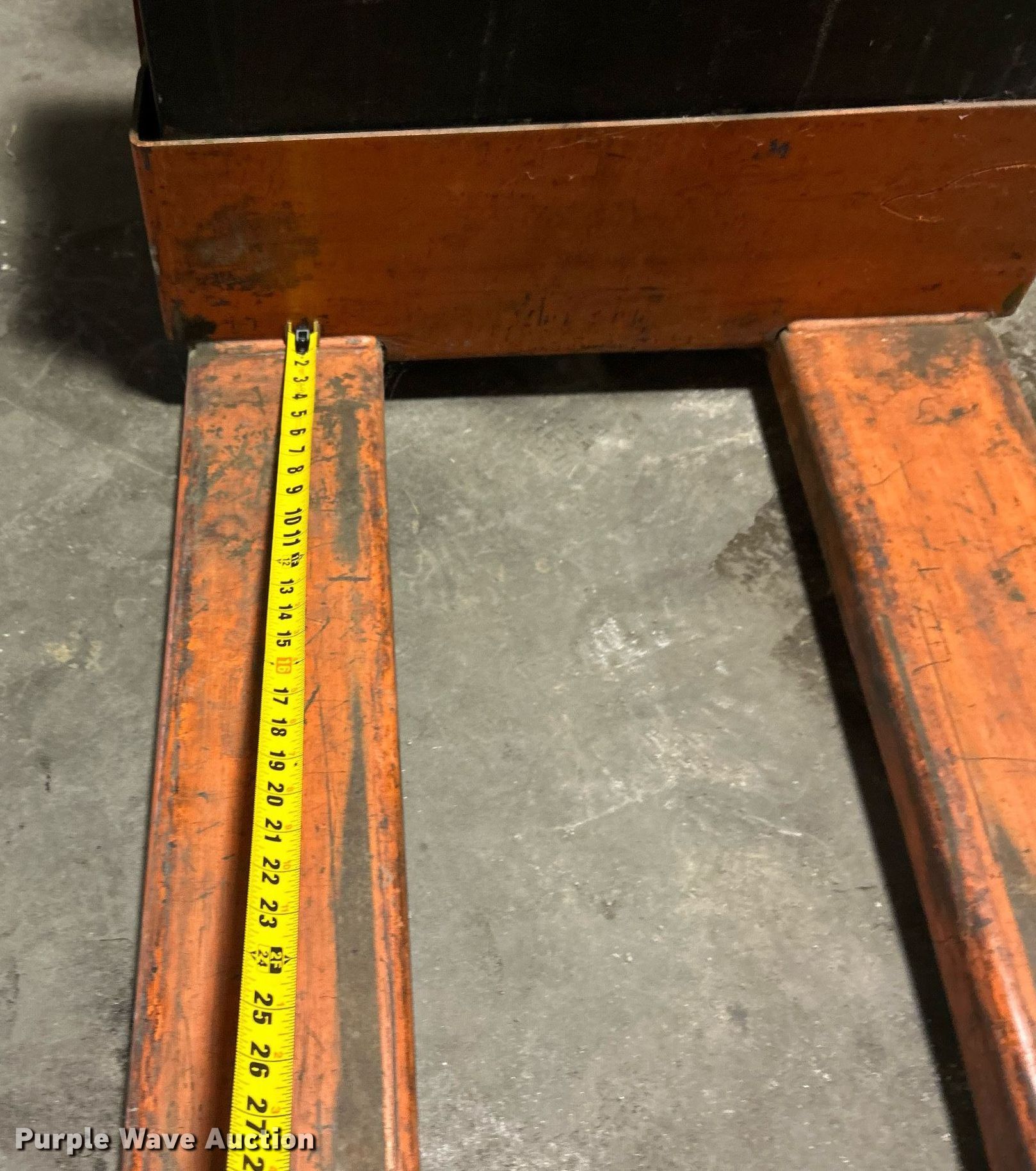 Toyota 7HBW23 pallet jack. Serial: 25022. Electric Motor Volts: 24, Phase: Single. Features Maximum lift capacity: 4,500 lbs, Fork length: 45". Notes Non-operational unit. 15107 North 137th East Avenue. Collinsville, OK 74021