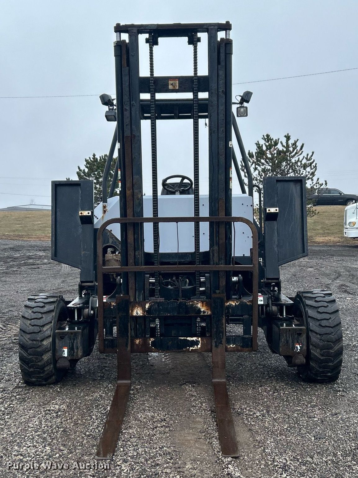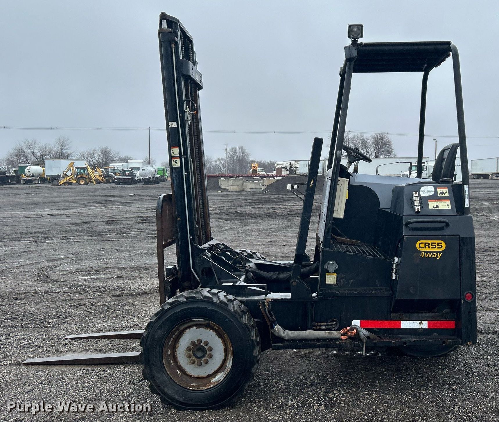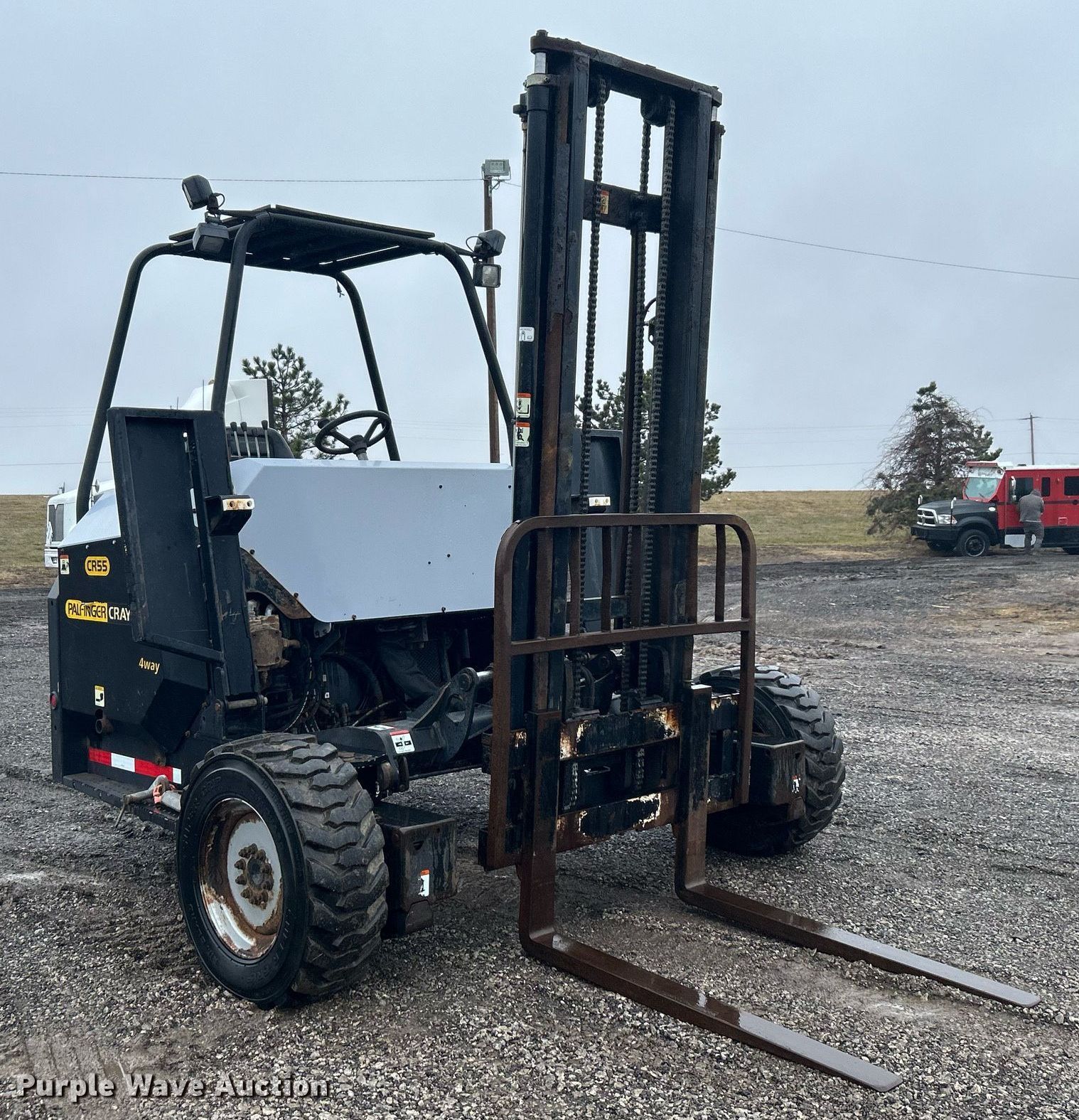 2014 Palfinger CR55 forklift. Hours: 321 on meter, Serial: 100177874. Engine Deutz D2011L041, Cylinders: 3, Fuel type: Diesel, HP: 64, kW: 47.5. Transmission Hydrostatic. Operators station Canopy. Features Maximum lift capacity: 5,500 lbs, Mast stages: 2, Mast tilt, Fork length: 47". Tires Front: 10-16.5 NHS, Rear: 31x15.5-15. 15107 North 137th East Avenue. Collinsville, OK 74021