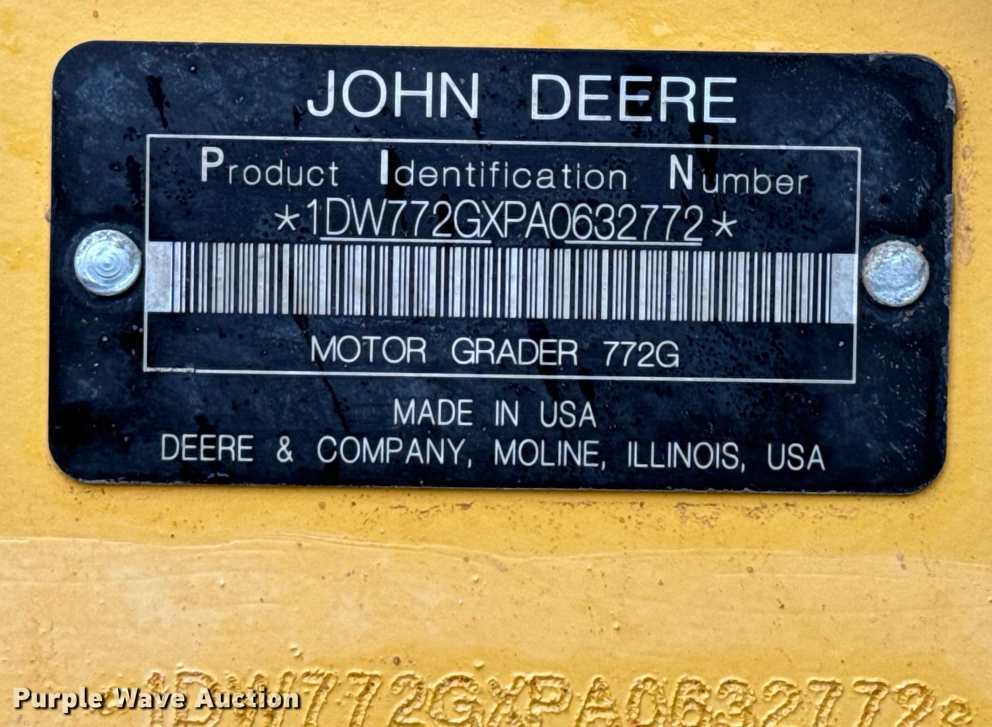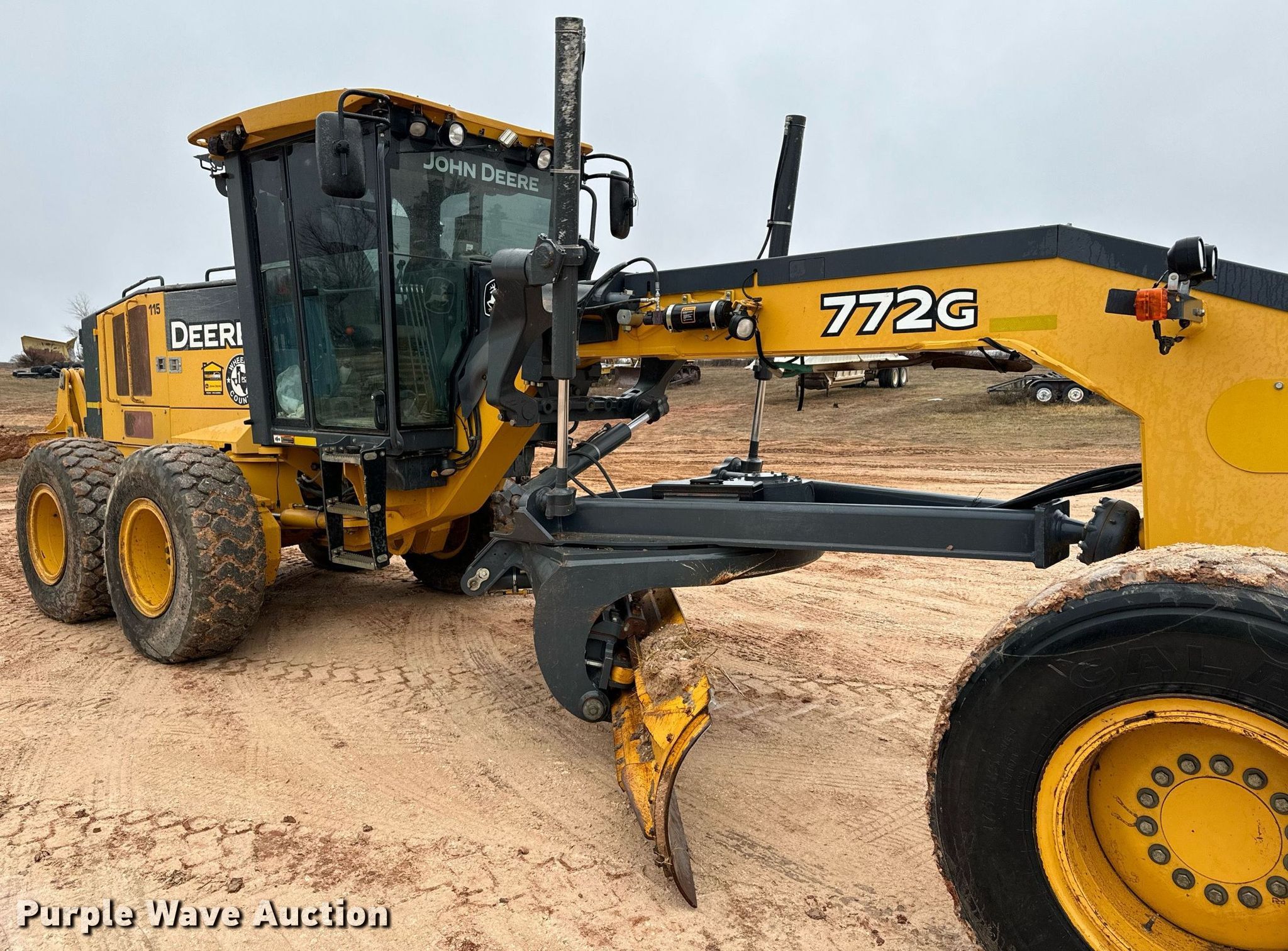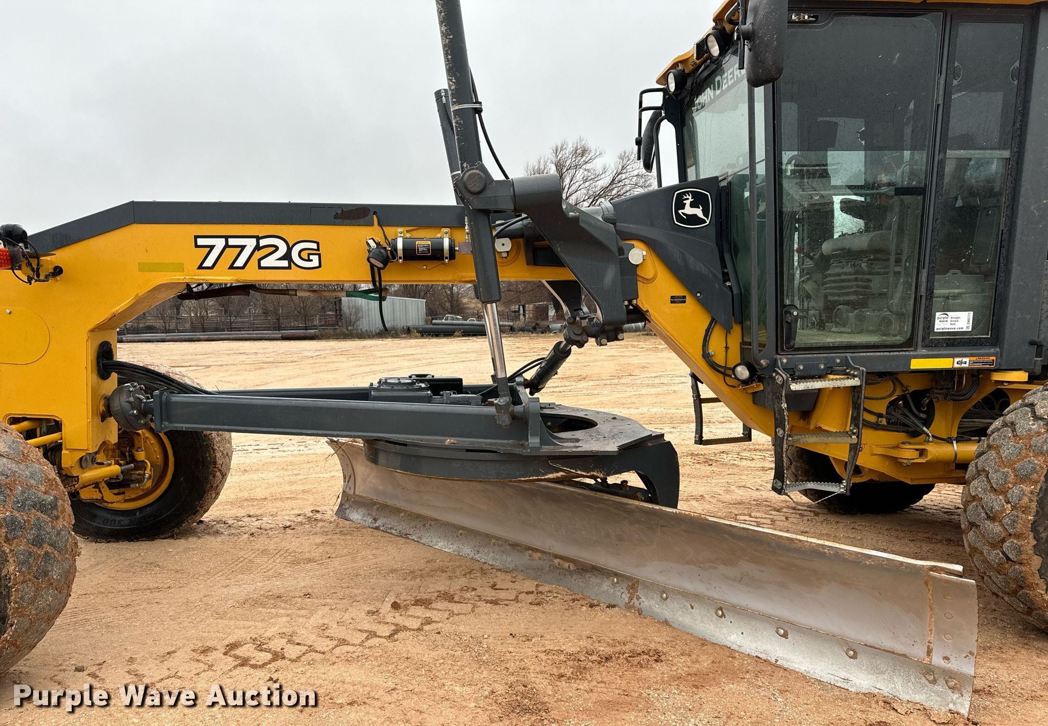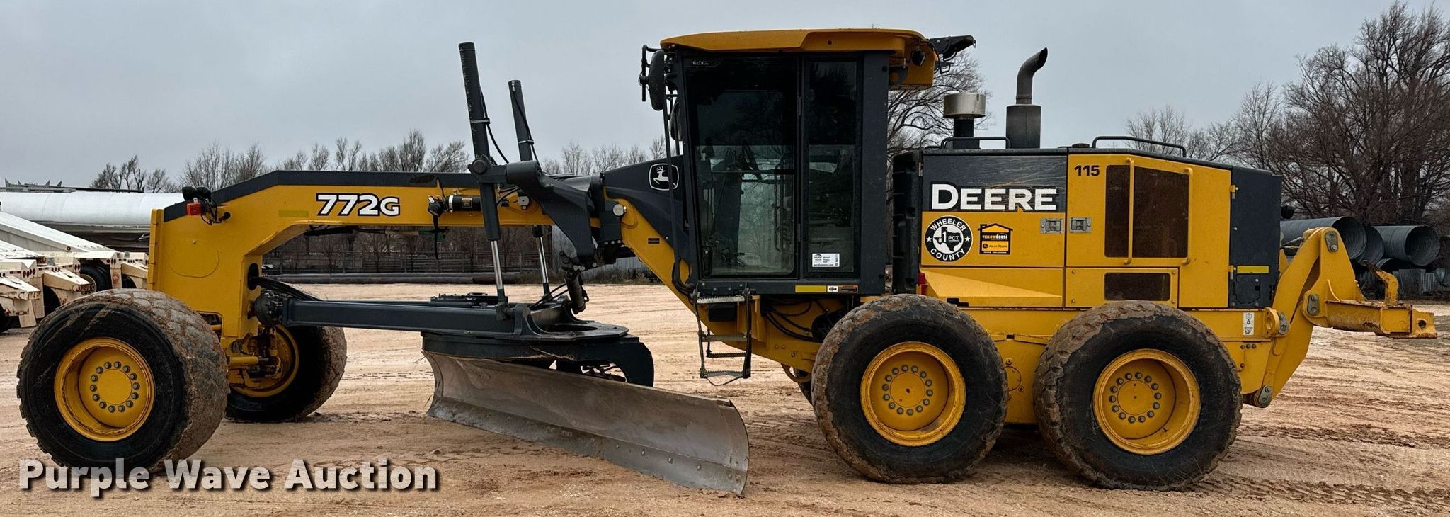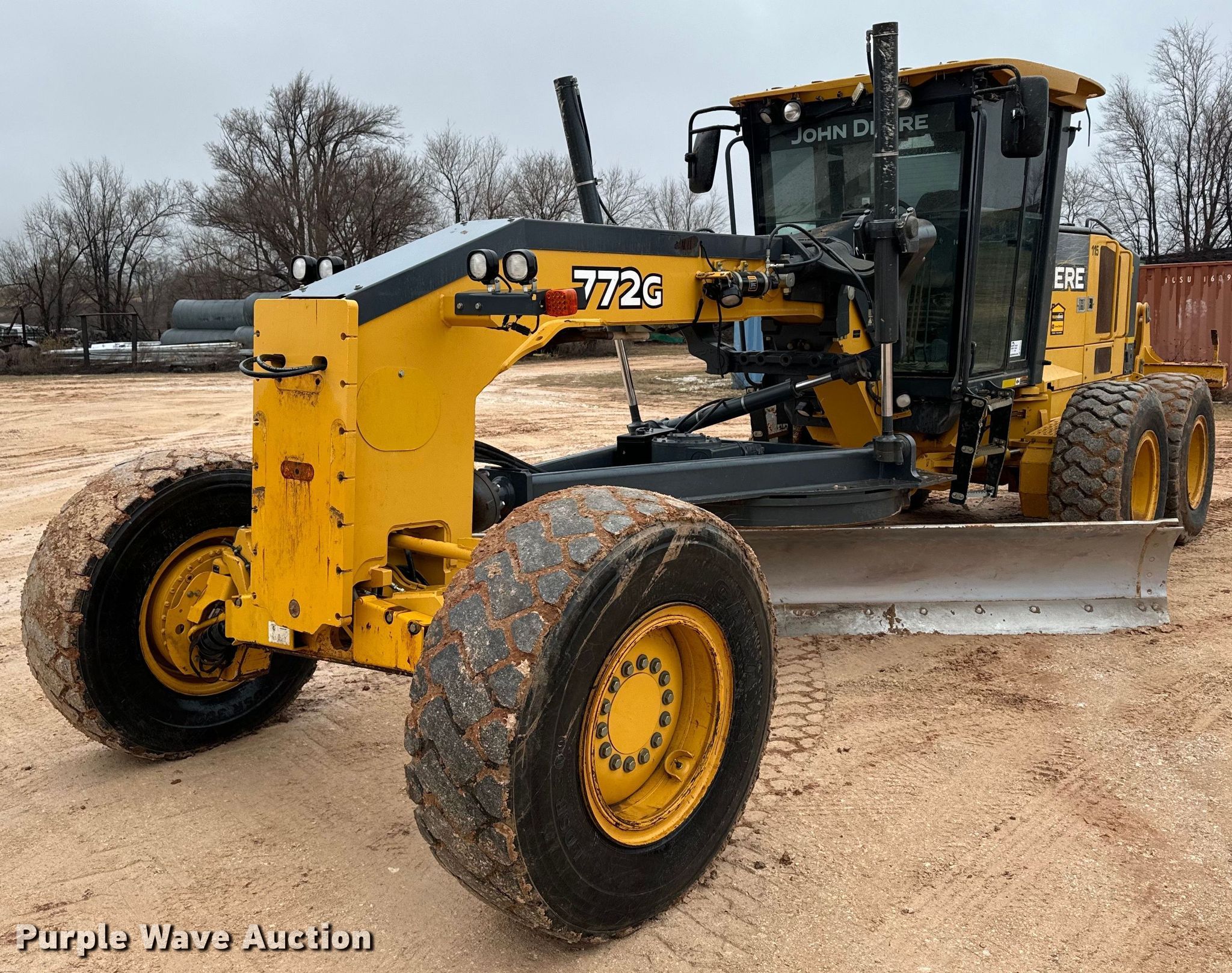Purple Wave is selling a used Motor Grader in Texas. This item is a 2011 John Deere 772G motor grader with the following: Hours: 5,491 on meter, Serial: 1DW772GXPA0632772