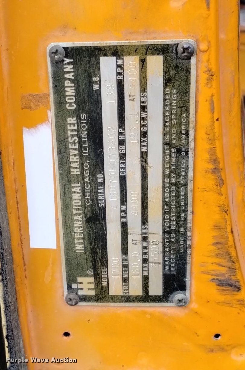 1971 International Loadstar 1700 dump truck. Miles: 275,175 on odometer, VIN: 416070H073602. Engine International, Cylinders: 8, Fuel type: Gas. Transmission Manual, Speed: 5. Chassis Axles: Single, Suspension: Spring, Brakes: Hydraulic, PTO. Interior Heat. Features Tailgate spreader, Dump bed Heil A610-1153, Capacity: 4 cu.yd., 9' x 94" W, Side height: 25", Bed type: Steel, Ram: Single, End gate: Manual. Tires Size: 9.00-20. Notes Windshield chipped or cracked. Wyoming title. 504 White Mountain Road. Rock Springs, WY 82901