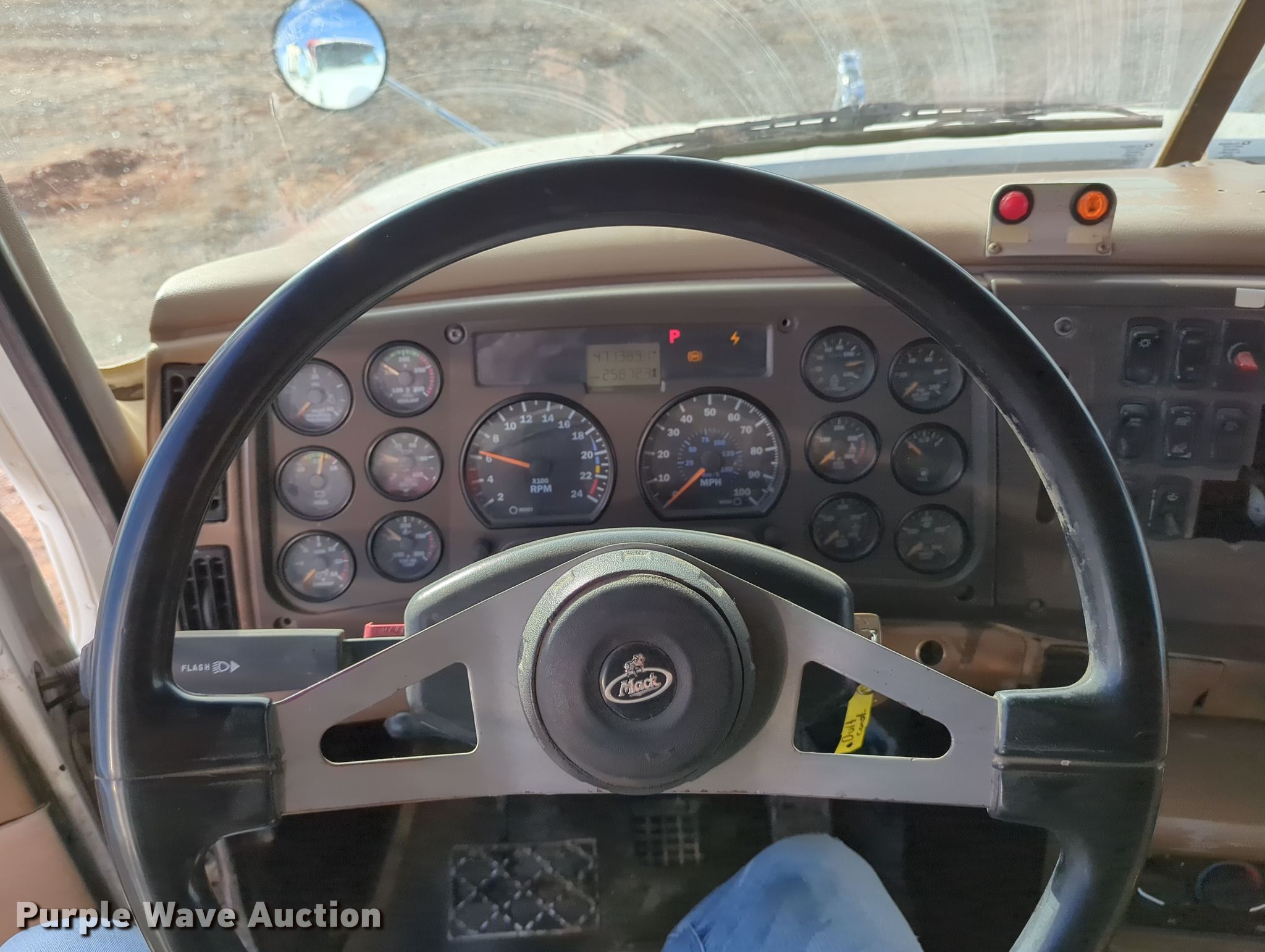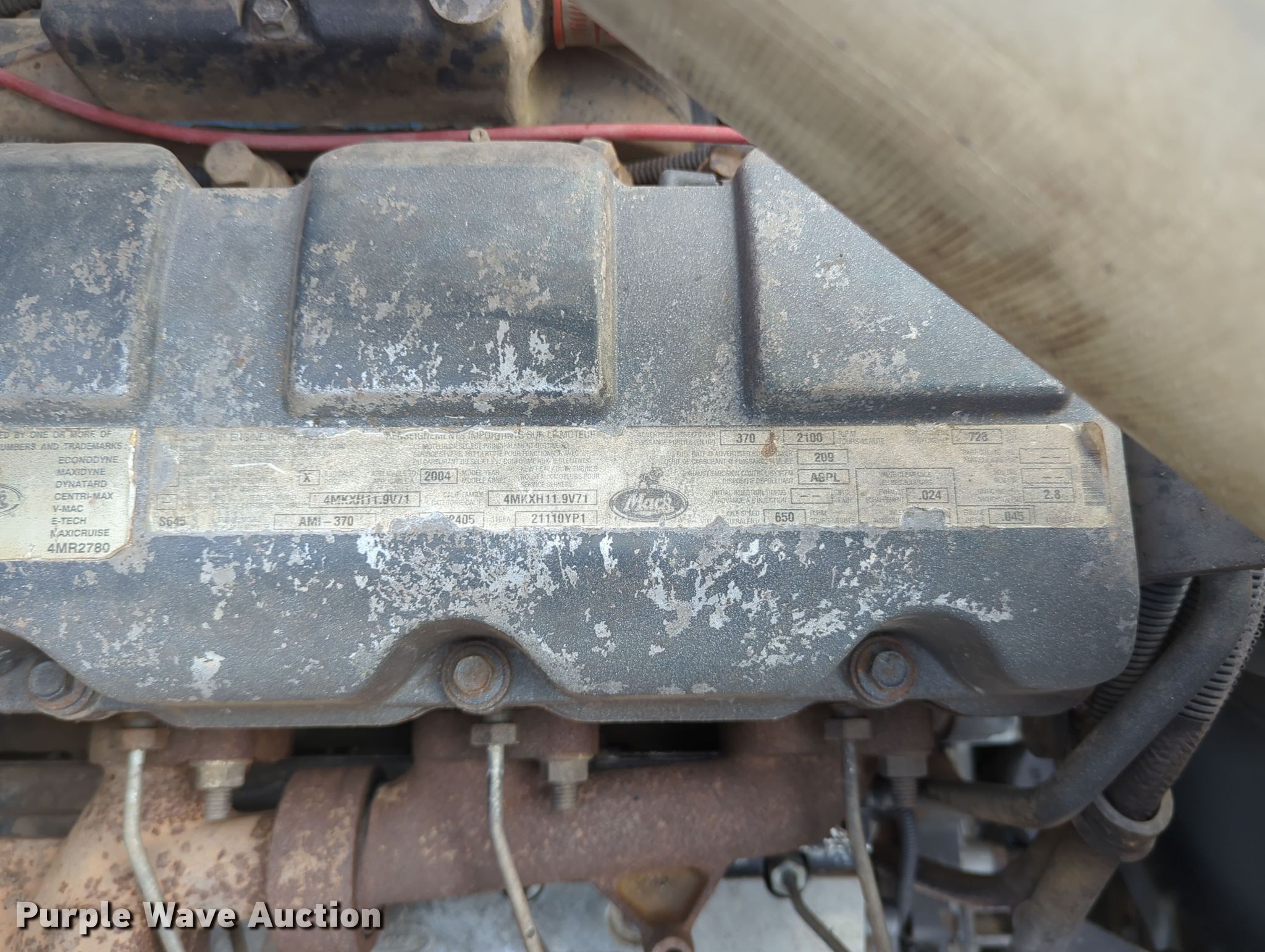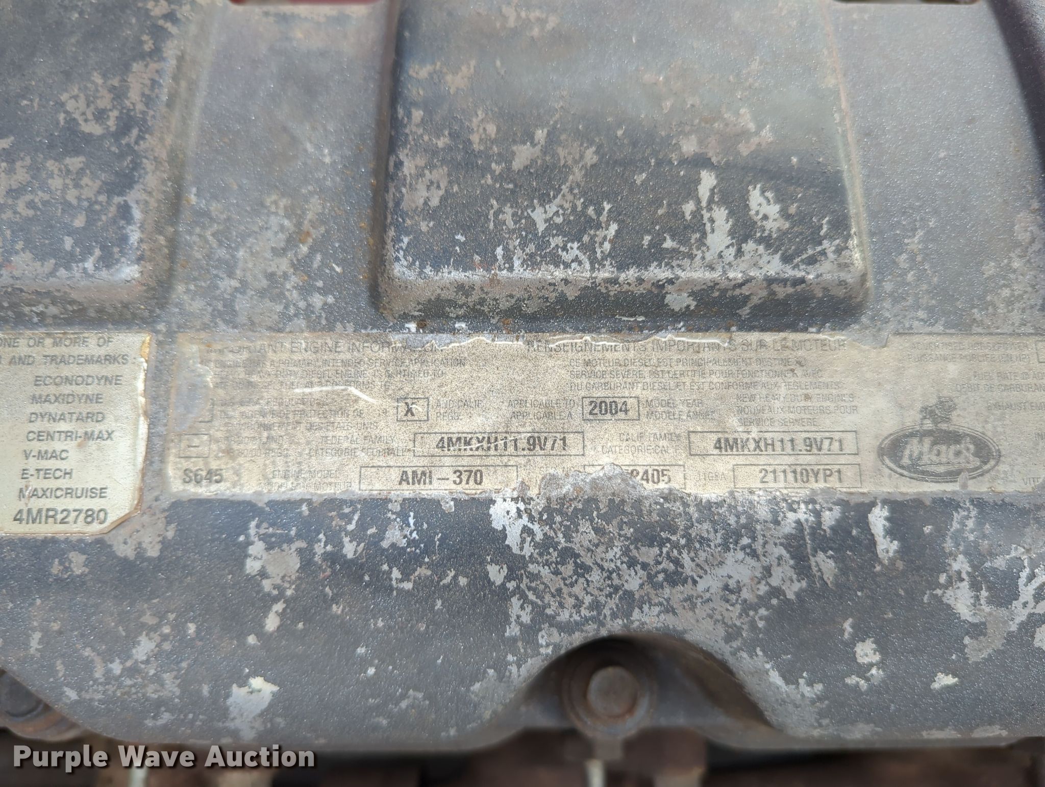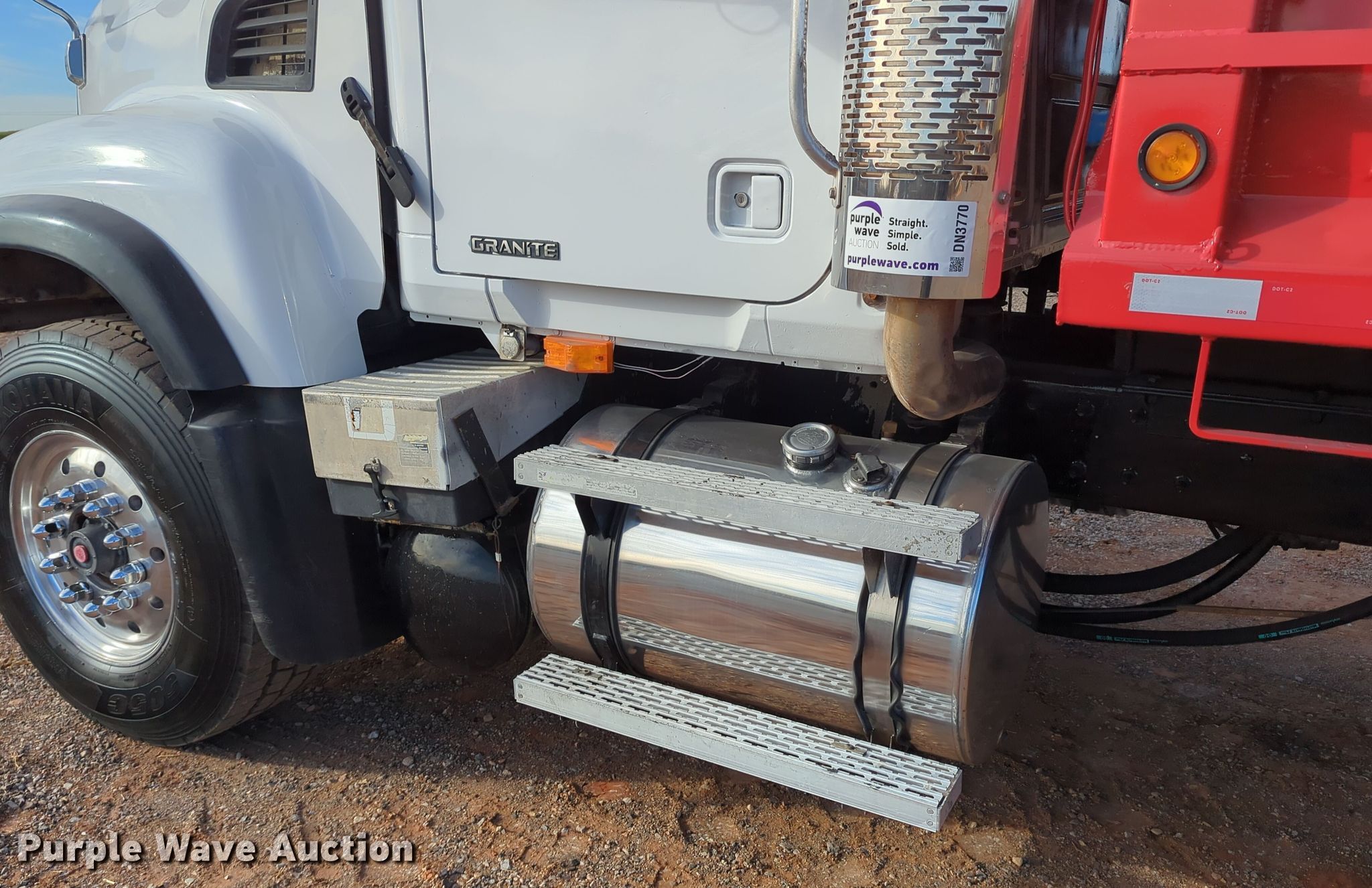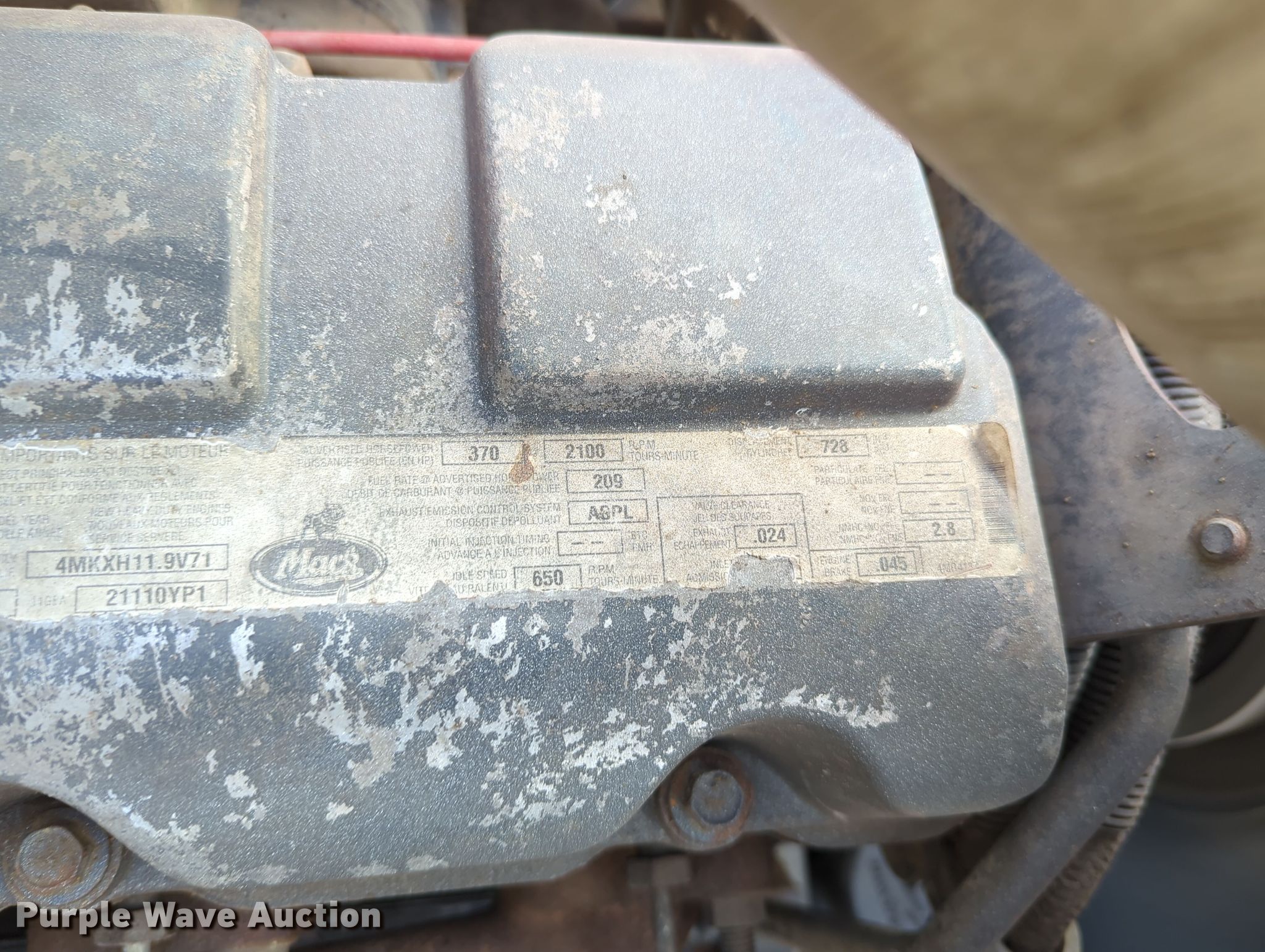 2005 Mack Granite CV713 dump truck. Miles: 471,389 on odometer, Hours: 25,872 on meter, VIN: 1M2AG11C05M018119, Unit #: 731.293. Engine Mack AMI-370, Displacement: 12.0L, Cylinders: 6, Fuel type: Diesel. Transmission Manual. Chassis Axles: Triple, Pusher axle, Differential lock: Inter-axle, Suspension: Camelback, Brakes: Air, PTO. Interior AC, Heat, Heated mirrors, Cruise control. Features Dump bed 16' L x 96" W, Side height: 45", Side board height: 8", Bed type: Steel, Roll tarp, Ram: Single, End gate: Air operated. Tires Front: 385/65R22.5, Rear: 11R24.5, Lift axle: 11R22.5. Oklahoma title. Title distribution may be delayed up to 30 days from verification of funds. Duit Holdings, Inc.. 7183 E Waterloo Industrial Road. Edmond, OK 73034