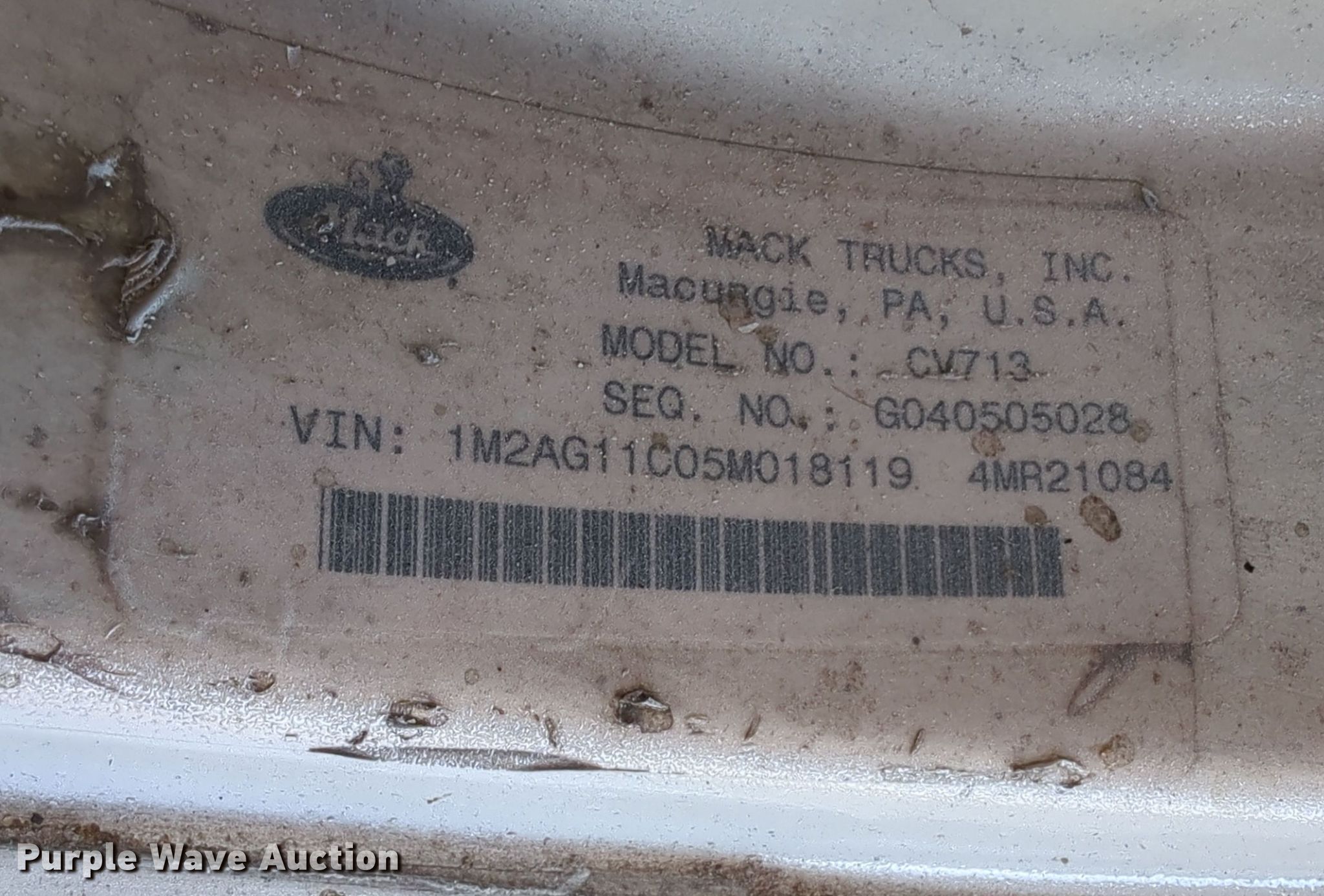 Purple Wave is selling a used Construction Dump Truck in Oklahoma. This item is a 2005 Mack Granite CV713 dump truck with the following: Miles: 471,389 on odometer, Hours: 25,872 on meter, VIN: 1M2AG11C05M018119, Unit #: 731.293