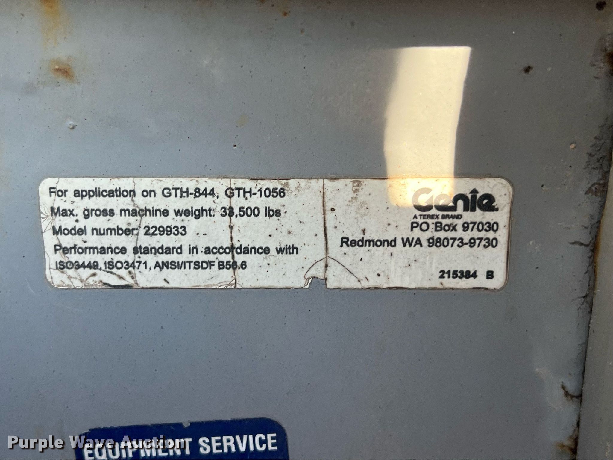2014 Genie GTH-844 telehandler. Hours: Unknown, Last known hours: 3,053 on January 2024, Serial: GTH081418697. Engine Deutz, Serial: 11496769, Displacement: 3.621L, Cylinders: 4, Fuel type: Diesel. Transmission Powershift, 3F - 3R, Four wheel drive. Operators station Steering: Crab, Four wheel. Features Maximum lift capacity: 8,000 lbs, Boom stages: 3, Fork length: 48", Hydraulic leveling, Quick attach: Manual. Tires Size: 13,00-24, Foam filled. Notes Non-operational display. Plunkett Enterprises. 965 South Front Street. Angleton, TX 77515