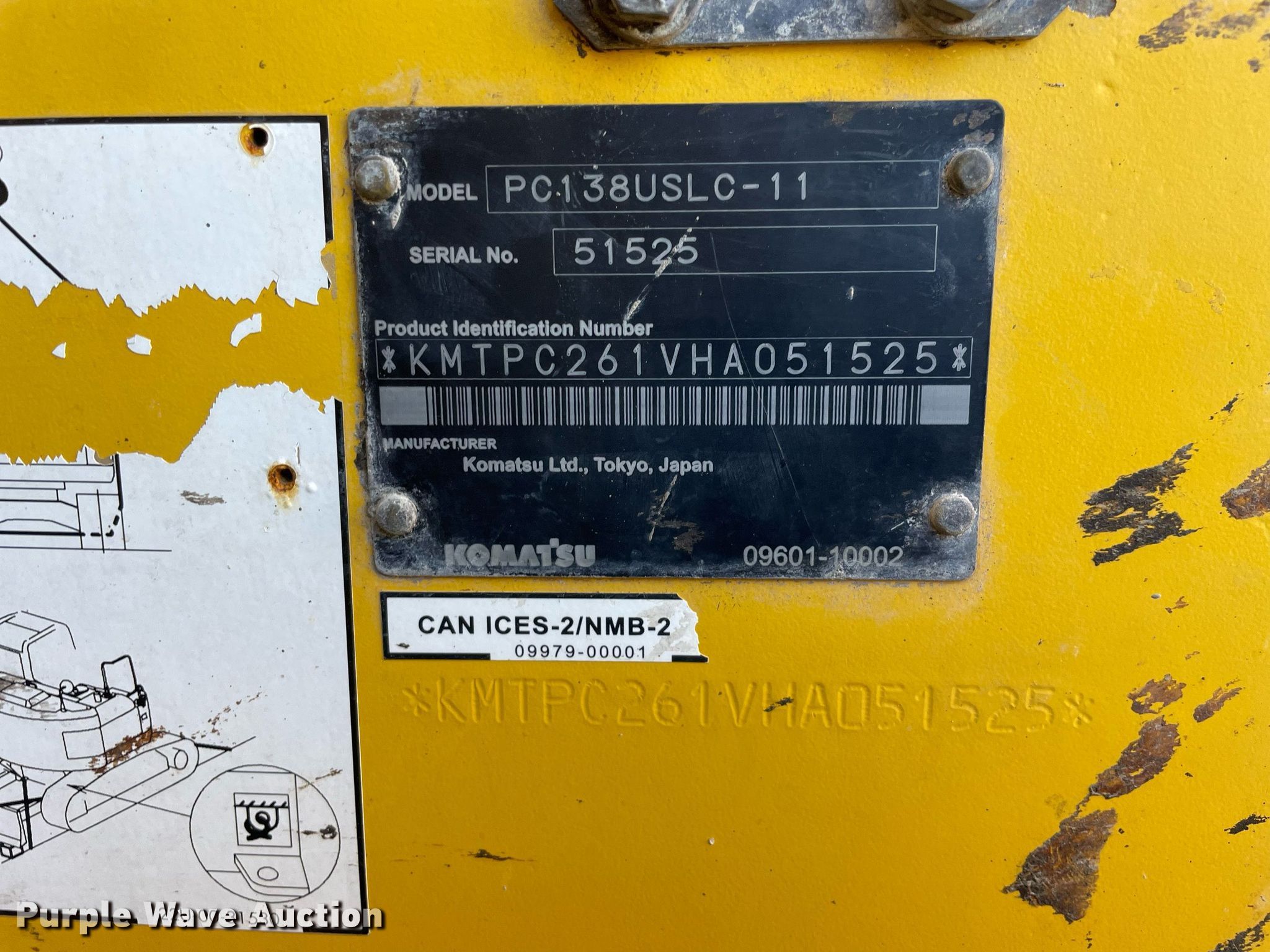 Purple Wave is selling a used Hydraulic Excavator in Pennsylvania. This item is a 2018 Komatsu PC138USLC-11 excavator with the following: Hours: 11,880 on meter, Serial: KMTPC261VHA051525, Unit #: 85006