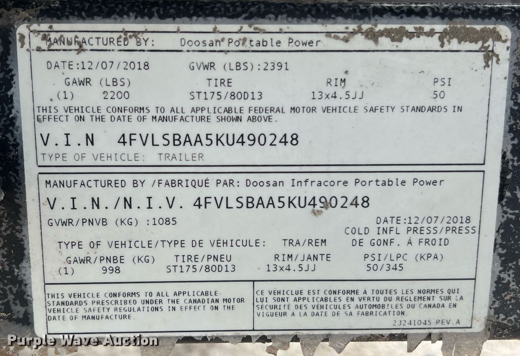 Purple Wave is selling a used Light Plant in Texas. This item is a 2018 Doosan light plant with the following: Hours: 5,322 on meter, VIN: 4FVLSBAA5KU490248