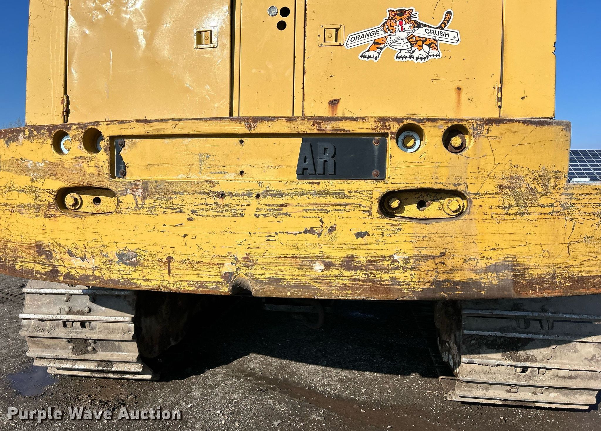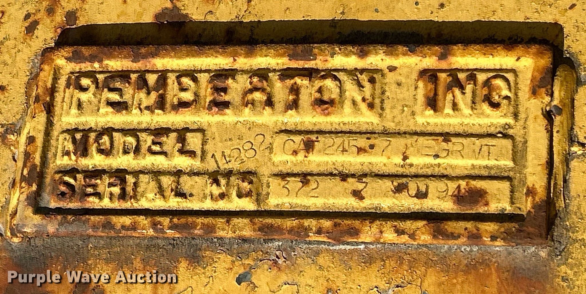 1984 Caterpillar 245 excavator. Hours: 2,591 on meter, Serial: 95V01134, Unit #: 3122. Engine Caterpillar 3406, Serial: 70V17576, Cylinders: 6, Fuel type: Diesel. Transmission Hydrostatic. Operators station Enclosed cab. Features Counter weights, Removable, Boom Standard, Stick Stick length: 14' 6", Bucket Width: 74", Teeth: 5, Pulverizer Width: 57", Grapple Width: 66". Tracks Width: 36", Steel, Grouser pads: Double. Notes Glass cracked, Engine door issues, does not latch, Hydraulic cylinder leak, Left side bottom roller missing. ORANGE CRUSH, LLC. 505 Rock Road Drive. East Dundee, IL 60118