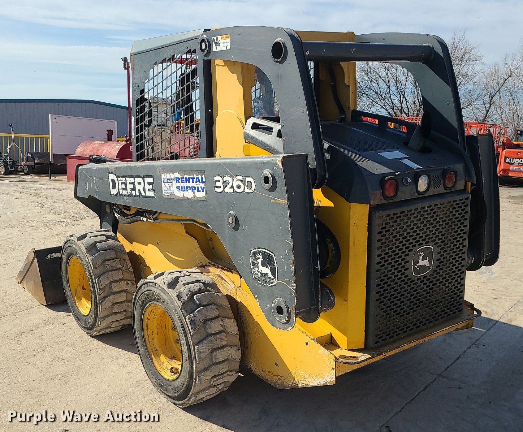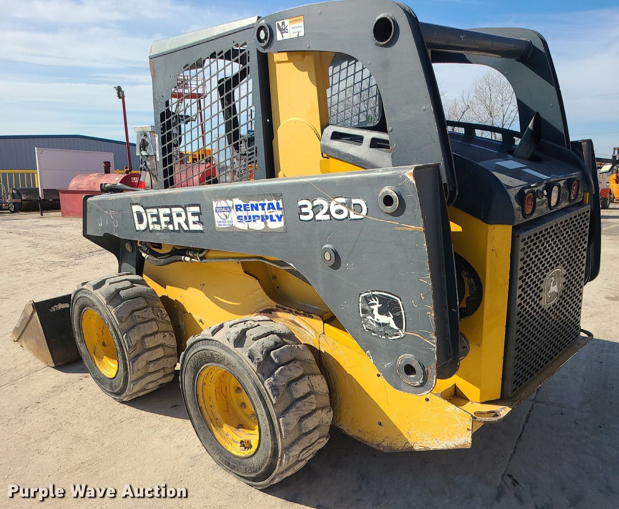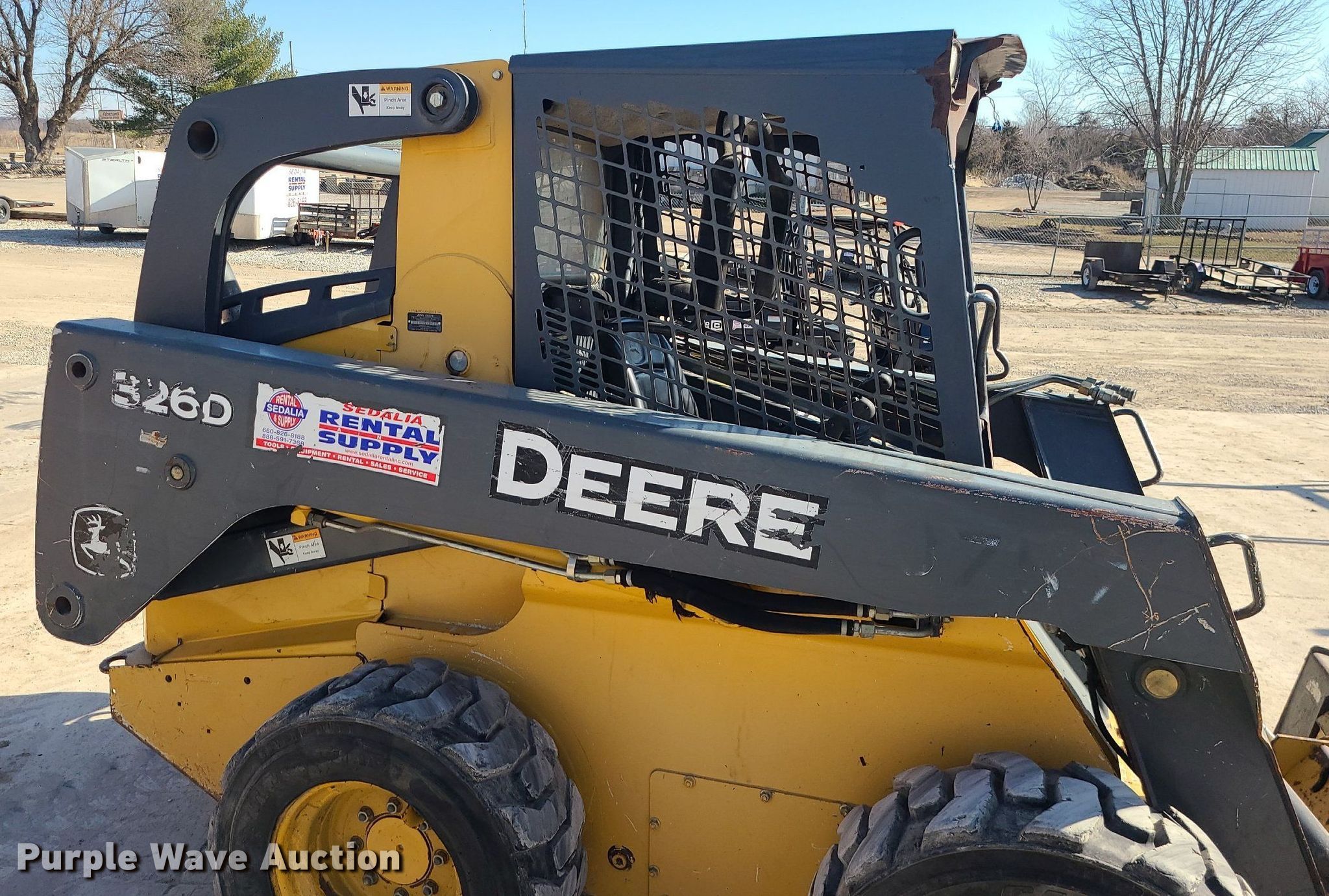 2012 John Deere 326D skid steer loader. Hours: 2,016 on meter, Serial: 1T0326DJJCG231313. Engine Cylinders: 4, Fuel type: Diesel. Transmission Hydrostatic. Operators station OROPS, Bucket control: Hand. Features Auxiliary hydraulics, Quick coupler: Hydraulic, Bucket Width: 76". Tires Size: 12-16.5. Sedalia Rental & Supply. 21474 US-50. Sedalia, MO 65301