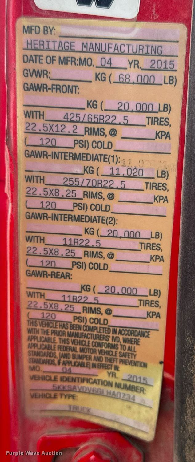 2016 Western Star 4700SF dump truck. Miles: 325,025 on odometer, Hours: 14,188 on meter, VIN: 5KKSAVDV6GLHA0734, Unit #: 5-226. Engine Detroit Diesel DD13, Displacement: 12.8L, Cylinders: 6, Fuel type: Diesel, Engine brake. Transmission Allison, Automatic. Chassis Axles: 4, Pusher axle Steerable, Differential lock: Full, Suspension: Spring over walking beam, Brakes: Air, PTO, GVWR: 68,000 lbs FAWR: 20,000 lbs, IAWR: 20,000 lbs, RAWR: 20,000 lbs, Lift axle GAWR: 11,020 lbs. Interior AC, heat, Heated mirrors, Power windows, Cruise control. Features Dump bed Heritage, 17' 6" L x 99" W, Side height: 54", Side board height: 5", Bed type: Steel, Roll tarp, Ram: Single, End gate: Air operated. Tires Front: 425/65R22.5, Rear: 11/R22.5, Lift axle: 225/70R22.5. Notes Transmission, PTO, Hydraulic pump, Front axle drivelines, Carrier bearings replaced in August 2023., Air leak. View repairs. Missouri title. Title distribution may be delayed up to 30 days from verification of funds. Emery Sapp & Sons, Inc... 5670 N Hwy 763. Columbia, MO 65202