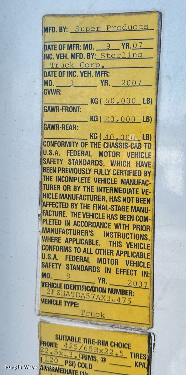 Purple Wave is selling a used Vacuum Truck in Missouri. This item is a 2007 Sterling sewer jetter truck with the following: Miles: 32,303 on odometer, VIN: 2FZHATDA57AX30475