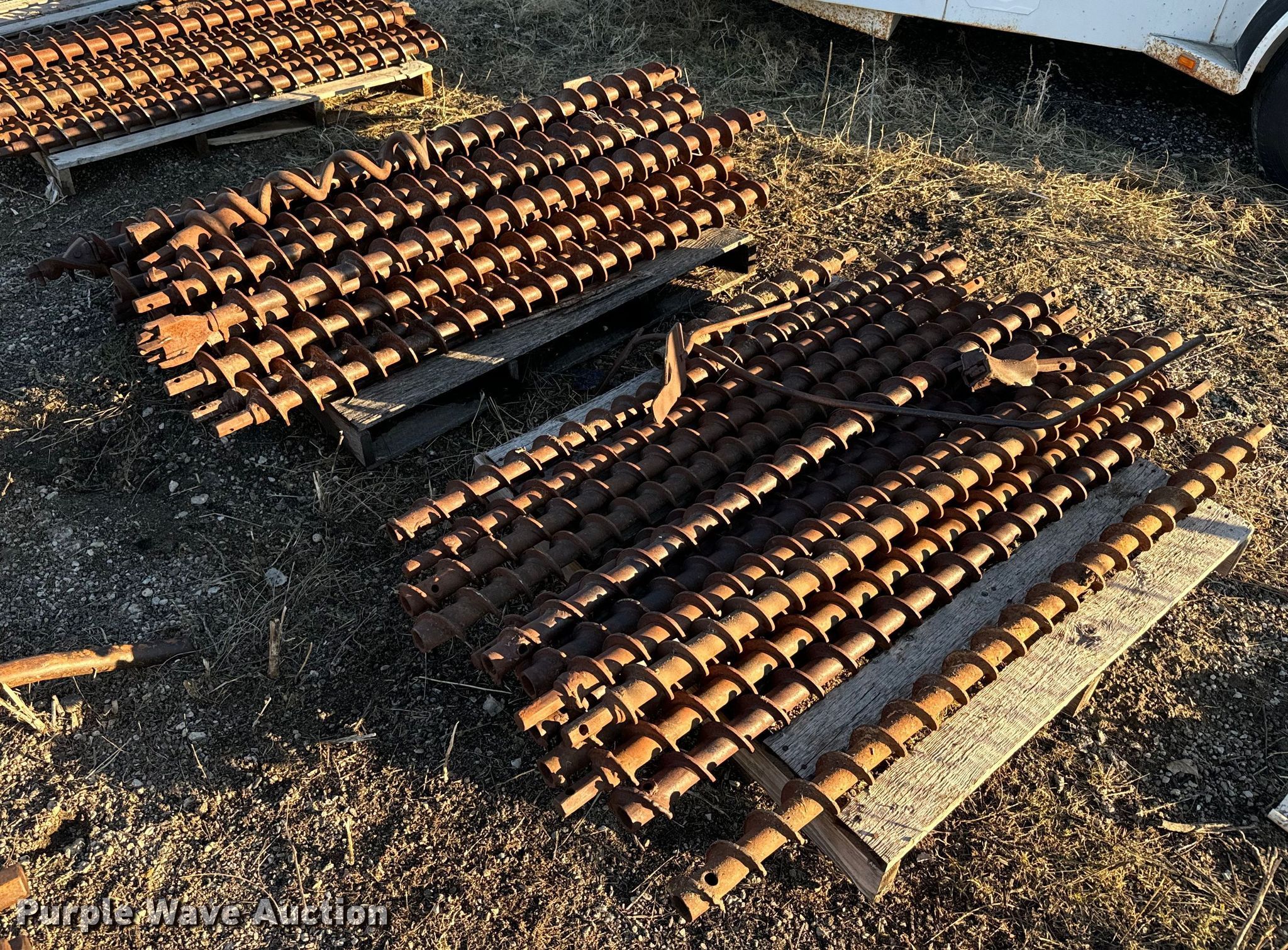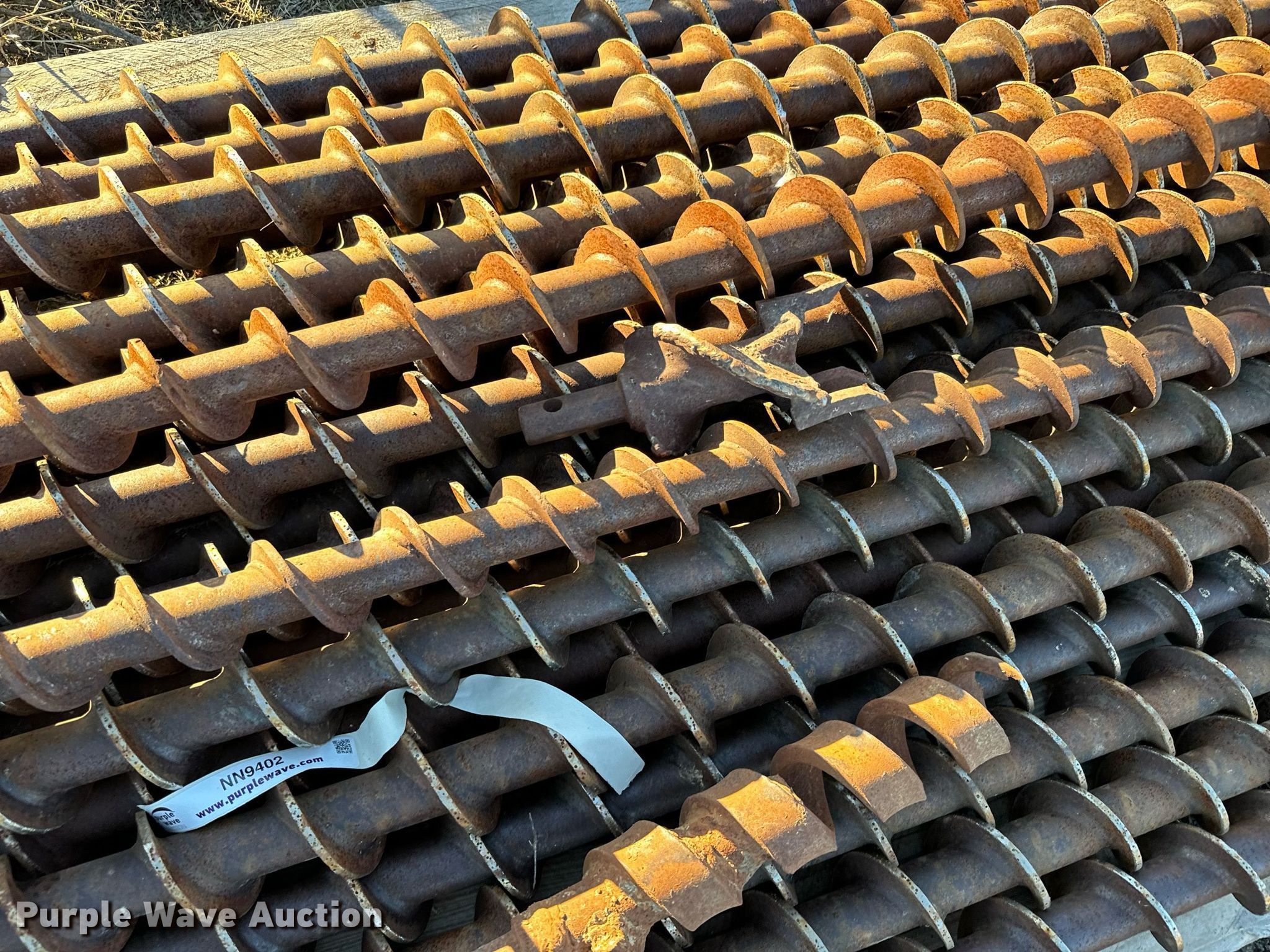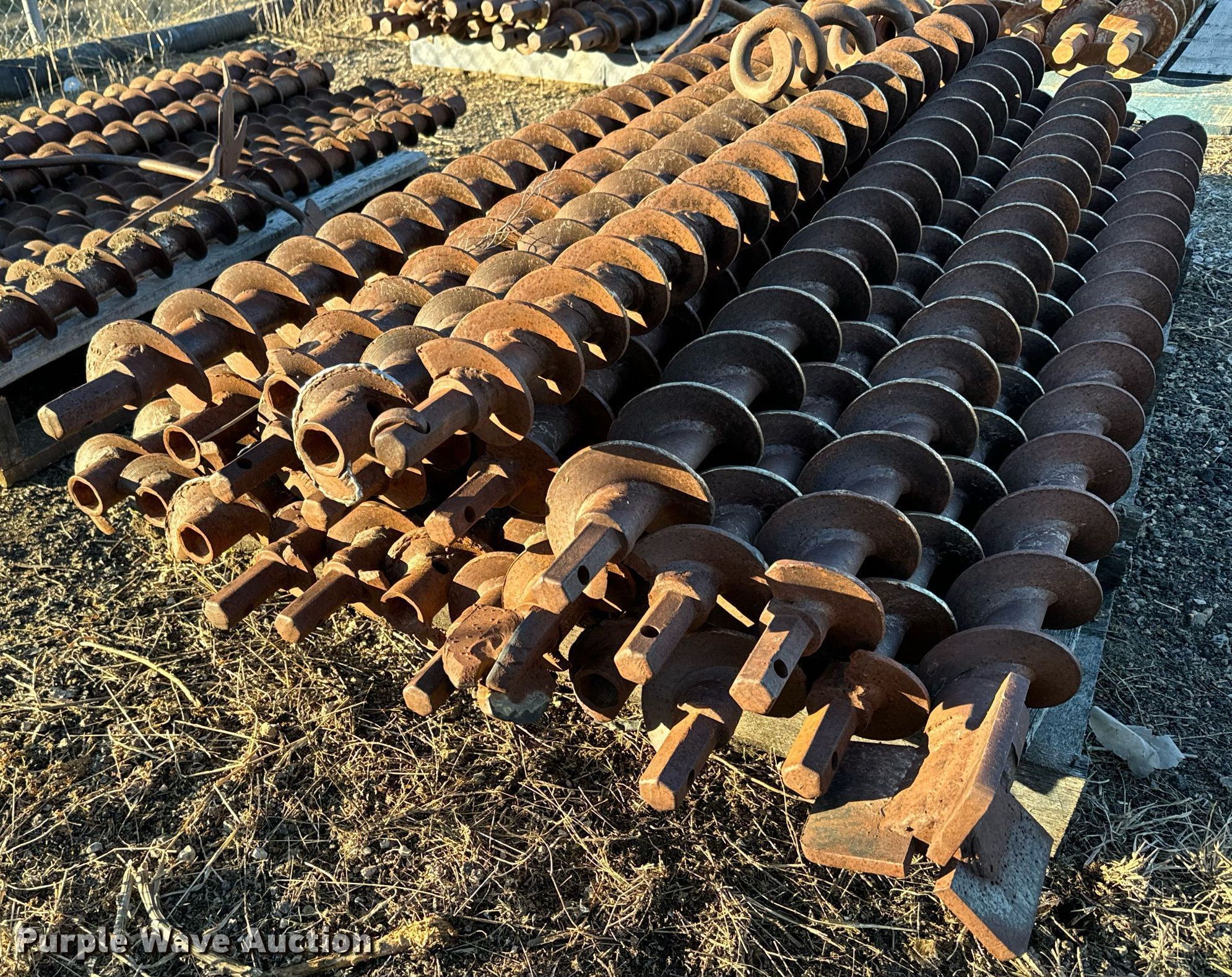 Purple Wave is selling a used Drill or Drilling Rig Attach. in Kansas. This item is a Approximately 59 solid stem auger bits with the following: Length: 5', Connection: 1 1/8" hex, Approx. (22) diameter: 3 1/2", Approx. (14) diameter: 3", Approx. (22) diameter: 4"