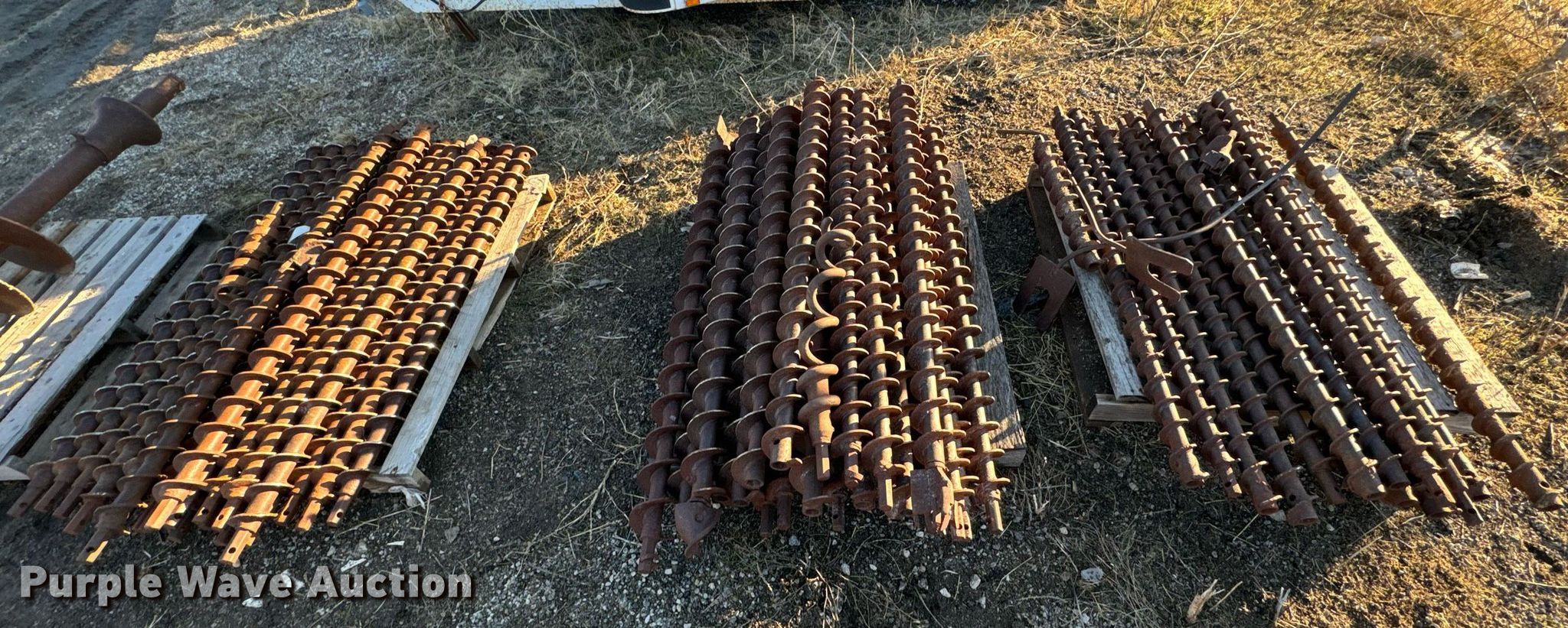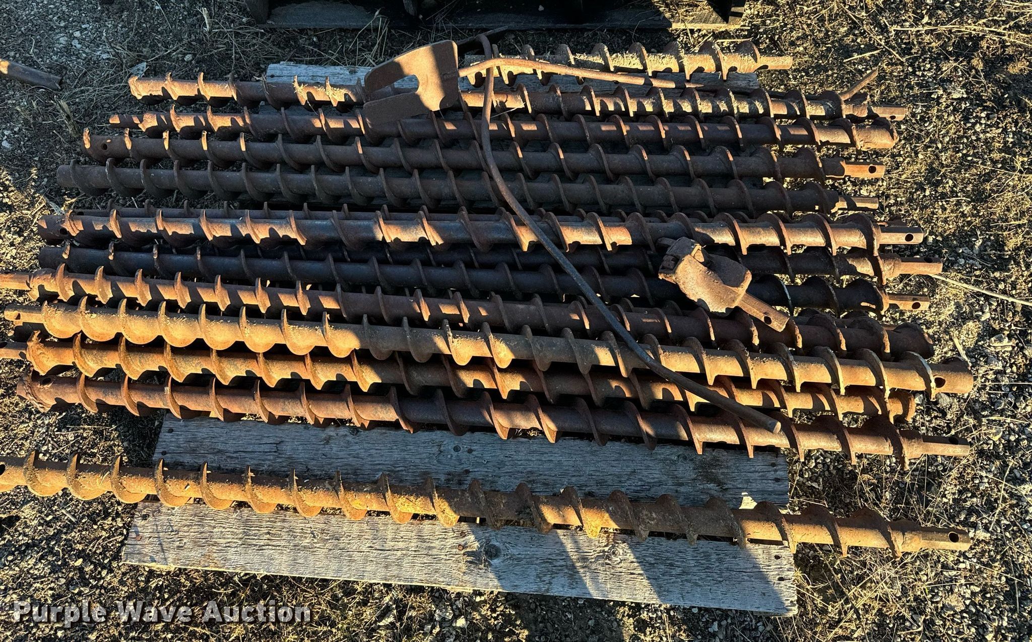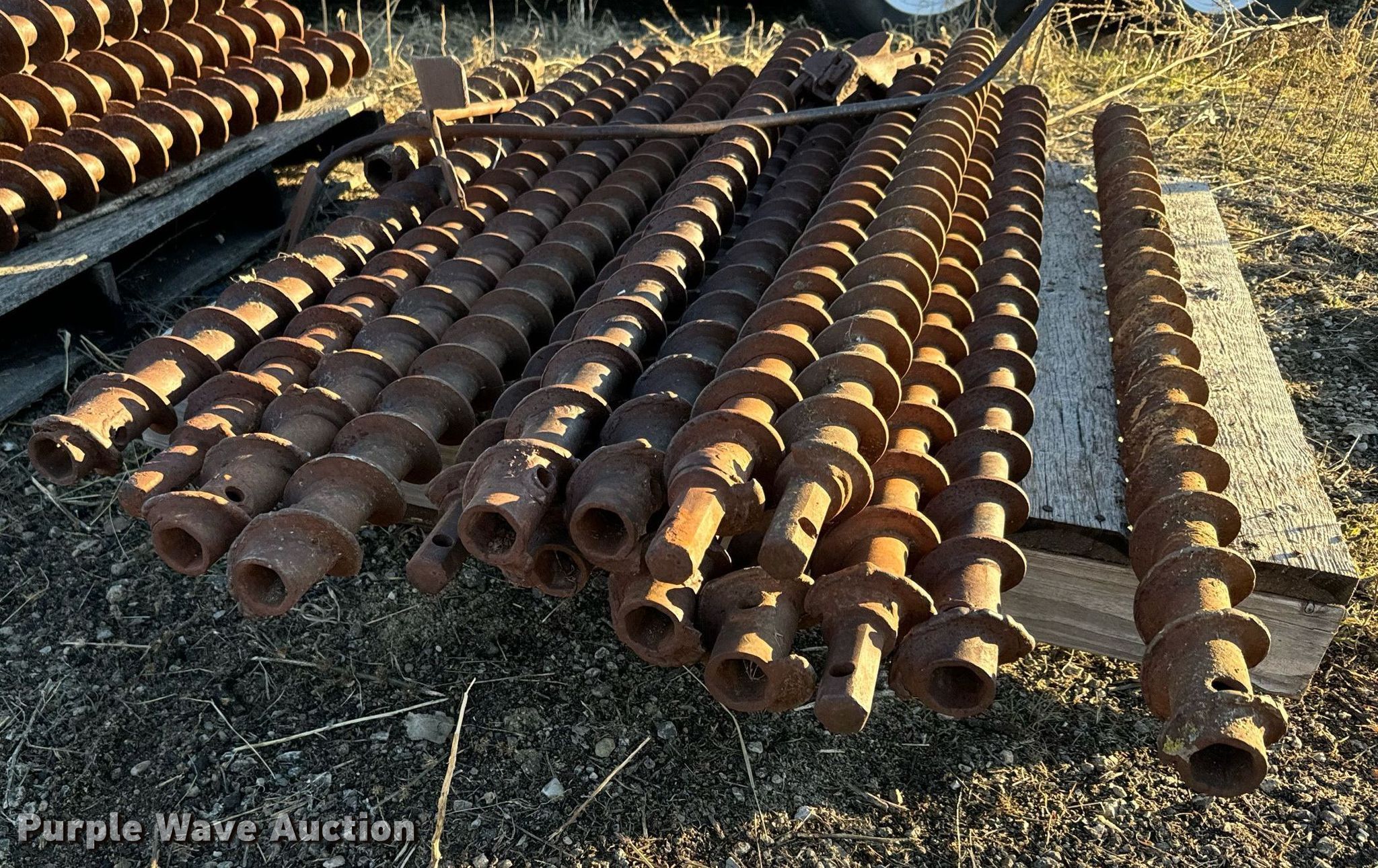 Purple Wave is selling a used Drill or Drilling Rig Attach. in Kansas. This item is a Approximately 59 solid stem auger bits with the following: Length: 5', Connection: 1 1/8" hex, Approx. (22) diameter: 3 1/2", Approx. (14) diameter: 3", Approx. (22) diameter: 4"