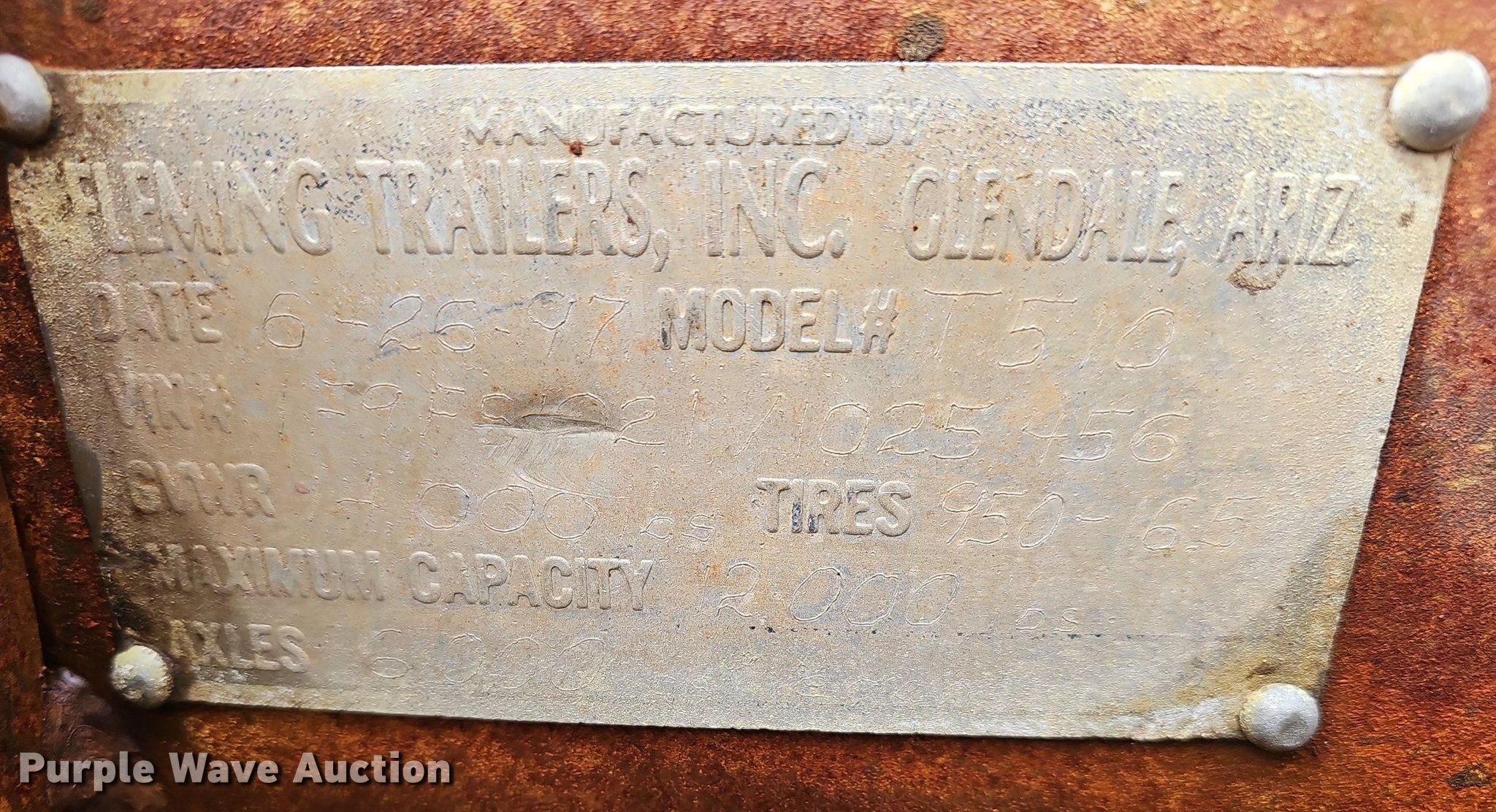 Purple Wave is selling a used Tank Trailer in Missouri. This item is a 1997 Fleming T510 vacuum trailer with the following: Hours: Unknown, VIN: 1F9FS1021V1025456