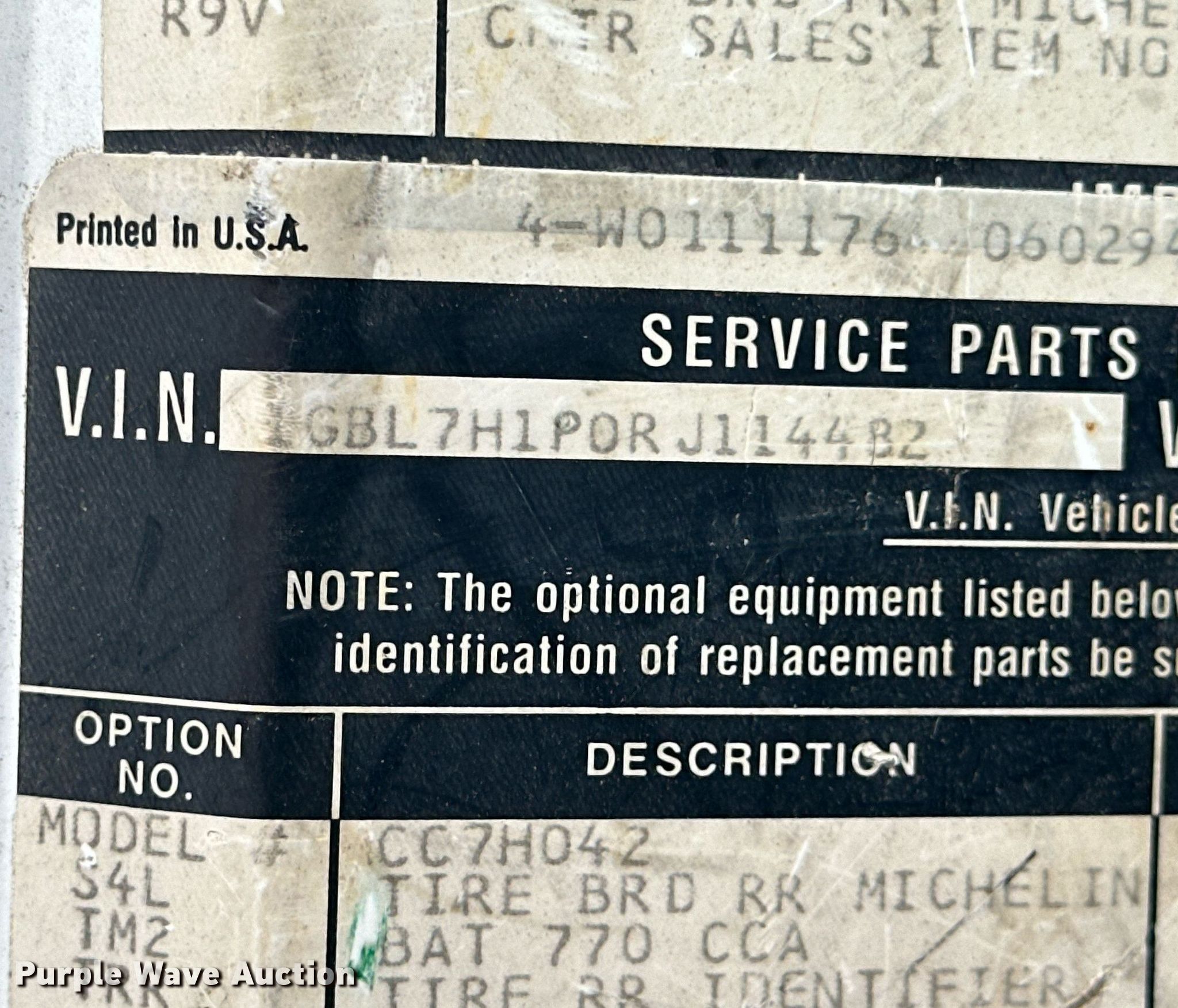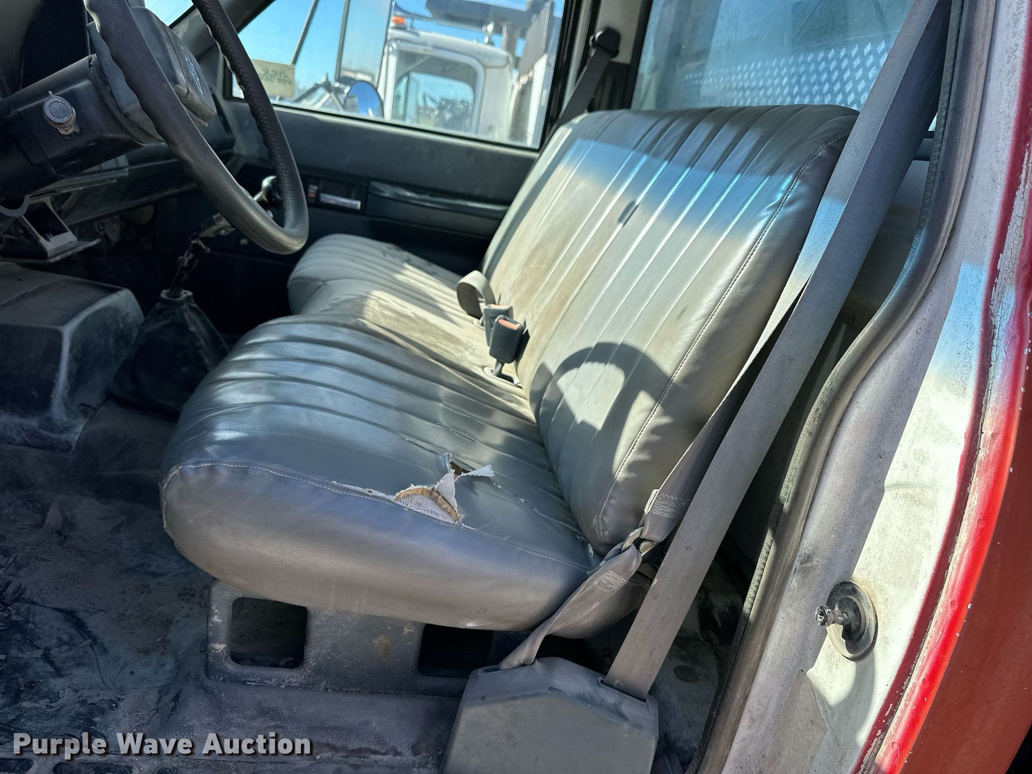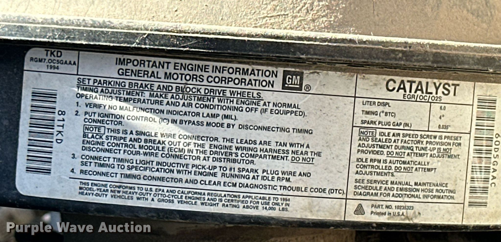 1994 Chevrolet Kodiak dump flatbed truck. Miles: 73,809 on odometer, VIN: 1GBL7H1P0RJ114482, Unit #: 2661. Engine Displacement: 6.0L, Cylinders: 8, Fuel type: Gas. Transmission Manual, Speed: 5, plus 2. Chassis Axles: Single, Suspension: Spring, Brakes: Hydraulic, GVWR: 30,000 lbs. Interior Heat. Features Dump flatbed 14' 4" L x 96" W. Tires Size: 11R22.5. Notes Drive shaft disconnected , Unknown operating condition. Nebraska title. Paulsen Inc.. 1116 US-30. Cozad, NE 69130