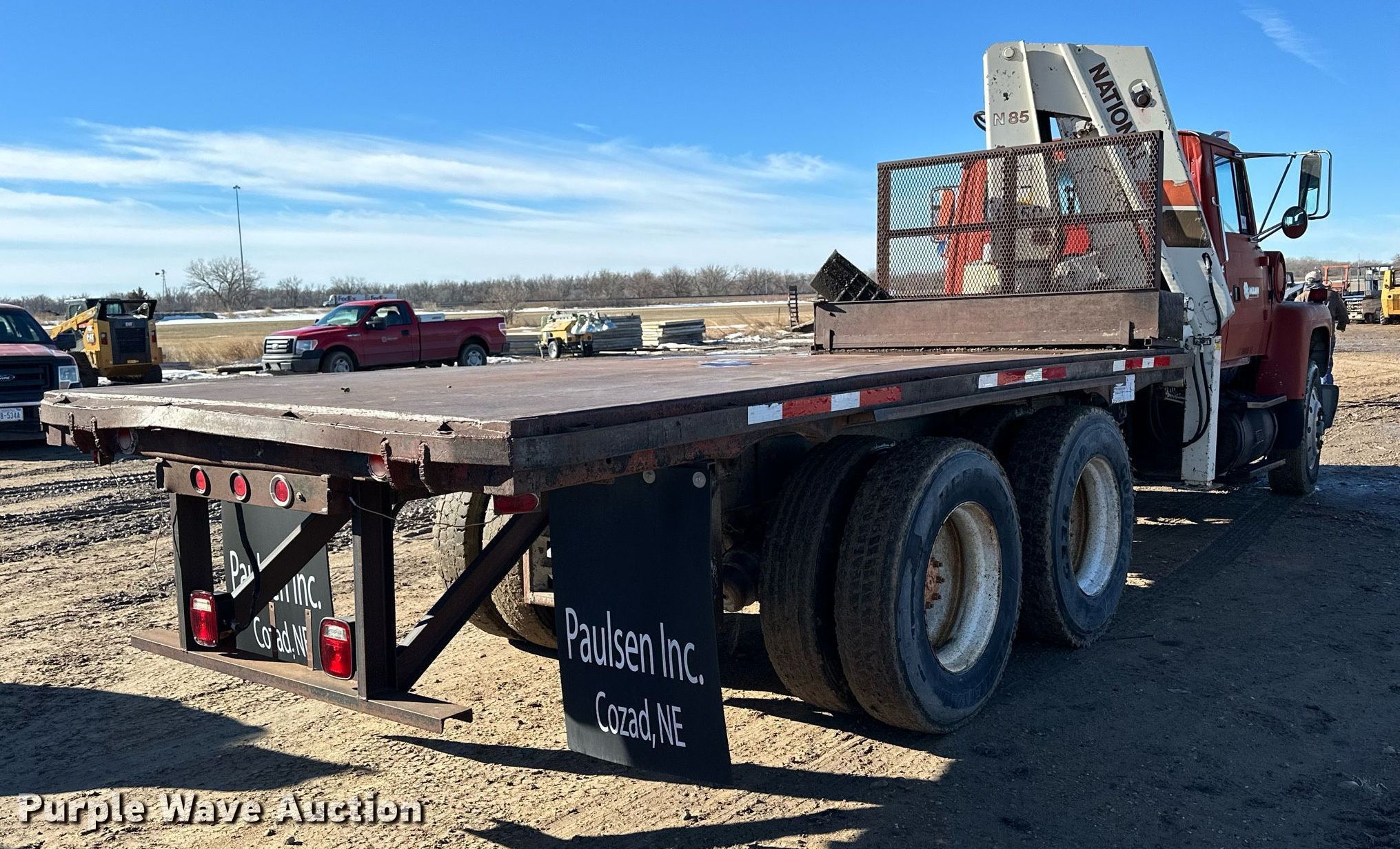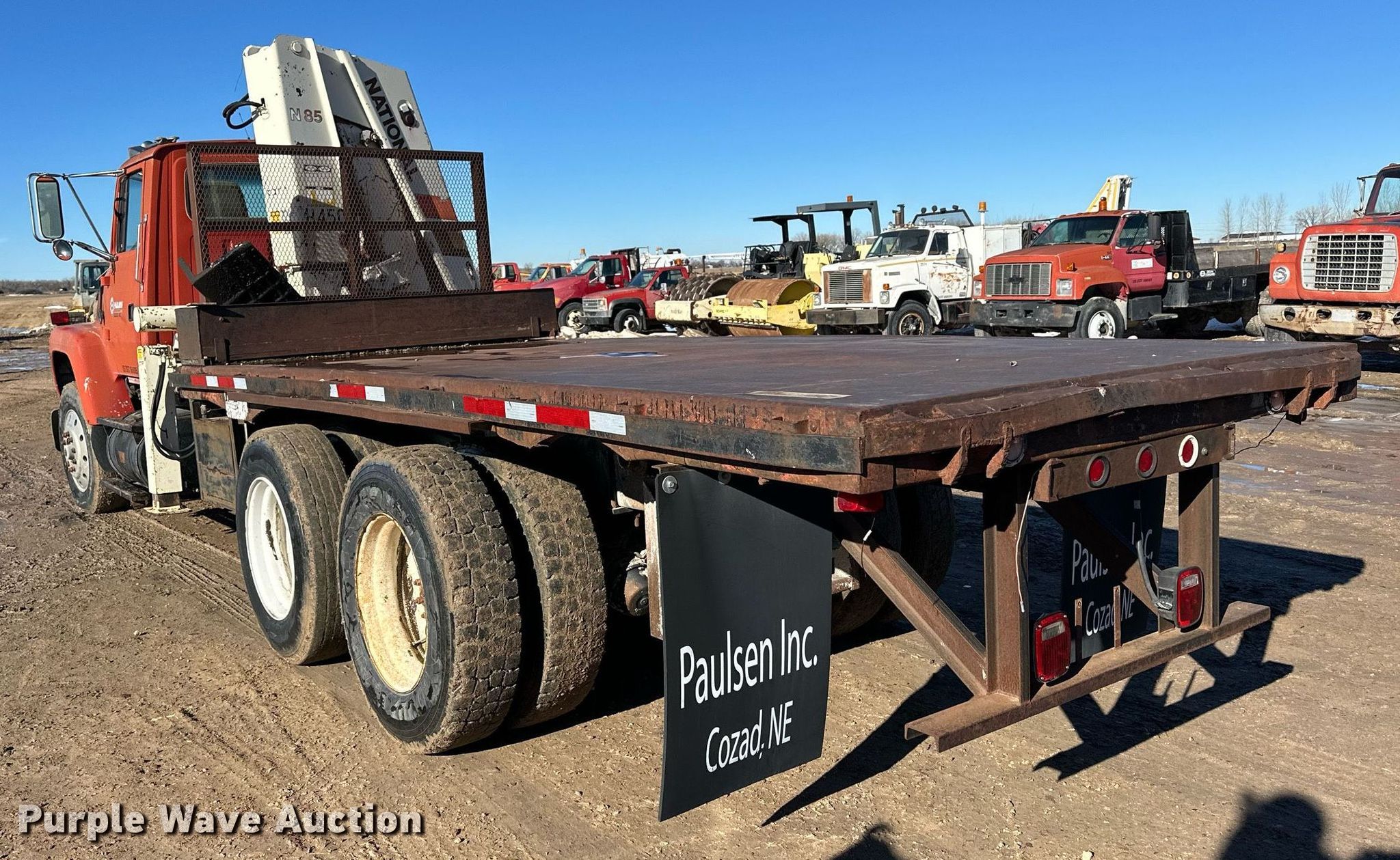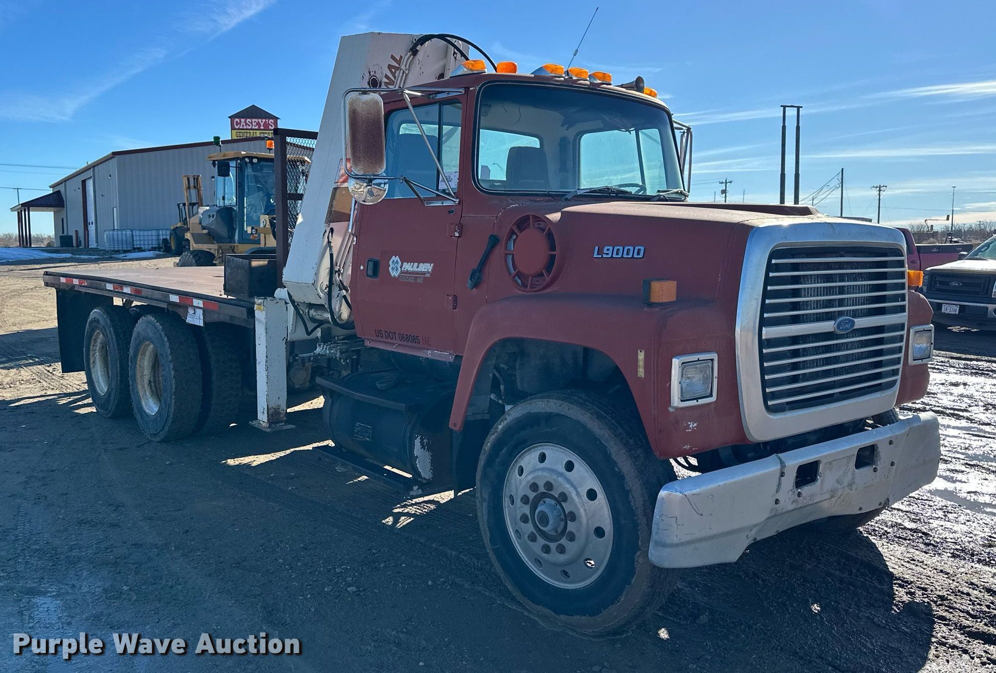 1994 Ford LT9000 crane truck. Miles: 20,420 on odometer, Hours: 9,687 on meter, VIN: 1FDYU90S4RVA50599, Unit #: 2660. Engine Caterpillar, Displacement: 10.0L, Cylinders: 6, Fuel type: Diesel. Transmission Manual. Chassis Axles: Tandem, Suspension: Spring, Brakes: Air, PTO, GVWR: 54,000 lbs, Wheelbase: 246". Interior Heat. Features Flatbed 208" L x 90" W, Crane National N85-H21 Serial: 17380, Boom Knuckle, Maximum boom length: 25' Sections: 4, Maximum lift capacity: 14,400 lbs, Jib: 6', Boom controls Ground, Lift chart. Tires Size: 11R24.5, Brand: General. Nebraska title. Title distribution may be delayed up to 14 days from verification of funds. Paulsen Inc.. 1116 US-30. Cozad, NE 69130