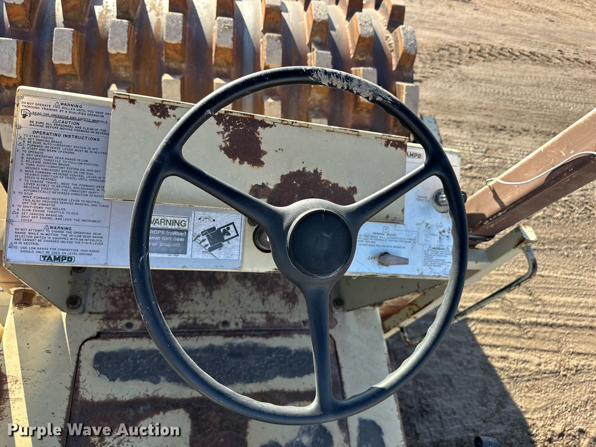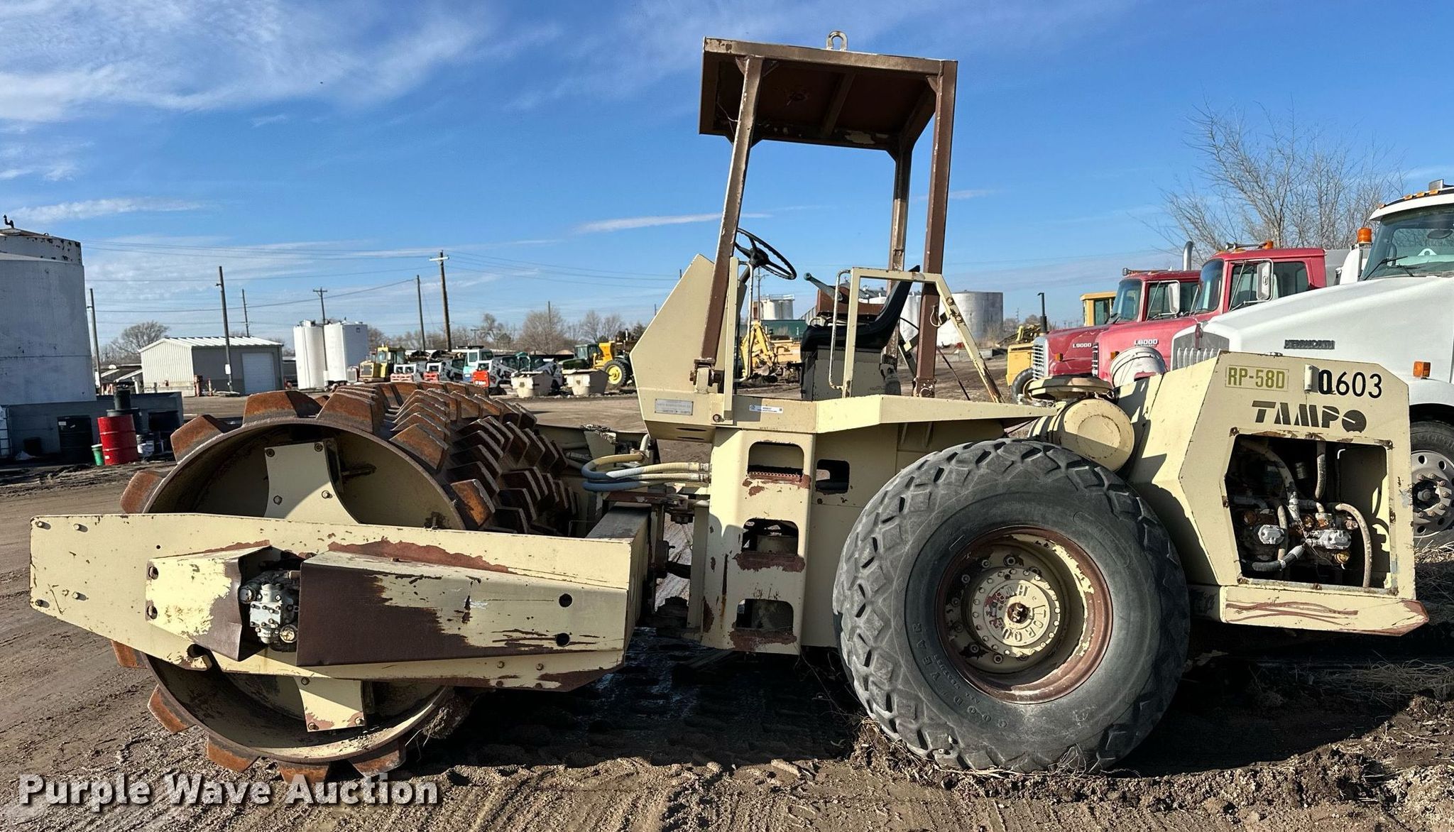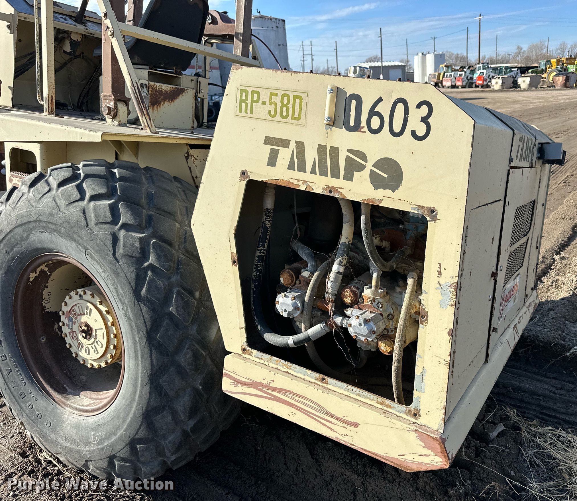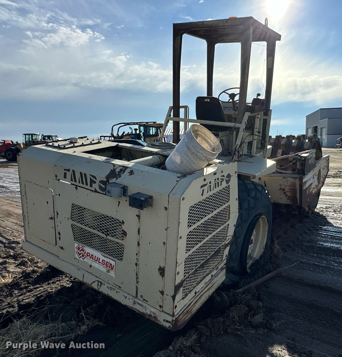 Tampo RP58D single drum vibratory roller. Serial: S84900073P, Unit #: 603. Engine Detroit Diesel, Cylinders: 3, Fuel type: Diesel. Transmission Hydrostatic, Two speed travel. Features Drum: Padfoot, Vibratory system: Single, Front drum Width: 84", Diameter: 58", Drum scrapers: Front. Tires Size: 23.1-26. Notes Rear tire flat, Engine issues , Non-operational unit. Paulsen Inc.. 1116 US-30. Cozad, NE 69130