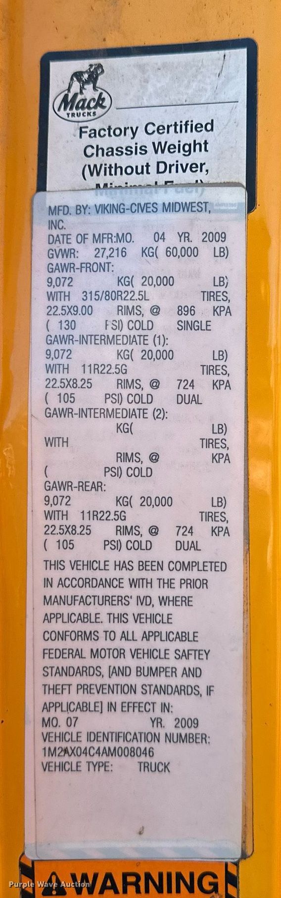 2010 Mack GU713 dump truck. Miles: 258,773 on odometer, VIN: 1M2AX04C4AM008046, Unit #: 8314. Engine Mack MP7, Displacement: 10.8L, Cylinders: 6, Fuel type: Diesel. Transmission Manual, Speed: 10. Chassis Axles: Tandem, Differential lock: Inter-axle, Suspension: Camelback, Brakes: Air, Front mount PTO, GVWR: 60,000 lbs FAWR: 20,000 lbs, IAWR: 20,000 lbs, RAWR: 20,000 lbs. Interior AC, Heat. Features Dump bed 15' L x 96" W, Side height: 36", Bed type: Steel, Roll tarp, Ram: Single, End gate: Air operated, Wing plow Width: 96". Tires Front: 315/80R22.5, Rear: 11R22.5. Notes Dash warning indicator: Check engine, Engine fault codes. Missouri title. Title distribution may be delayed up to 14 days from verification of funds. Missouri Department of Transportation-Northwest District. 3602 N Belt Hwy. Saint Joseph, MO 64506
