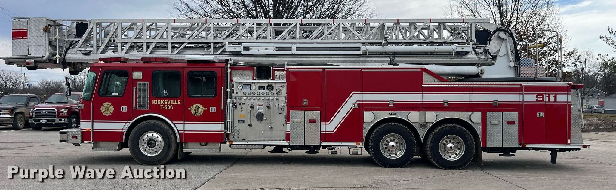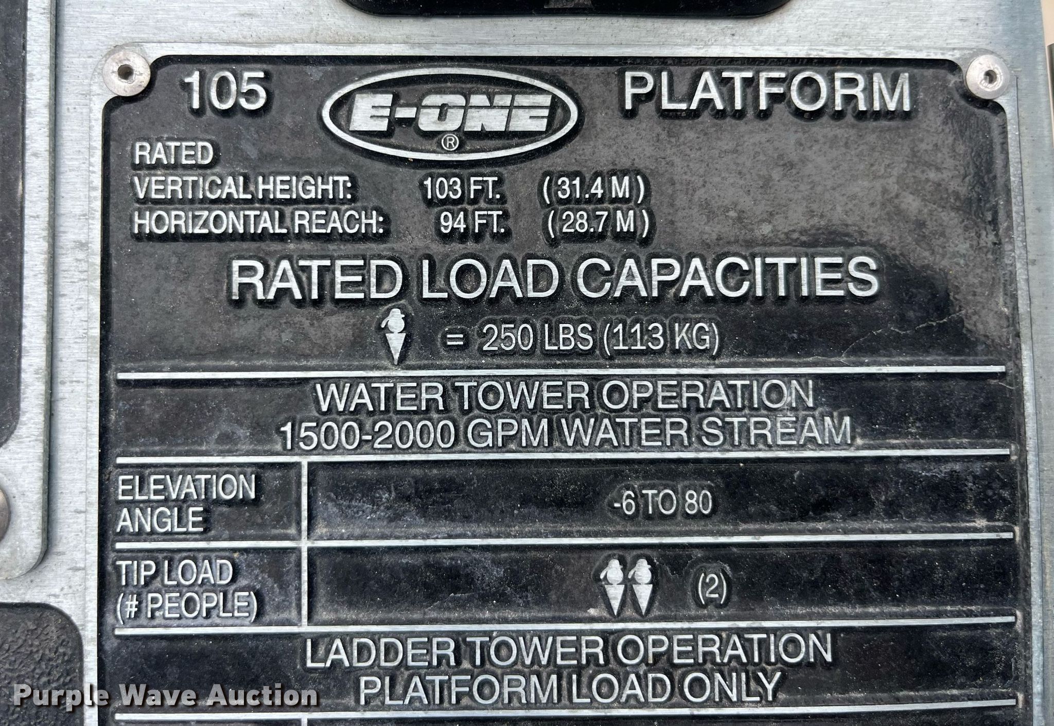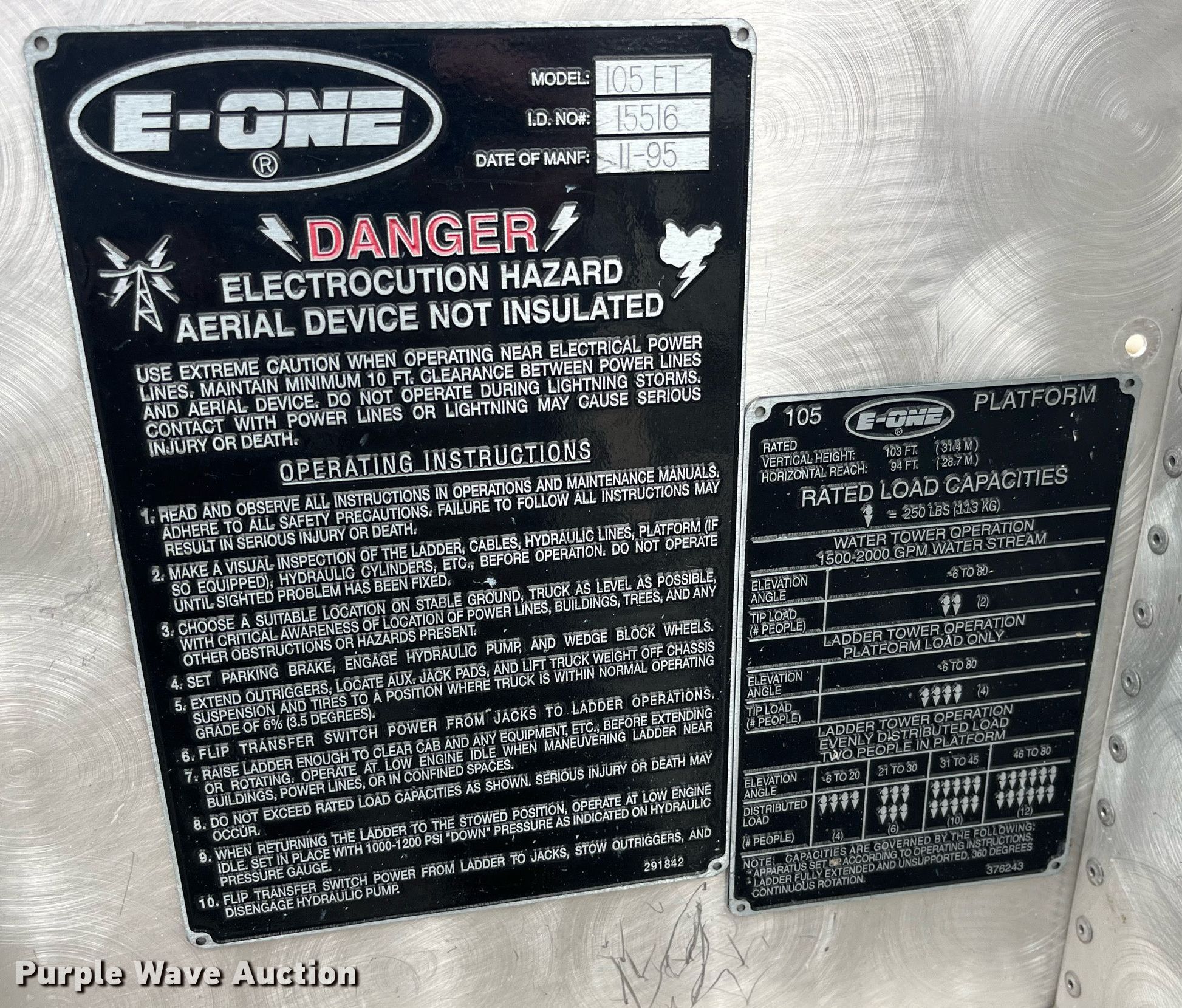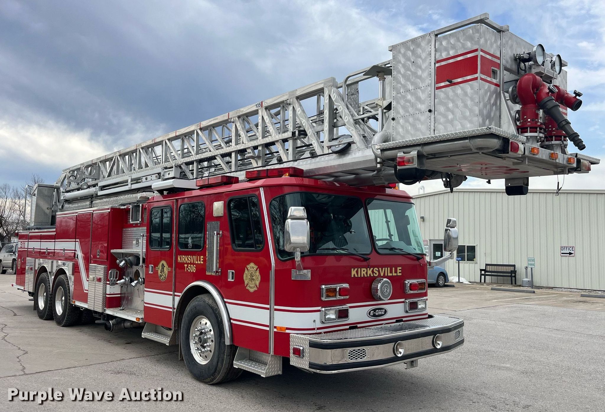 1995 E-One fire truck. Miles: 25,838 on odometer, Hours: 195 on meter Actual hours: Unknown, VIN: 4ENDABA871005516. Engine Displacement: 9.3L, Detroit Diesel, Cylinders: 8, Fuel type: Diesel. Transmission Allison, Automatic. Chassis Axles: Tandem, Suspension: Spring over walking beam, Differential lock: Inter-axle, Brakes: Air, GVWR: 73,000 lbs. Interior AC, Heat, Heated mirrors, Auxiliary controls. Features Fire truck body Aerial E-ONE 105FT, Maximum height: 103', Maximum lift capacity: 250 lbs, Stabilizers Quantity: 6, Elevated deck gun, Pump 1,761 gpm, Ground ladder, Generator, PA/ siren controls, Elevated deck gun GPM: 1500-2000. Tires Front: 425/65R22.5, Rear: 12R22.5. Notes Hour meter replaced, CB radio and speaker not included, Engine issues, oil leak, Non-operational AC, Non-operational window defrost. Missouri title. Seller is a government entity who will be assigning and distributing the title. Please contact the seller for distribution questions. Title distribution may be delayed up to 14 days from verification of funds. City of Kirksville. 2001 N Osteopathy. Kirksville, MO 63501
