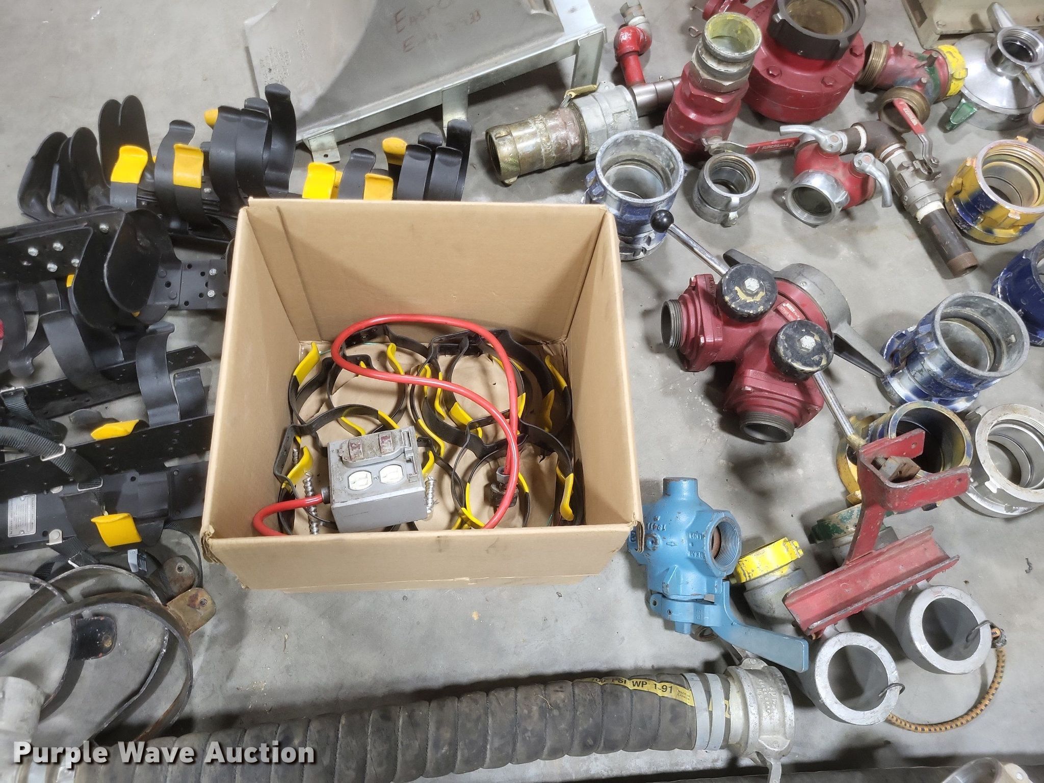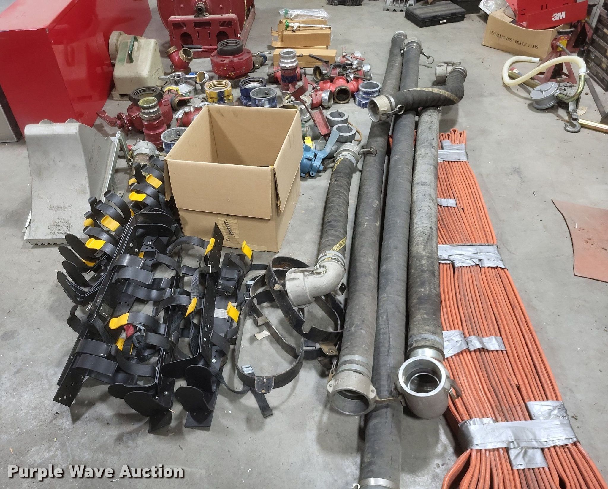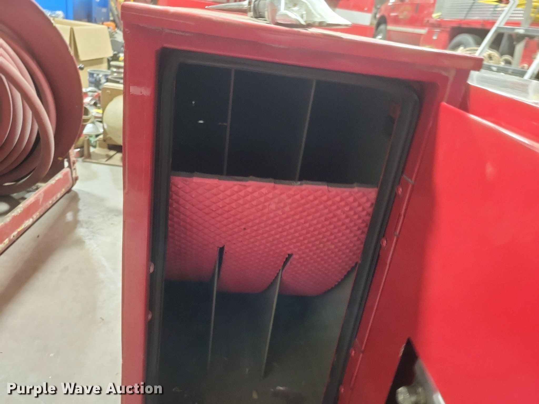 Purple Wave is selling a used Tools in Missouri. This item is a Fire fighting equipment with the following: (2) utility boxes, Hose reel with 1" hose, Fire hose fittings of assorted sizes, Approx. 8 air tank brackets, Approx. 5 hard hoses, Approx. 50' of 1.5" fire hose, Fittings not included, Approx. 6 freeze proof spickets
