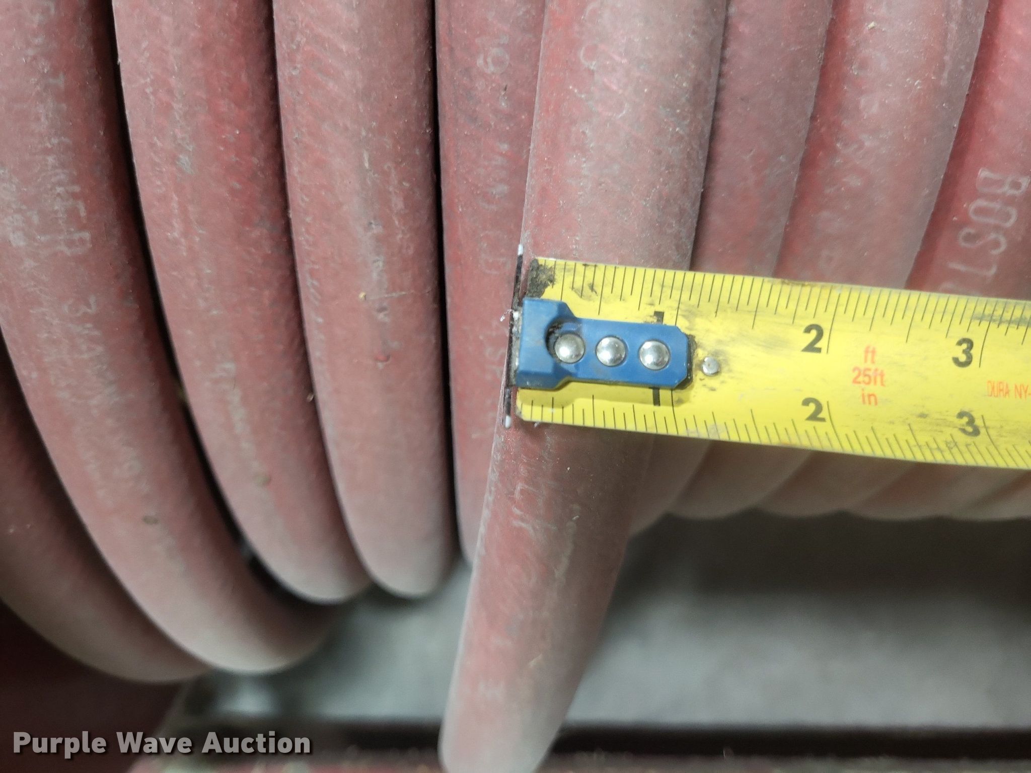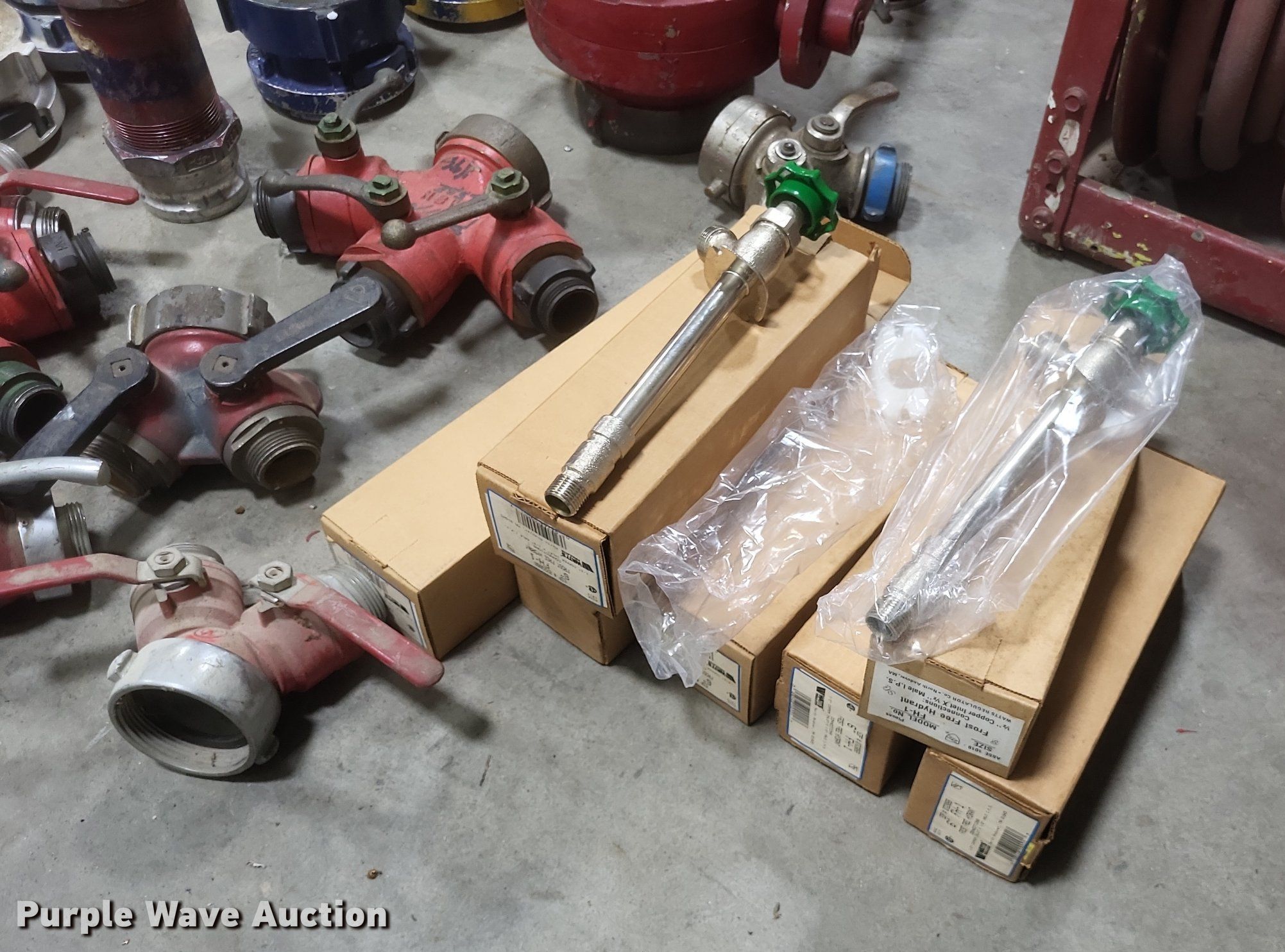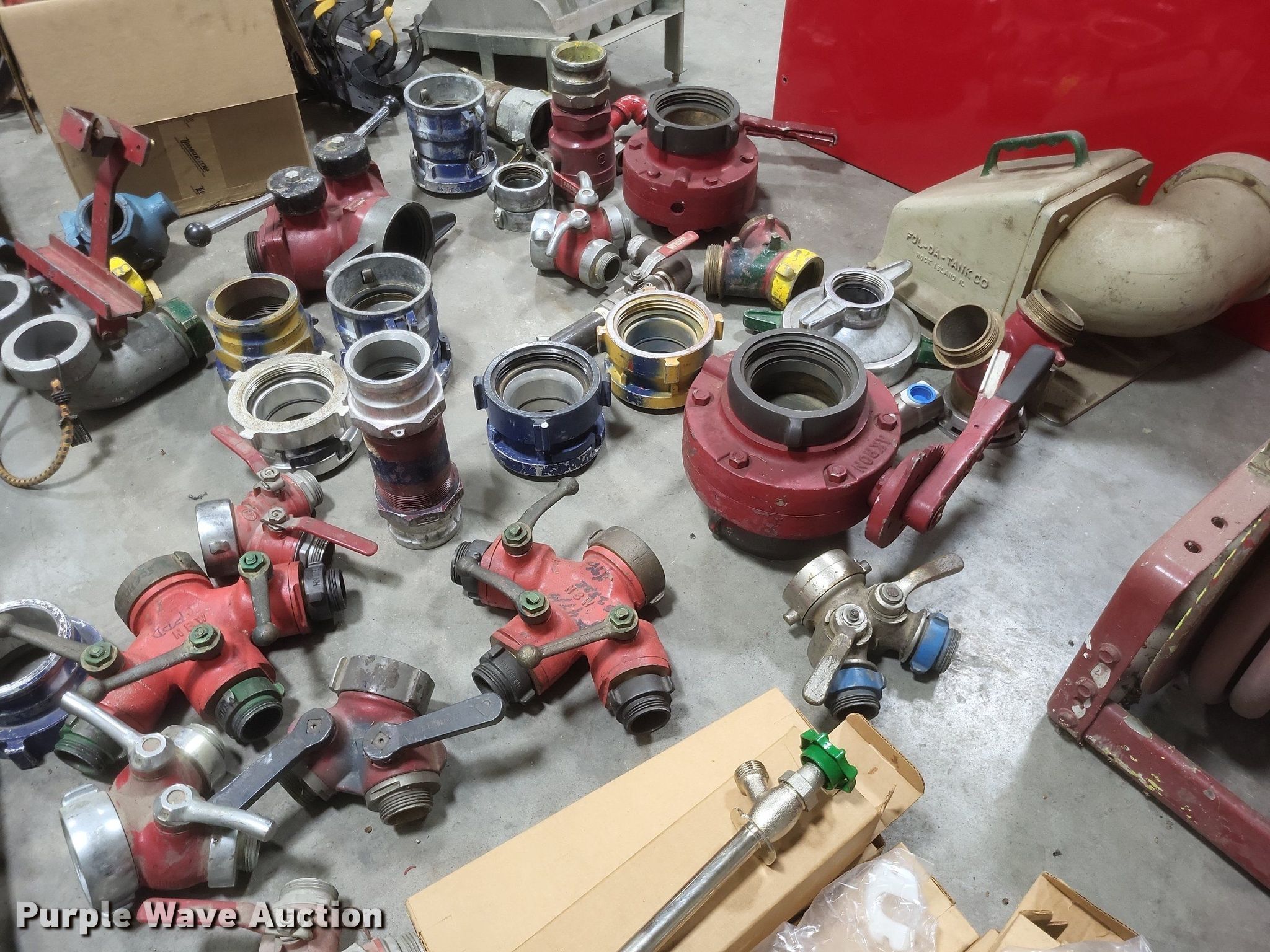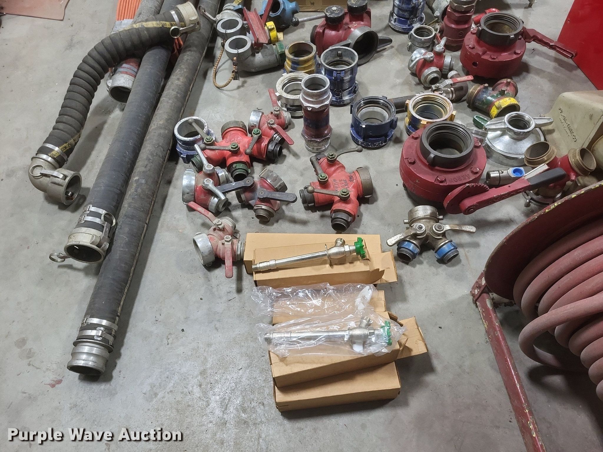 Purple Wave is selling a used Tools in Missouri. This item is a Fire fighting equipment with the following: (2) utility boxes, Hose reel with 1" hose, Fire hose fittings of assorted sizes, Approx. 8 air tank brackets, Approx. 5 hard hoses, Approx. 50' of 1.5" fire hose, Fittings not included, Approx. 6 freeze proof spickets