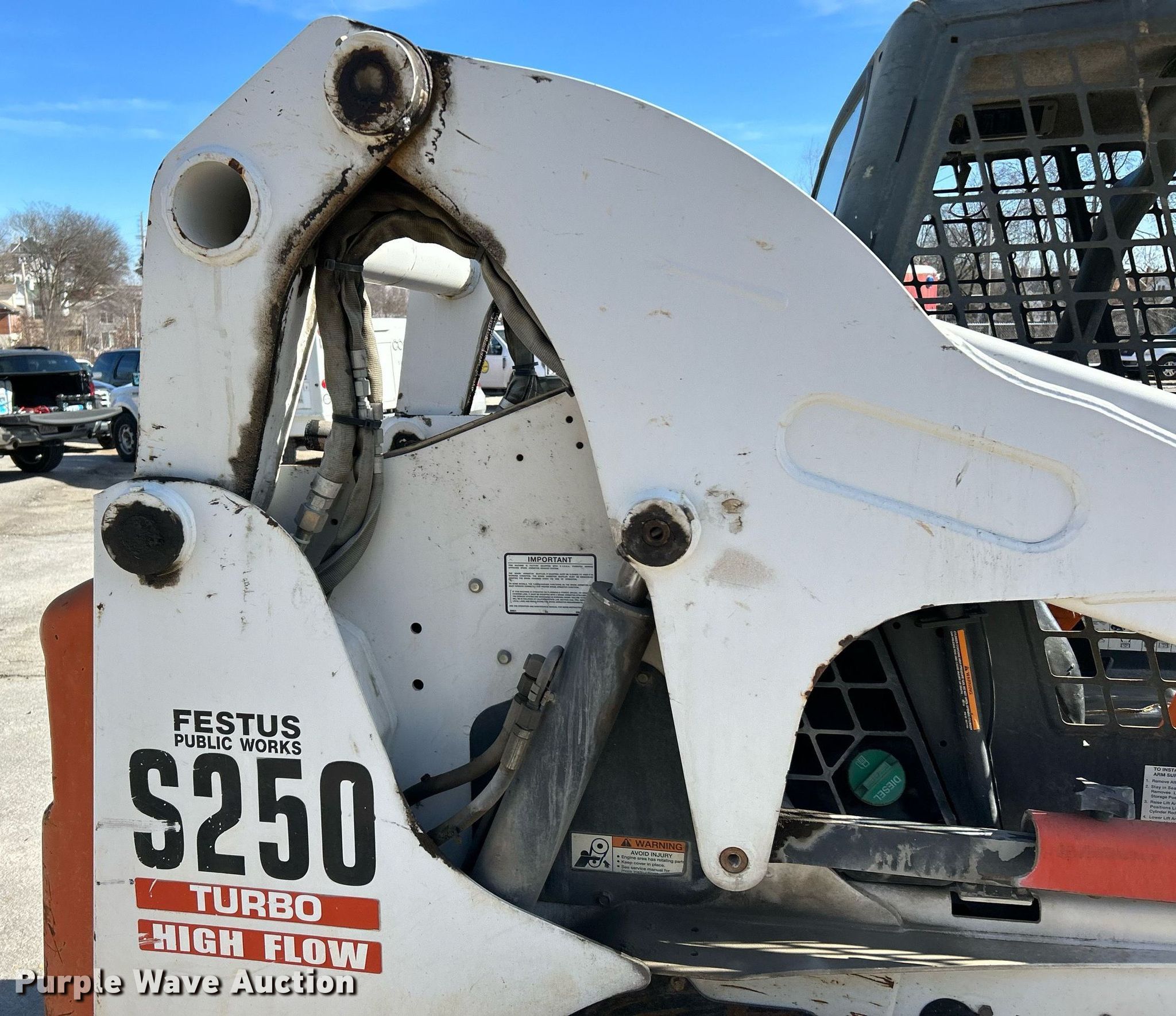 2003 Bobcat S250 skid steer loader. Hours: 1,448 on meter, Serial: 521315233. Engine Kubota, Displacement: 203 C.I.D, Cylinders: 4, Fuel type: Diesel, HP: 75. Transmission Hydrostatic, Two speed travel. Operators station OROPS, Bucket control: Foot. Features Auxiliary hydraulics, Auxiliary electrical outlet, Quick coupler: Hydraulic. Tires Front: 12-16.5. Tracks Width: 15". Notes Tracks included, Bucket and forks not included, Dead battery. City of Festus, MO. Festus, MO 63028