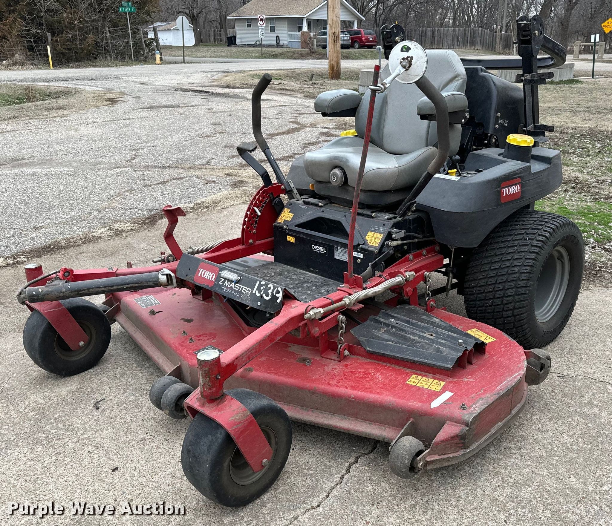 Toro Z Master 74274 ZTR lawn mower. Hours: 2,047 on meter, Cutting width: 72", Serial: 315000198, Unit #: 1339. Engine Kubota D902-EF01, Displacement: 0.898L, Cylinders: 3, Fuel type: Diesel. Transmission Hydrostatic. Operators station OROPS. Tires Front: 13x6.50-6, Rear: 24x12.00-12. Notes PTO clutch issues. City of Salina, KS. Salina, KS 67401