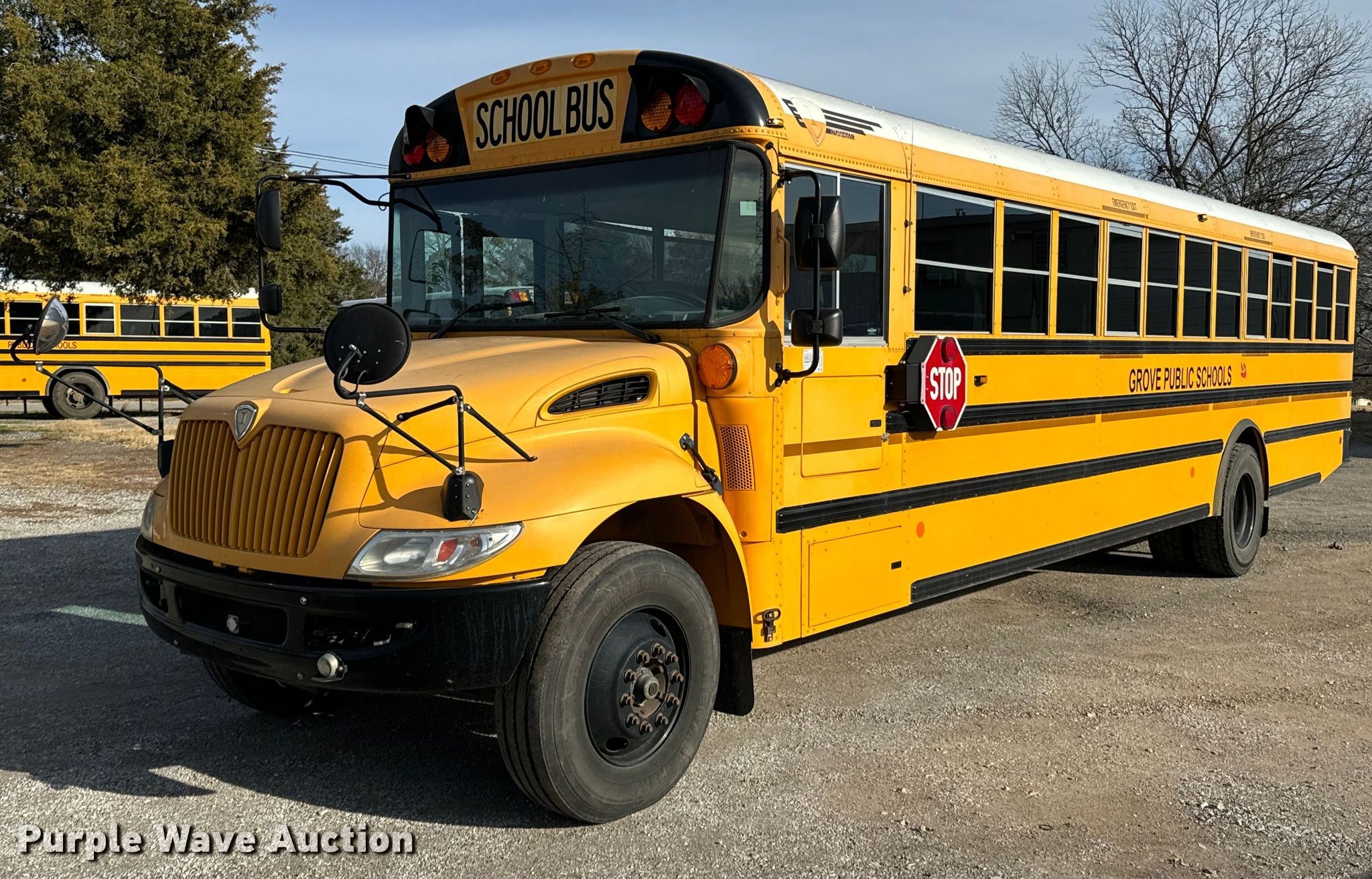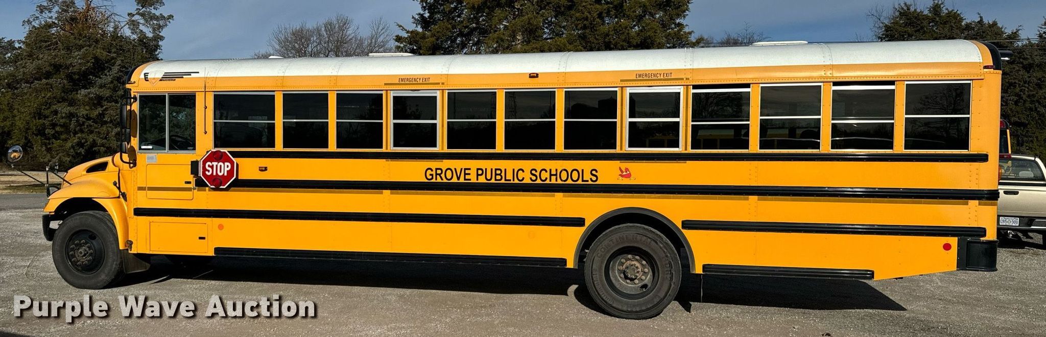 2015 International CE school bus. Miles: 42,470 on odometer, VIN: 4DRBUSKP6FB027778. Engine International Maxxforce 7, Displacement: 6.4L, Cylinders: 8, Fuel type: Diesel. Transmission Automatic. Chassis Axles: Single, Suspension: Spring, Brakes: Hydraulic, GVWR: 29,800 lbs. Interior Heat, Heated mirrors, Cruise control, Passengers: 47, Adult seats: 24. Tires Size: 11R22.5. Oklahoma title. Grove Public Schools. Grove, OK 74344